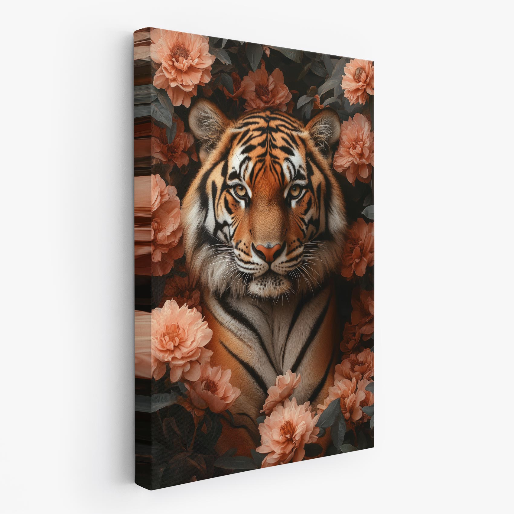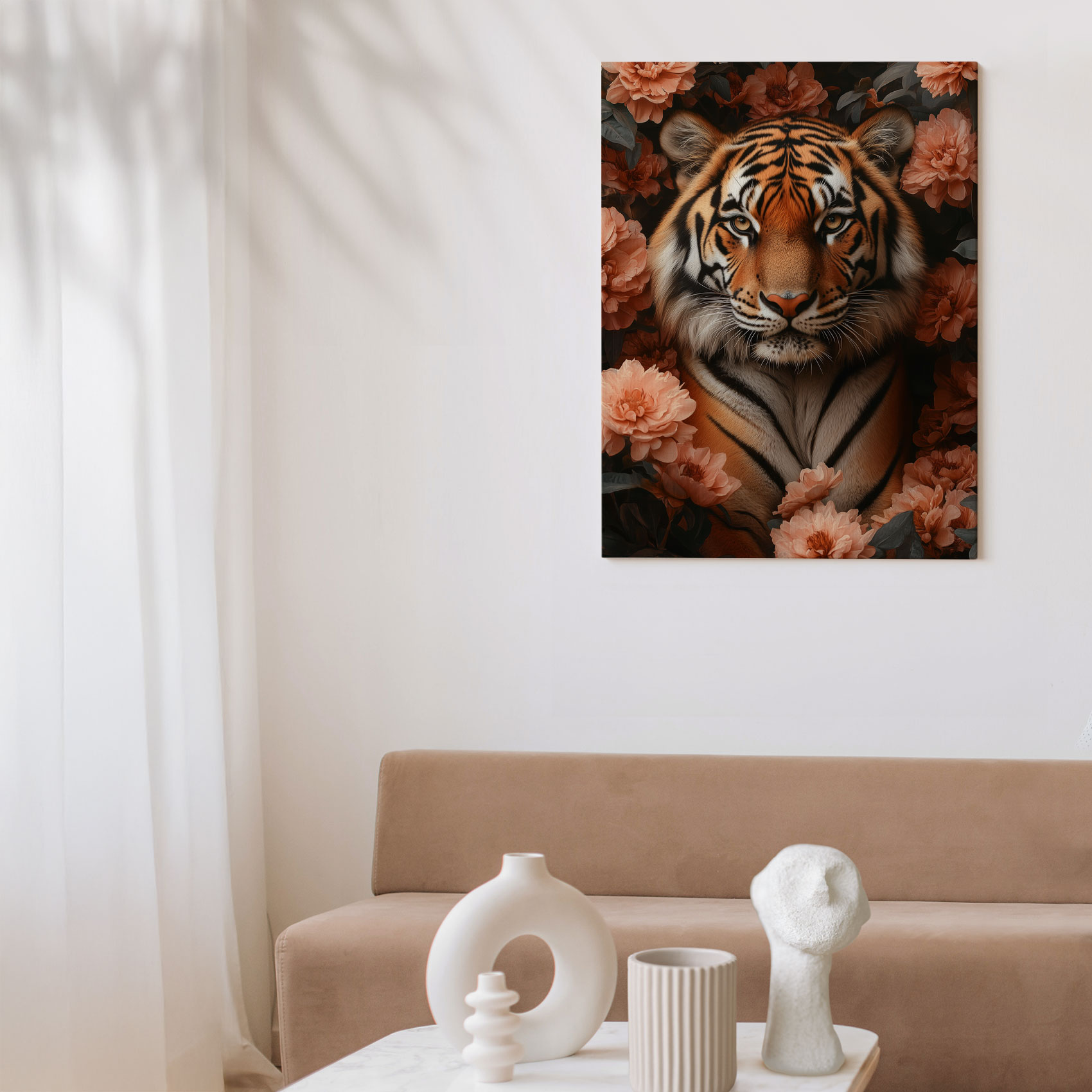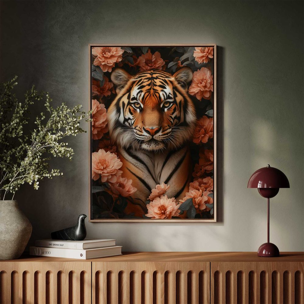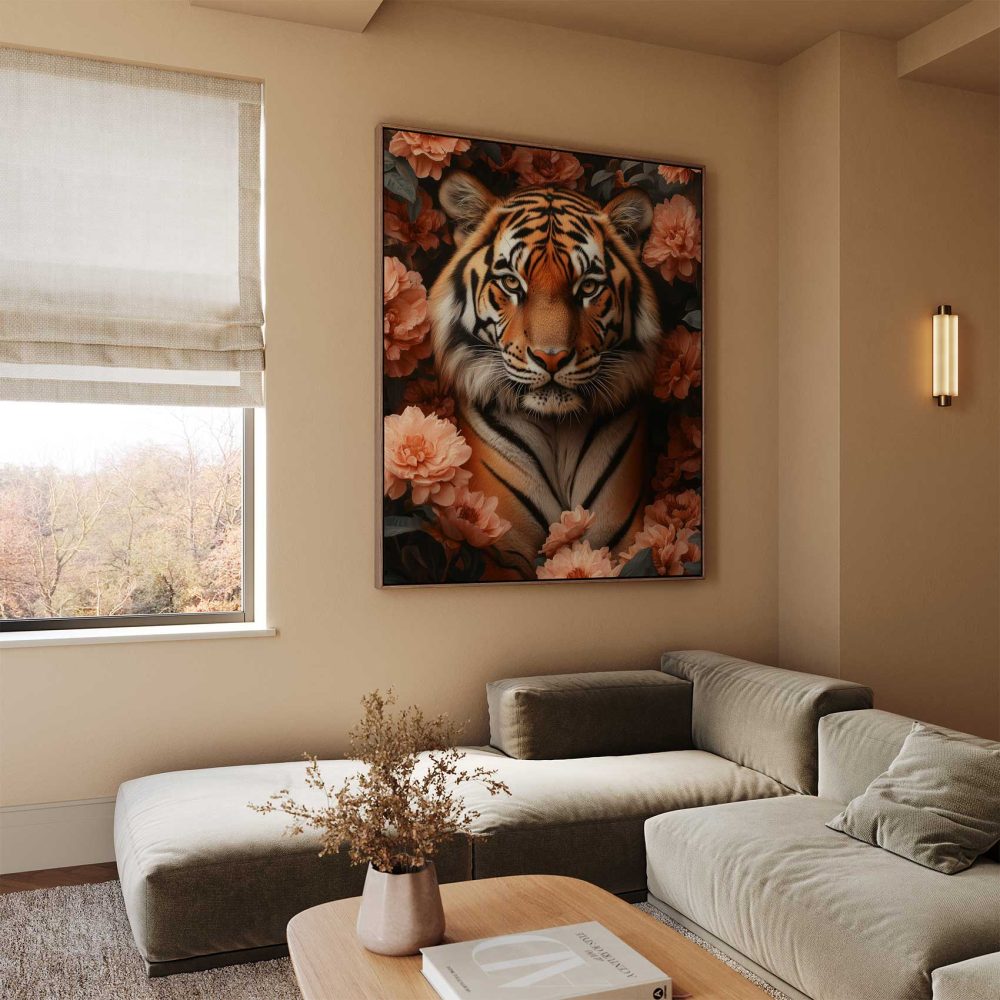 Terug naar collectie / Schilderijen / Bloemen Schilderij / Majestueuze tijger tussen roze bloemen