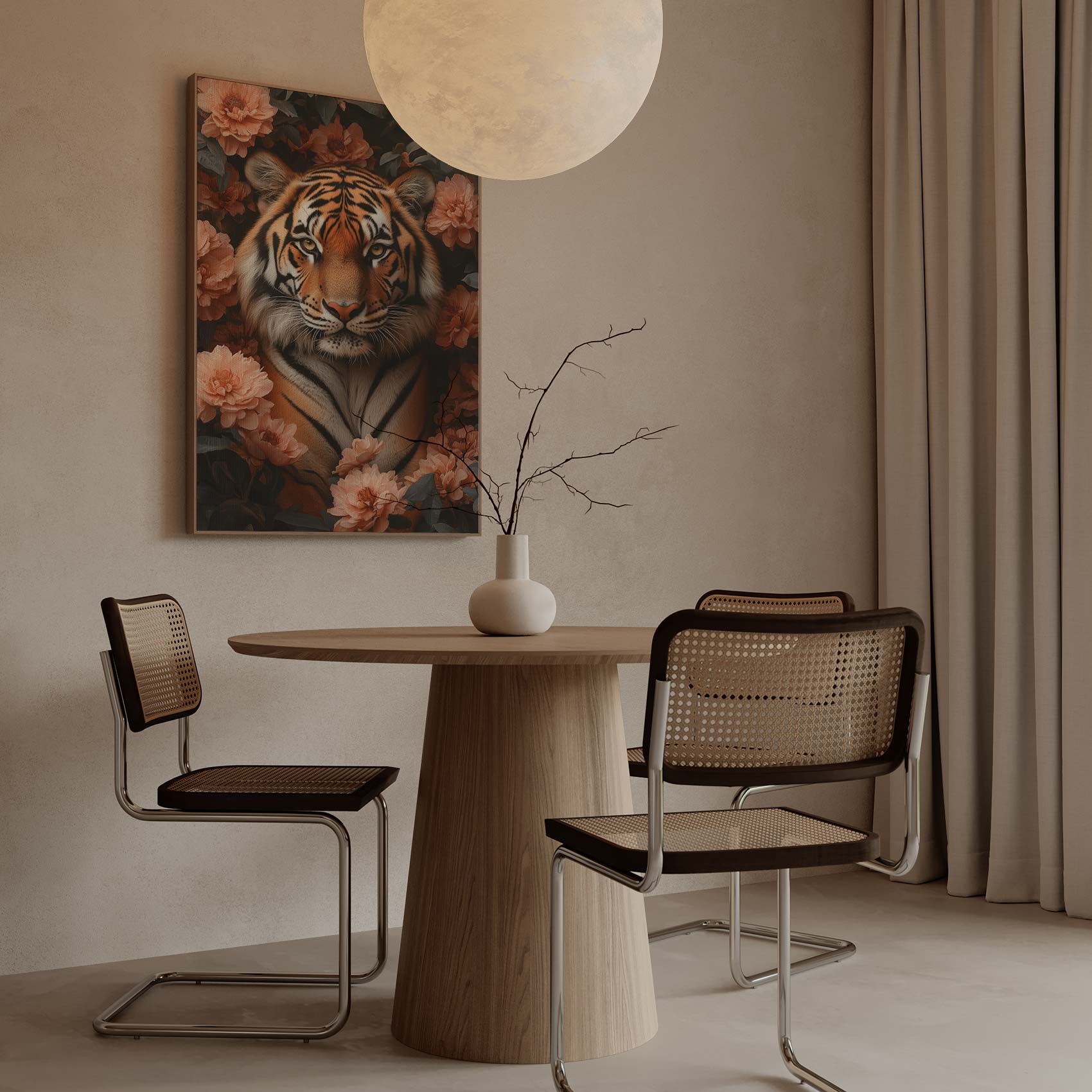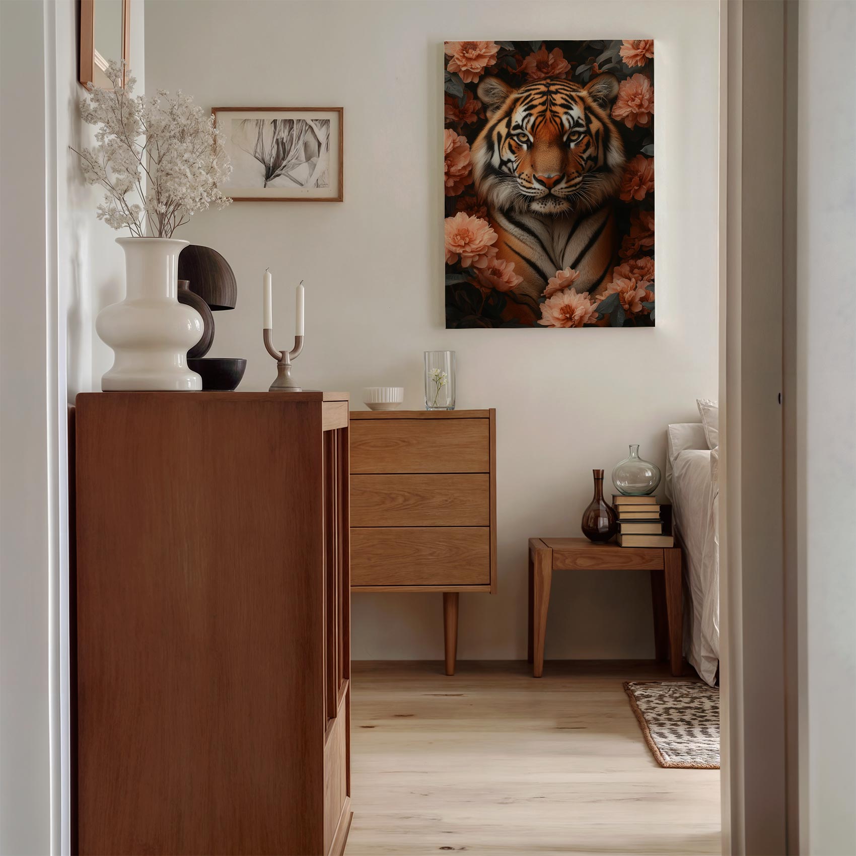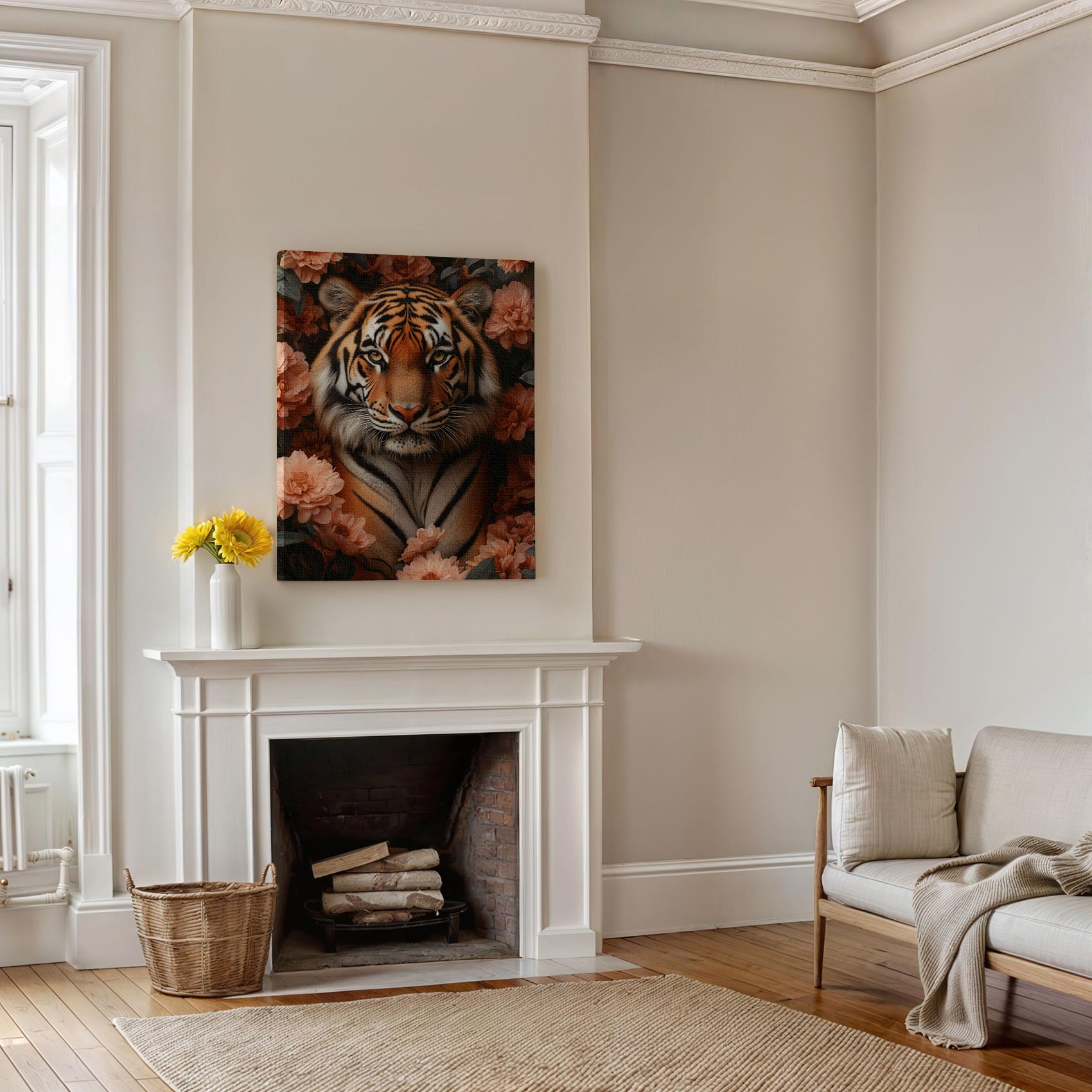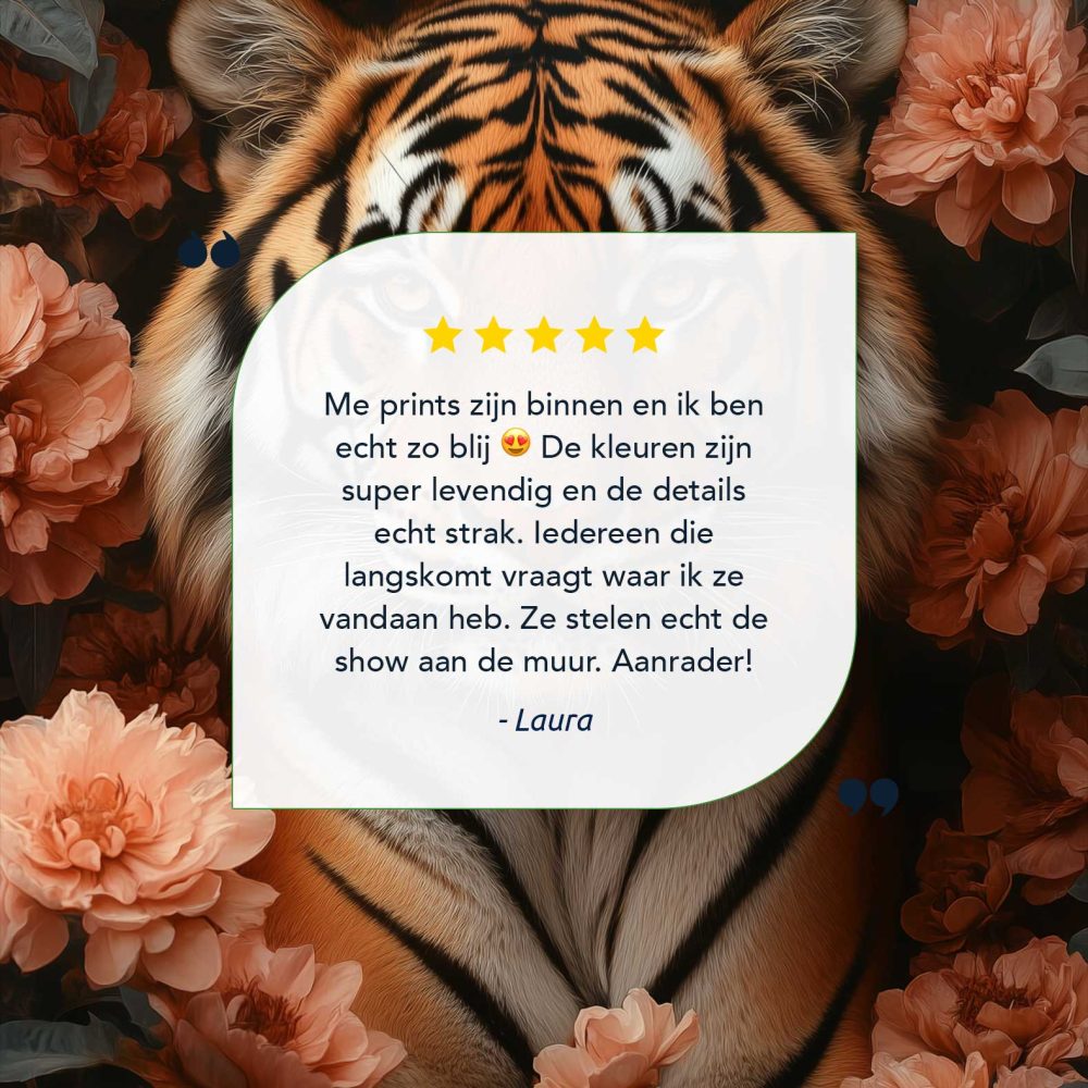 Terug naar collectie / Schilderijen / Bloemen Schilderij / Majestueuze tijger tussen roze bloemen