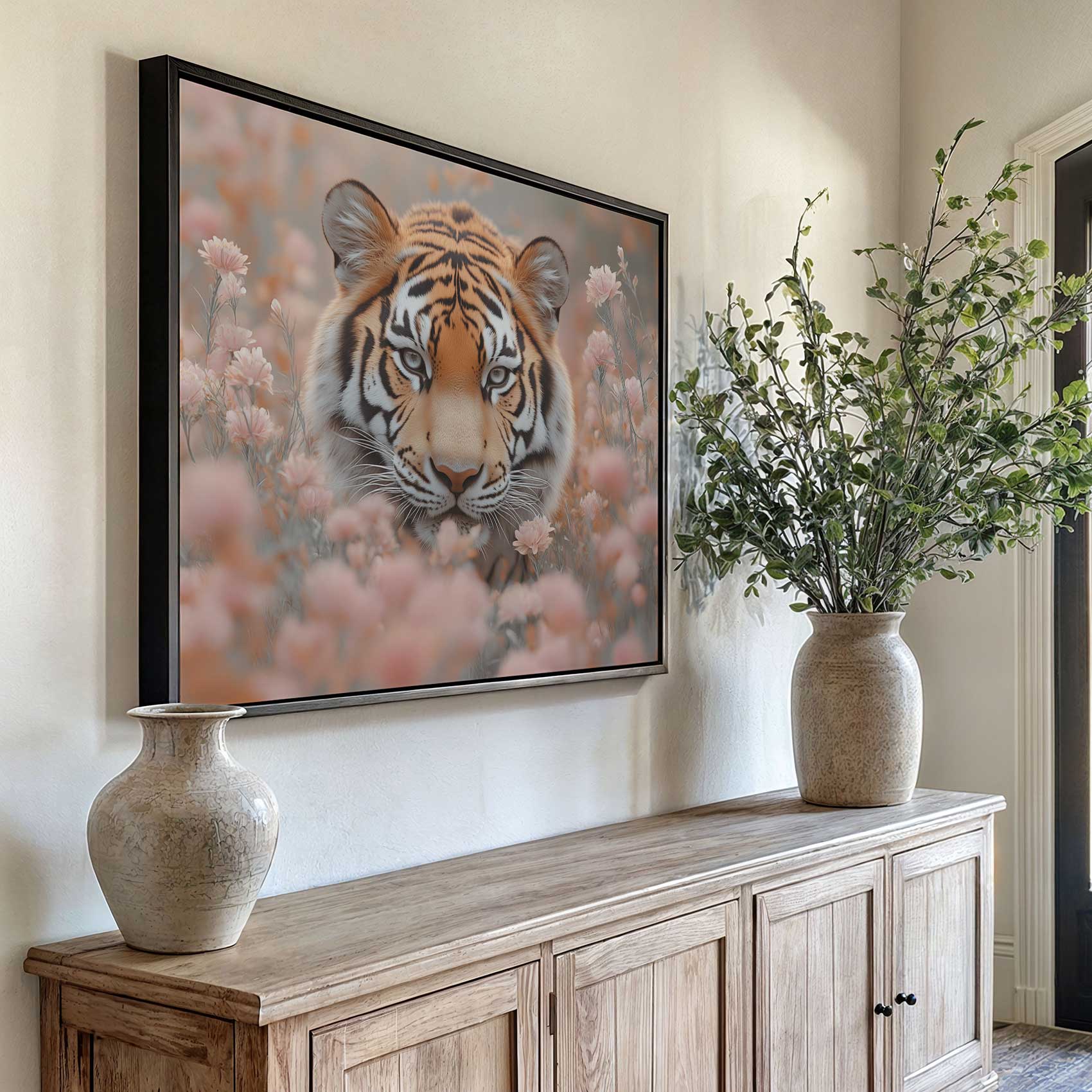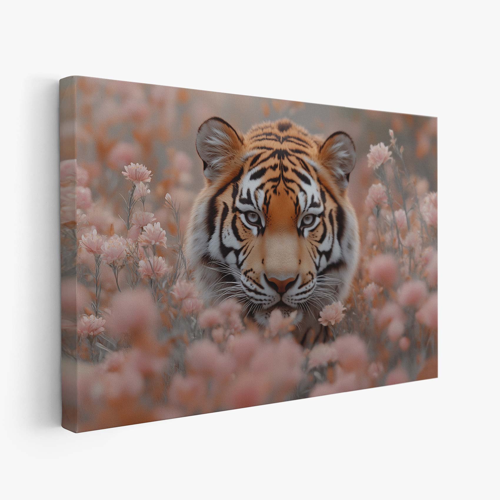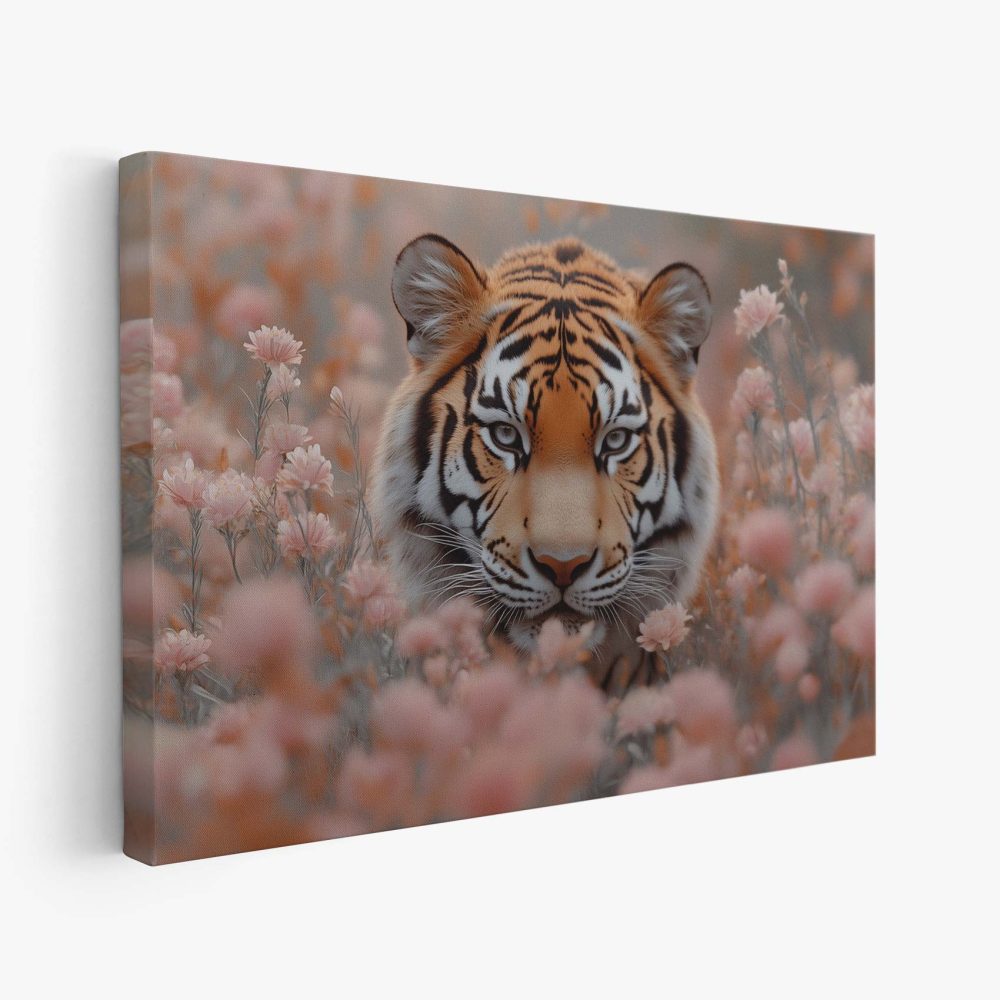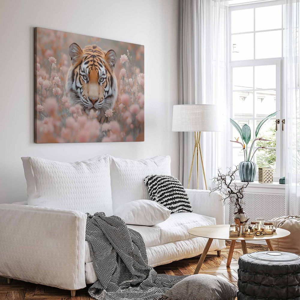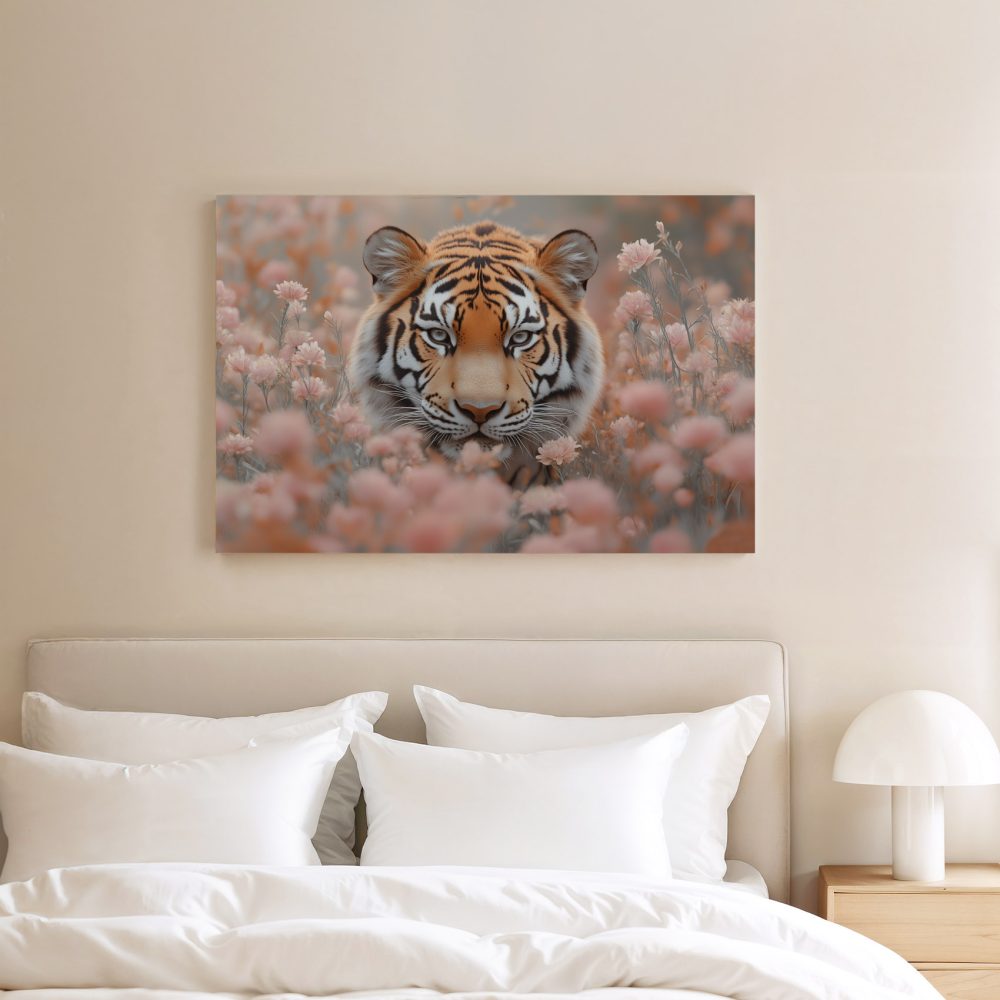 Terug naar collectie / Schilderijen / Bloemen Schilderij / Majestueuze tijger tussen roze bloemen