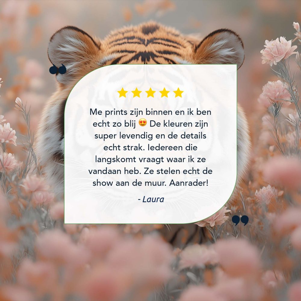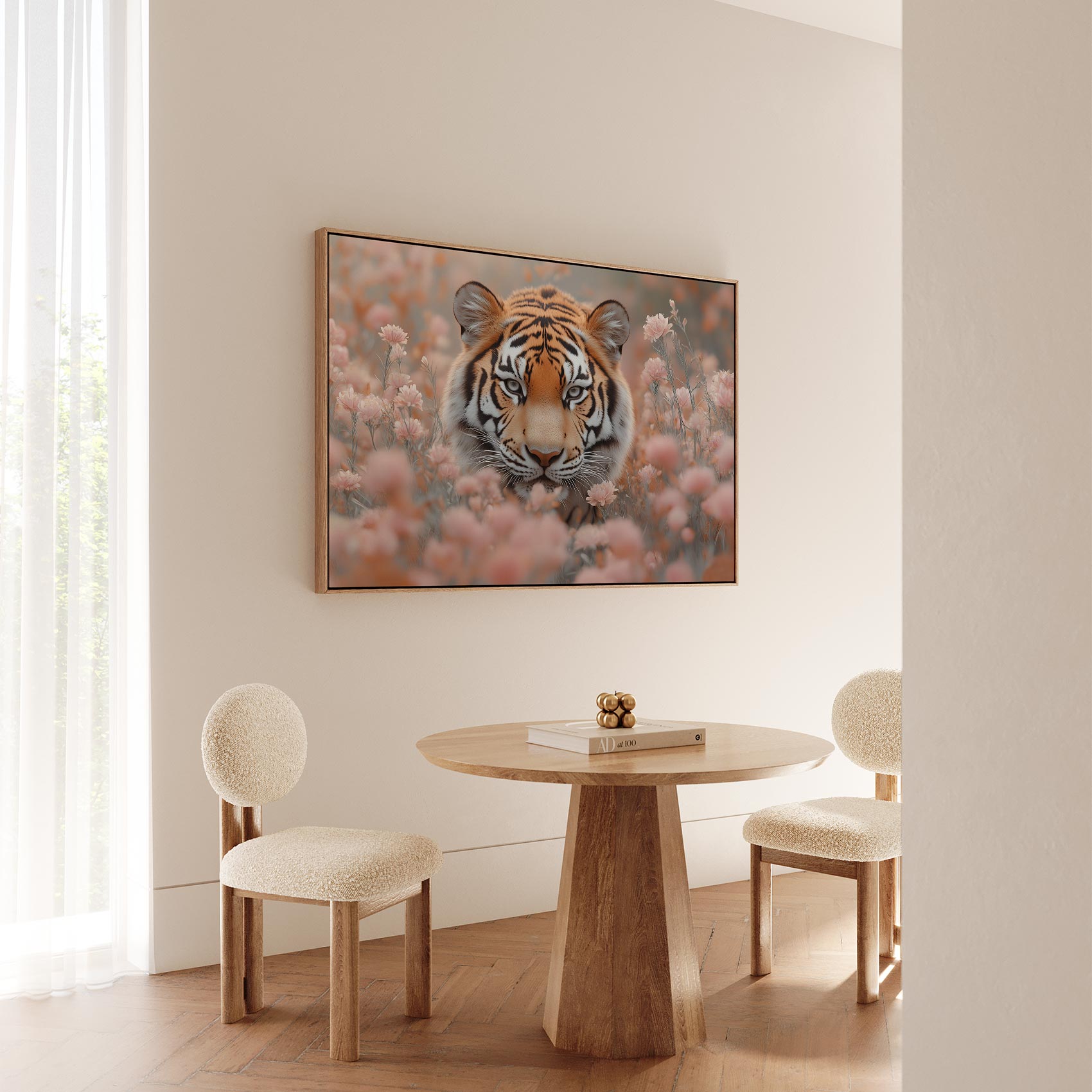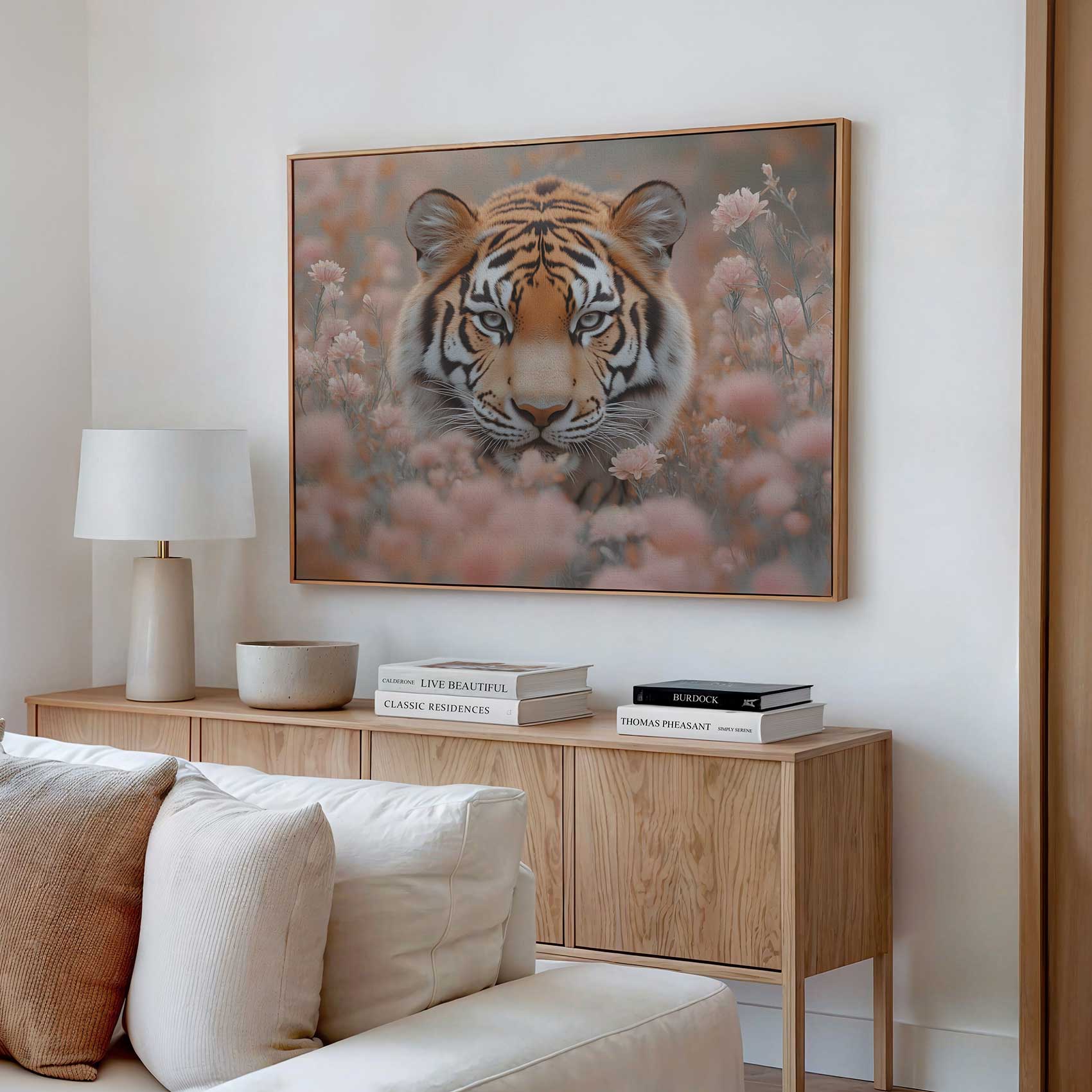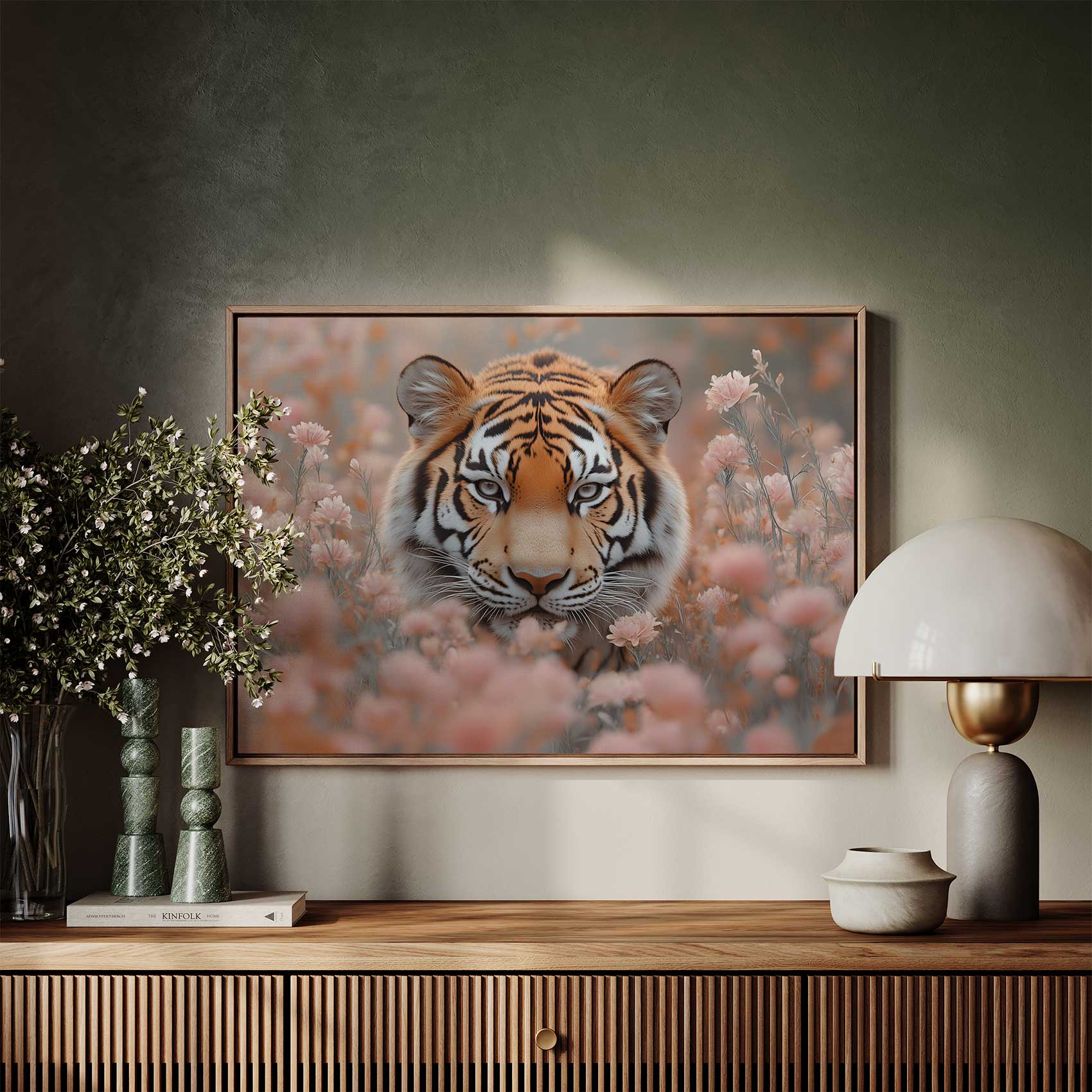 Terug naar collectie / Schilderijen / Bloemen Schilderij / Majestueuze tijger tussen roze bloemen