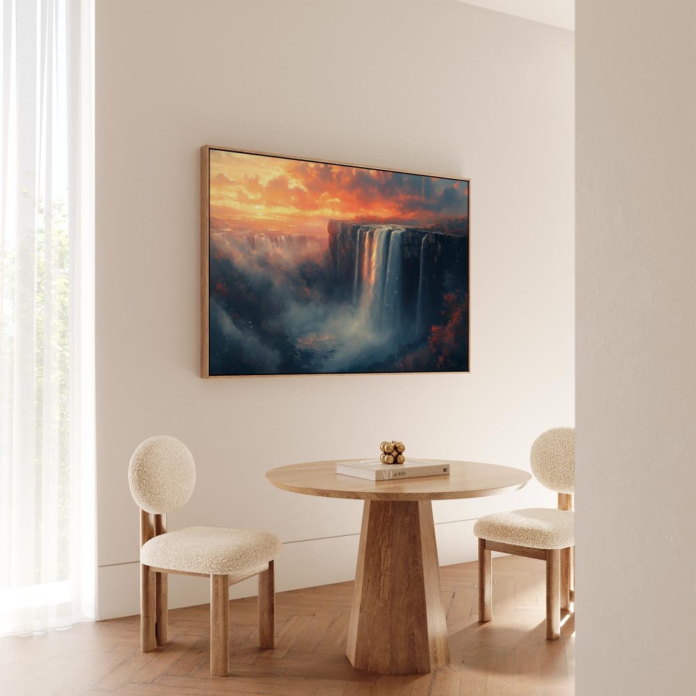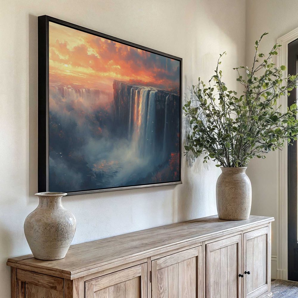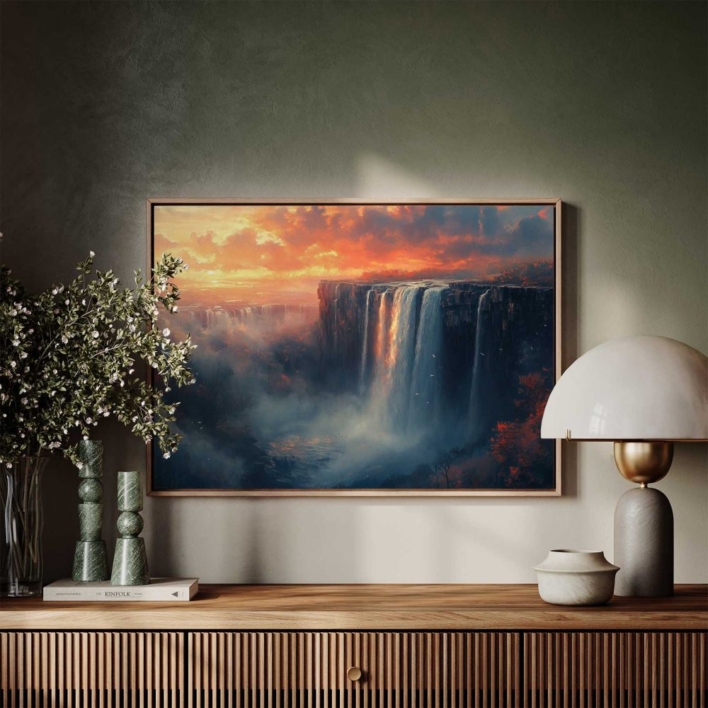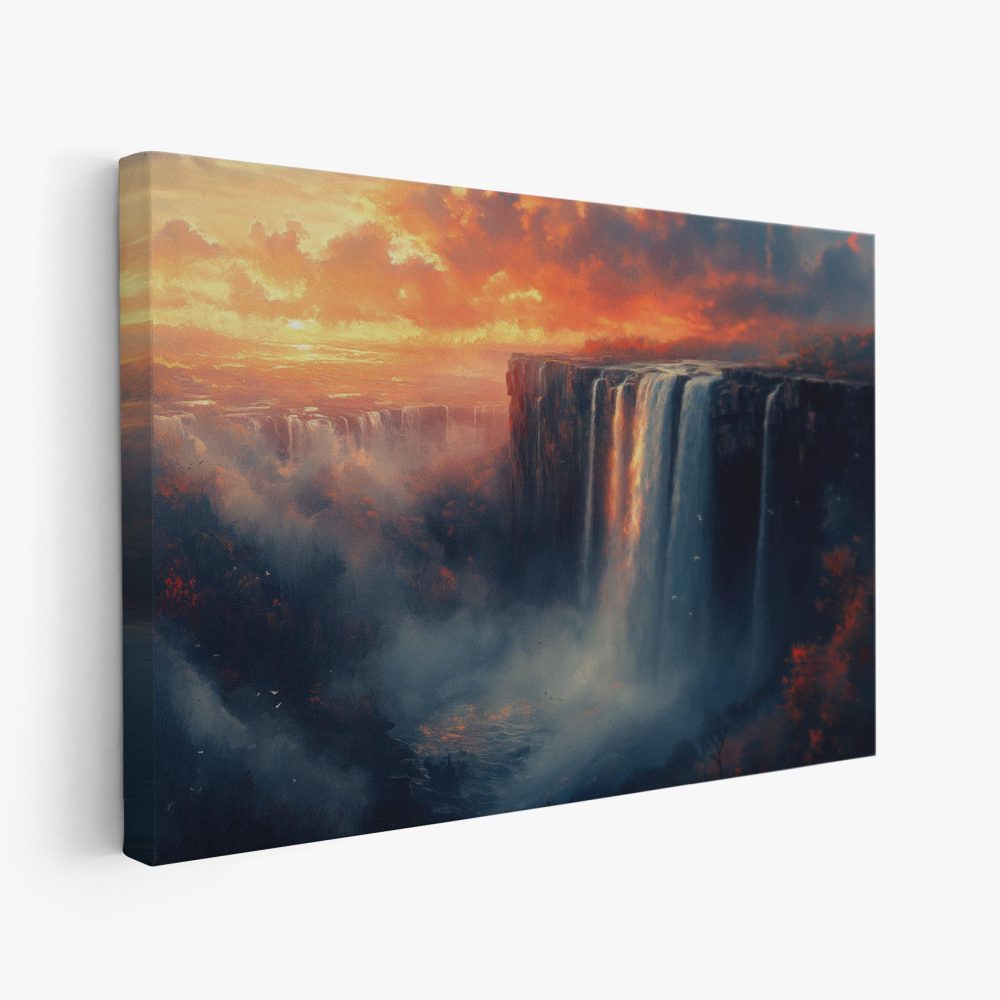 Terug naar collectie / Schilderijen / Bergen Schilderij / Majestueuze waterval zonsondergang