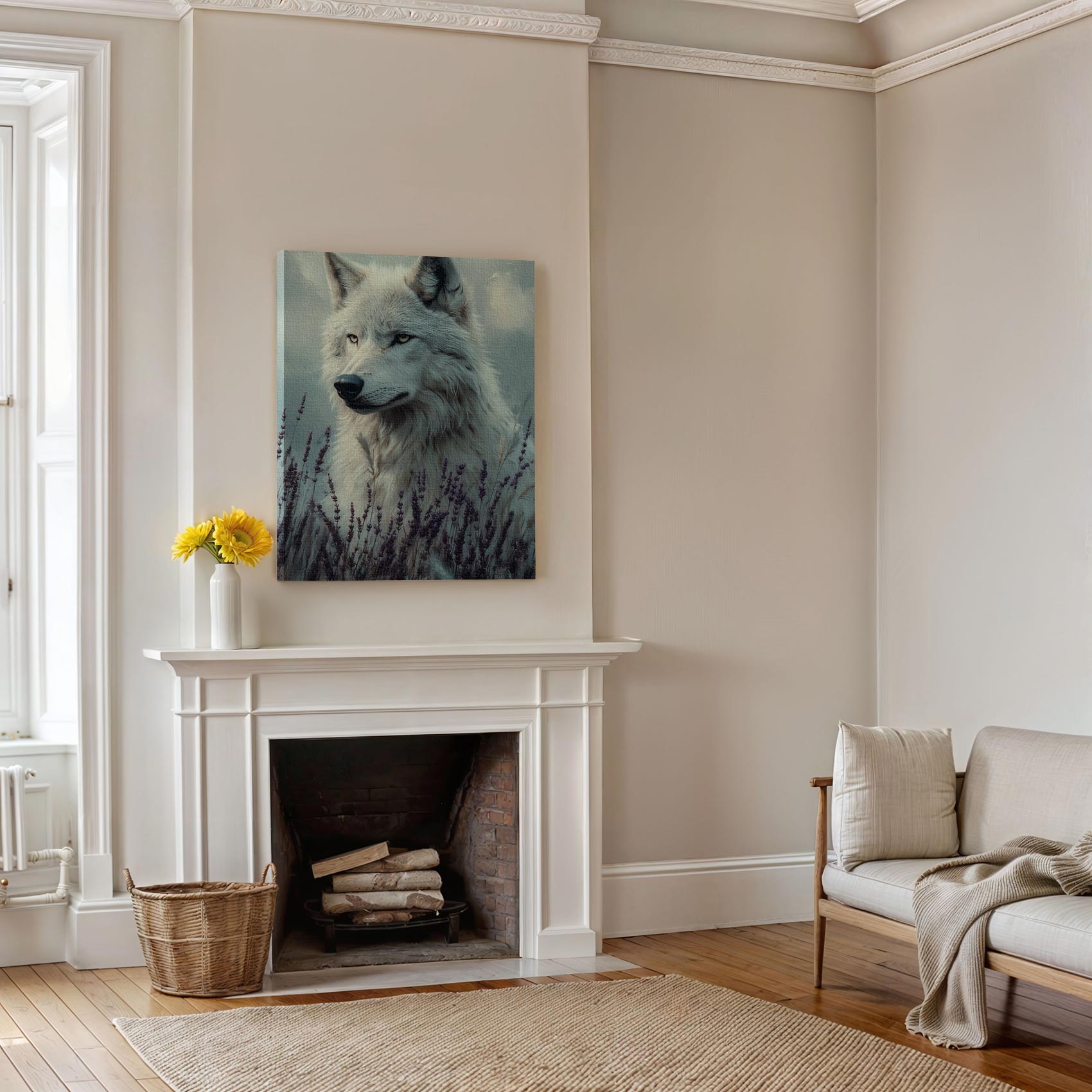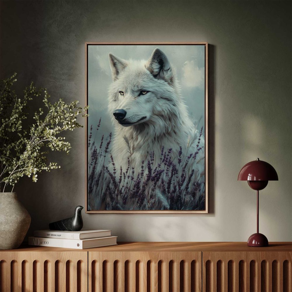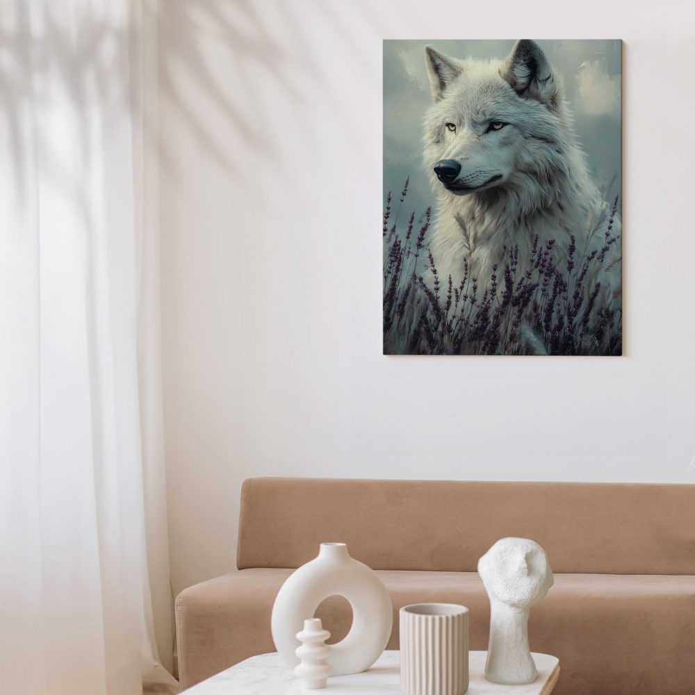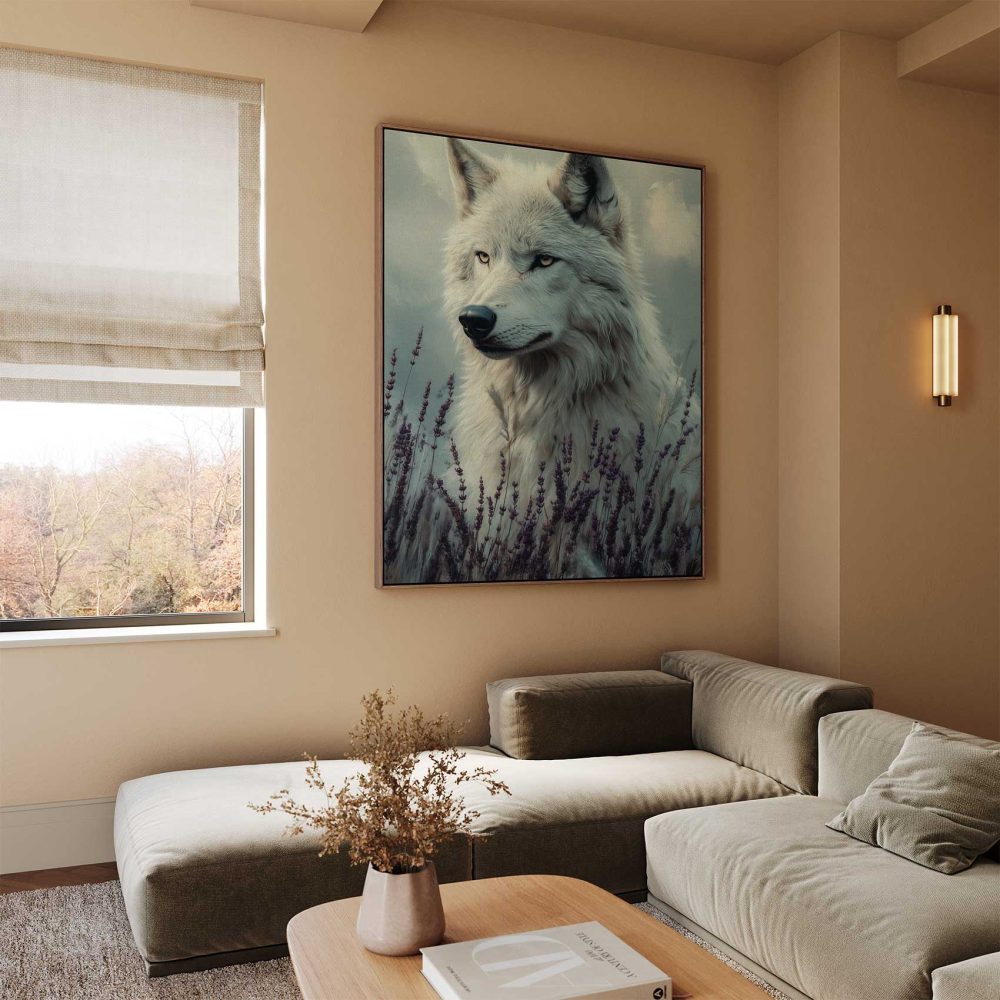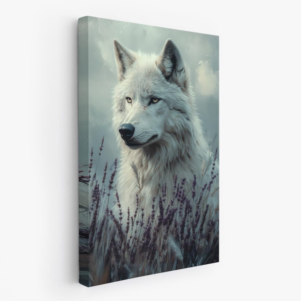 Terug naar collectie / Schilderijen / Bloemen Schilderij / Majestueuze witte wolf tussen paarse bloemen