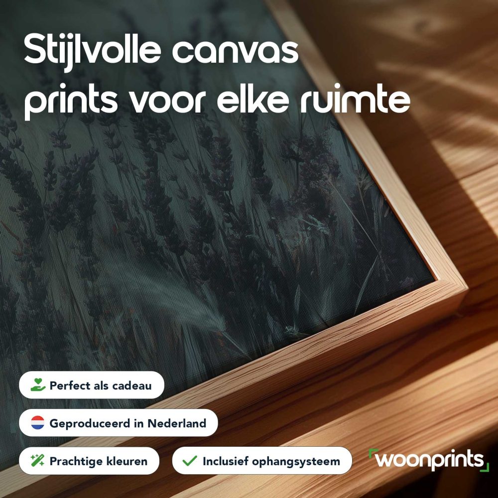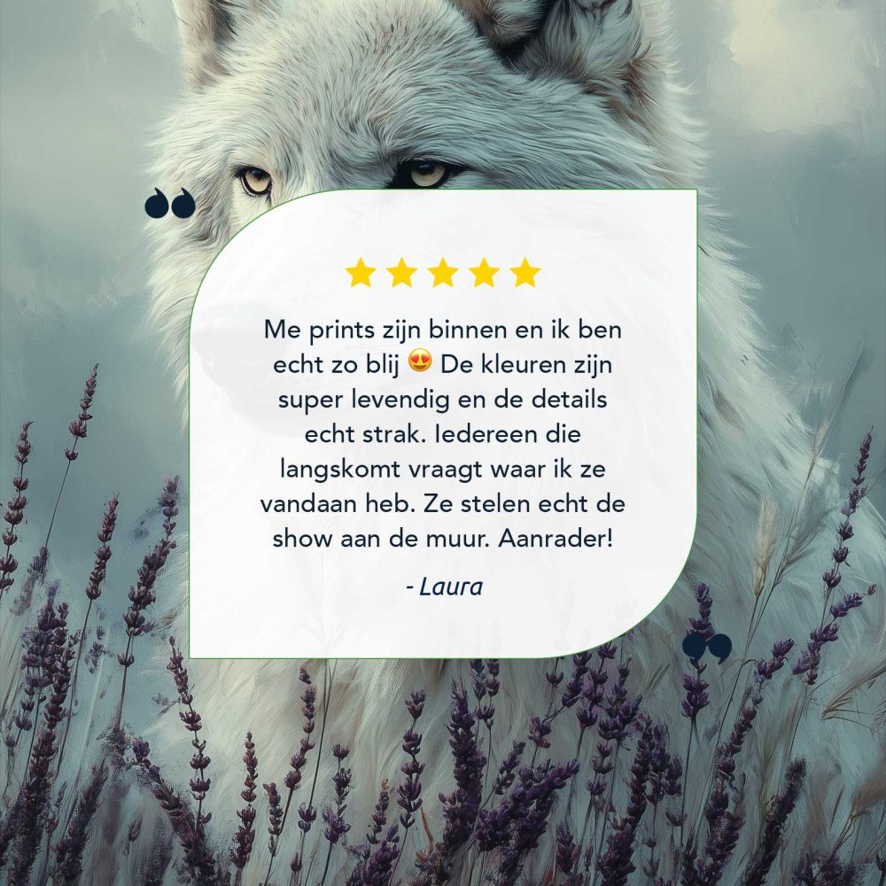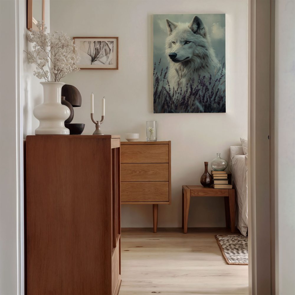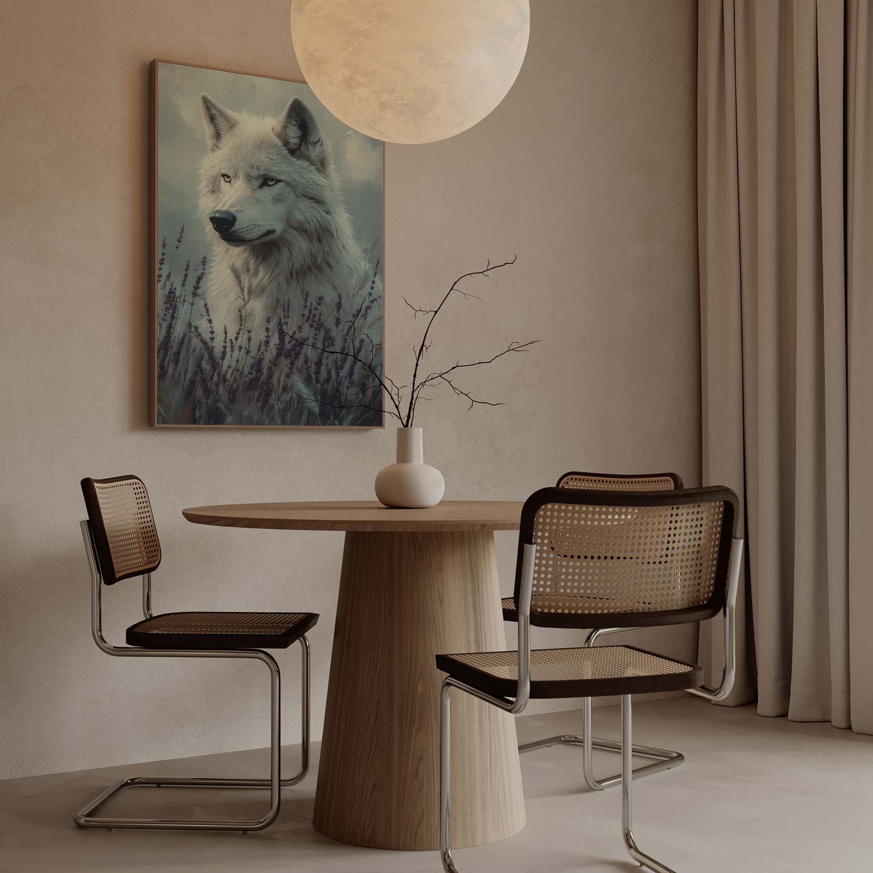 Terug naar collectie / Schilderijen / Bloemen Schilderij / Majestueuze witte wolf tussen paarse bloemen