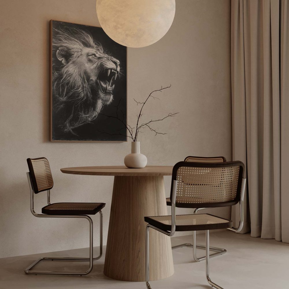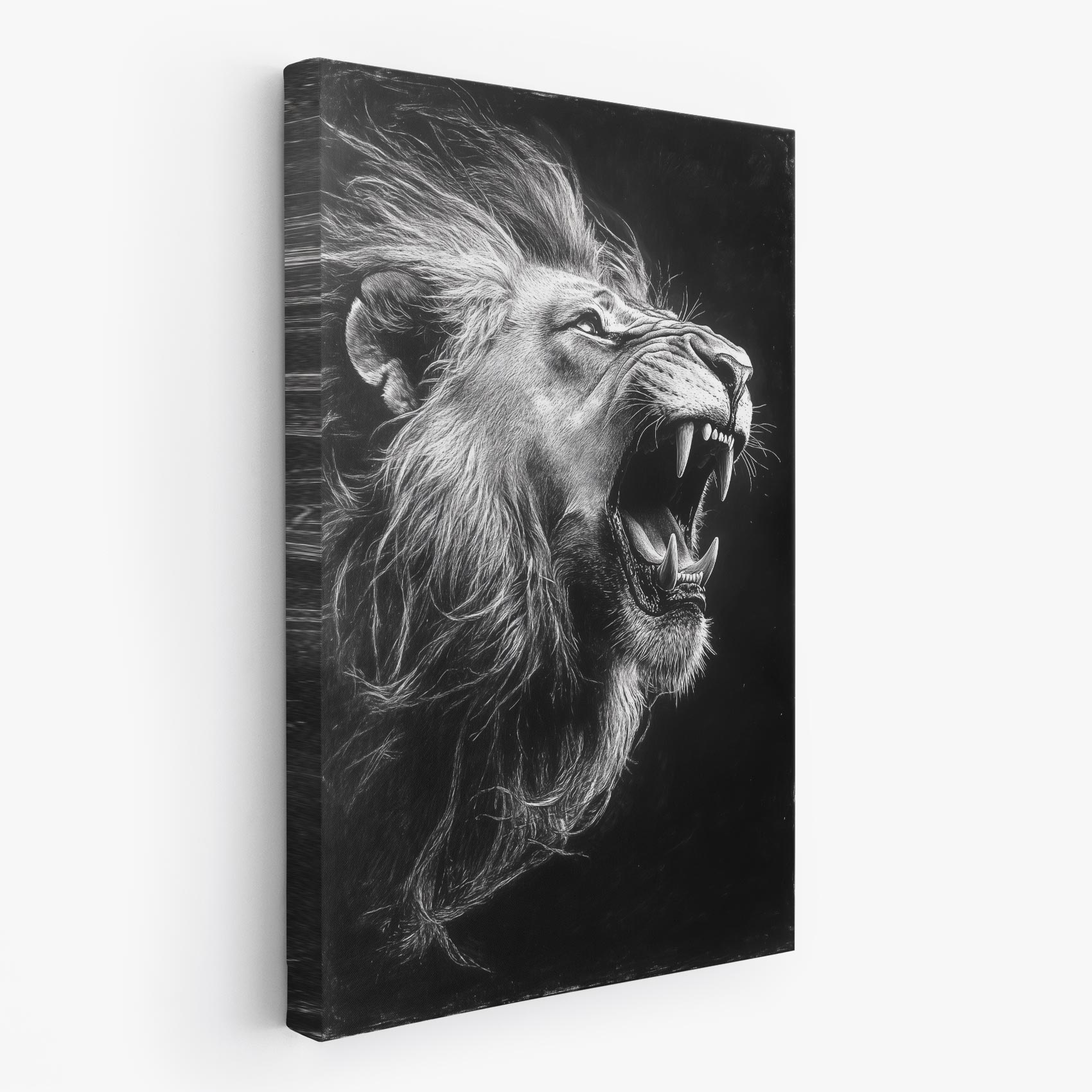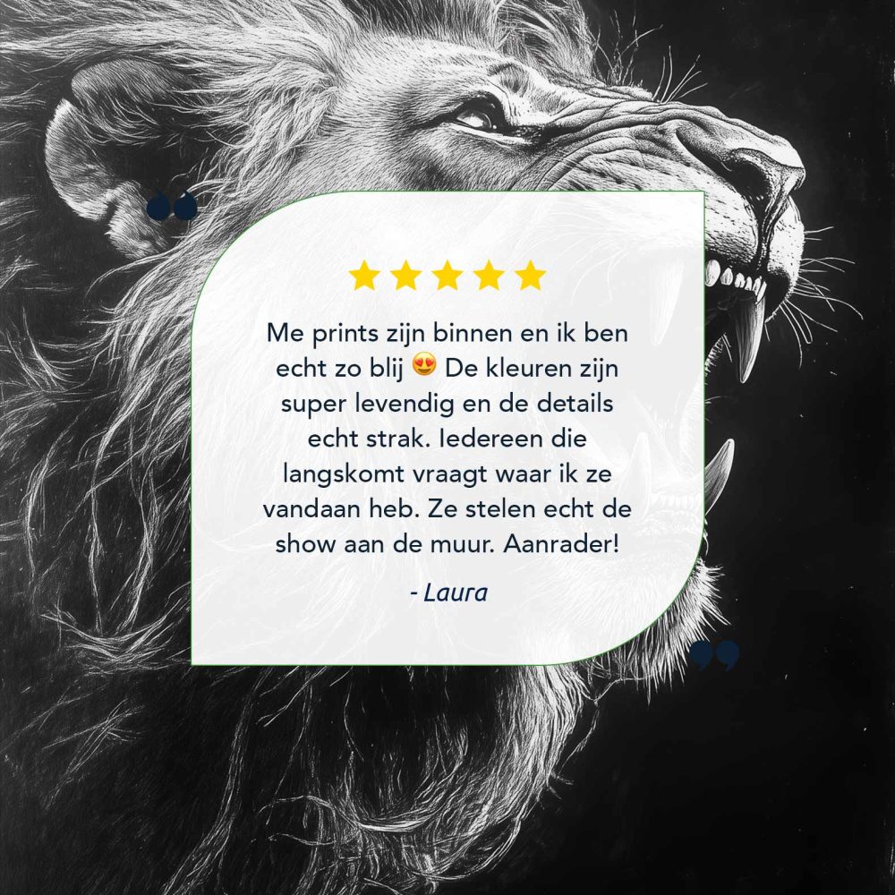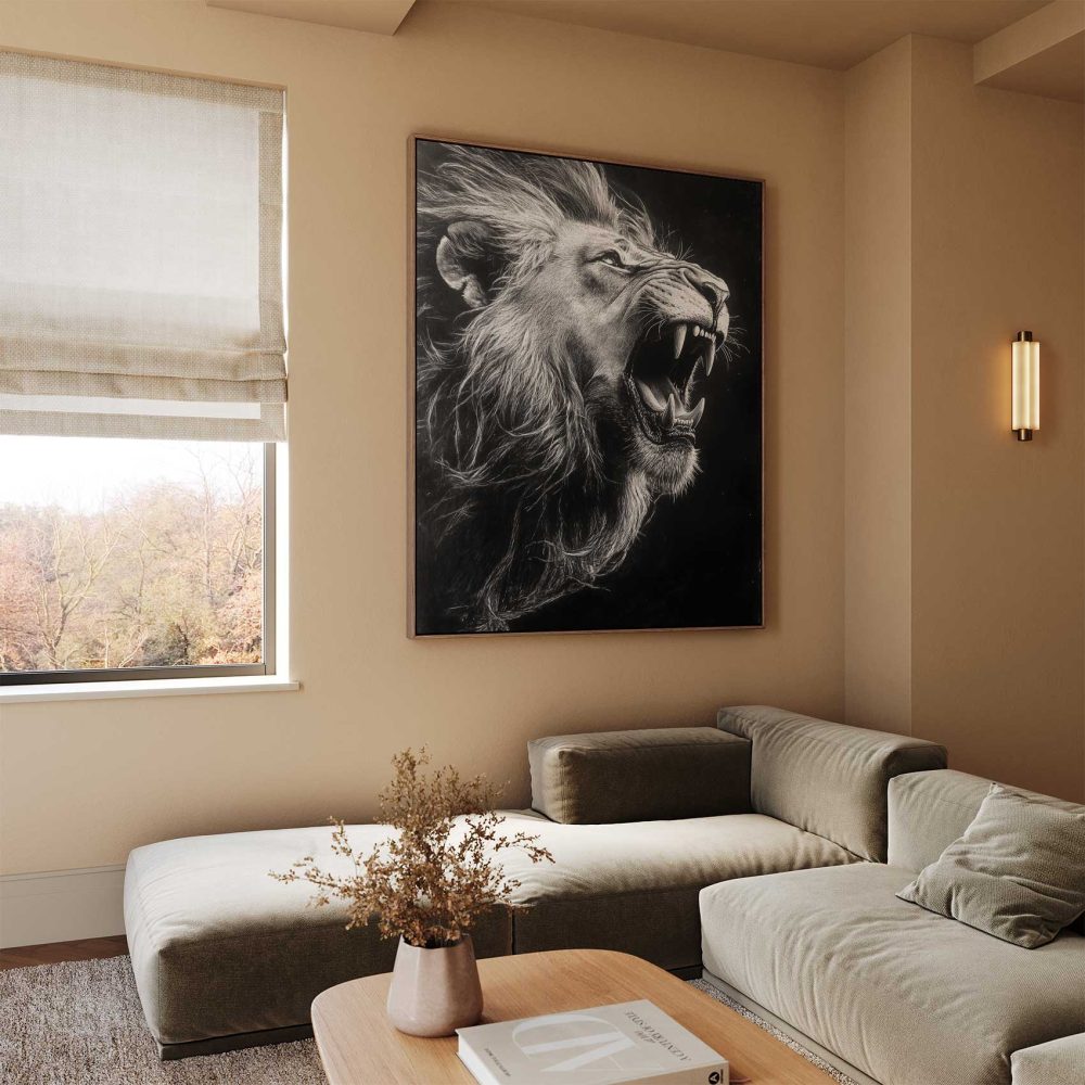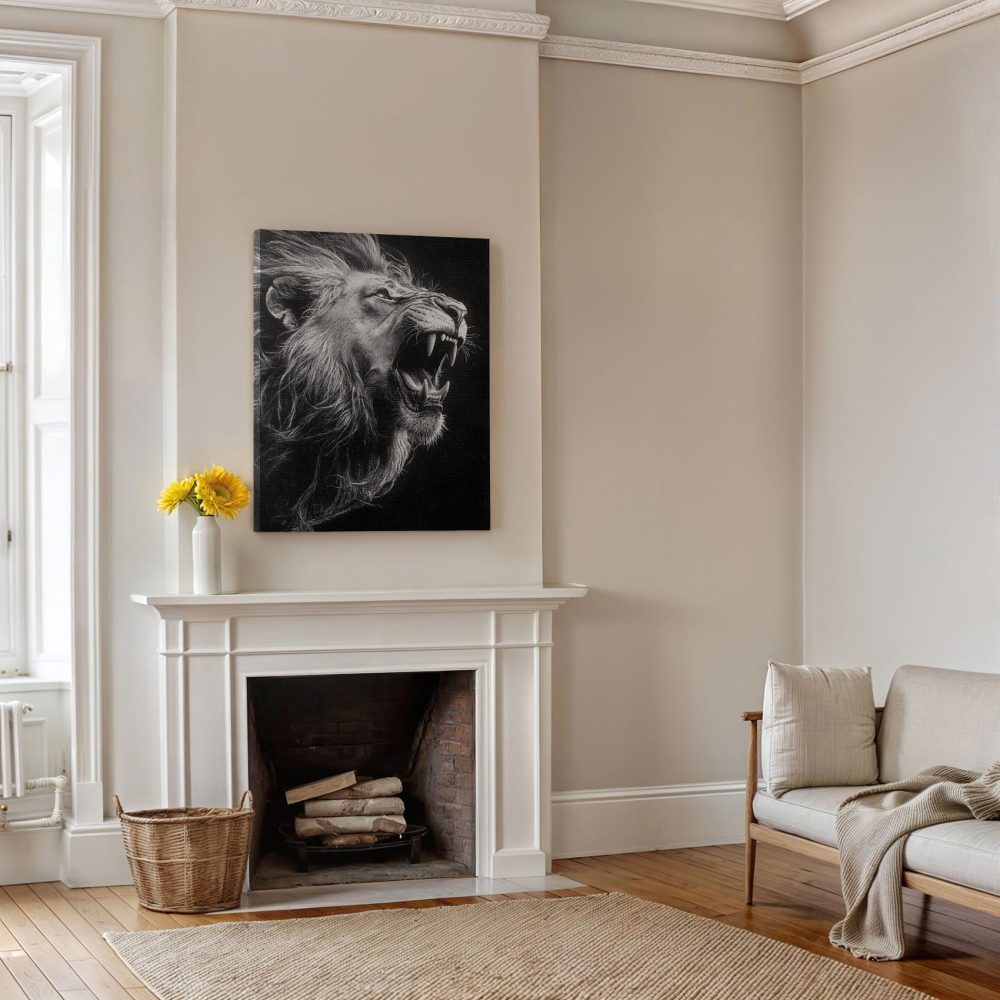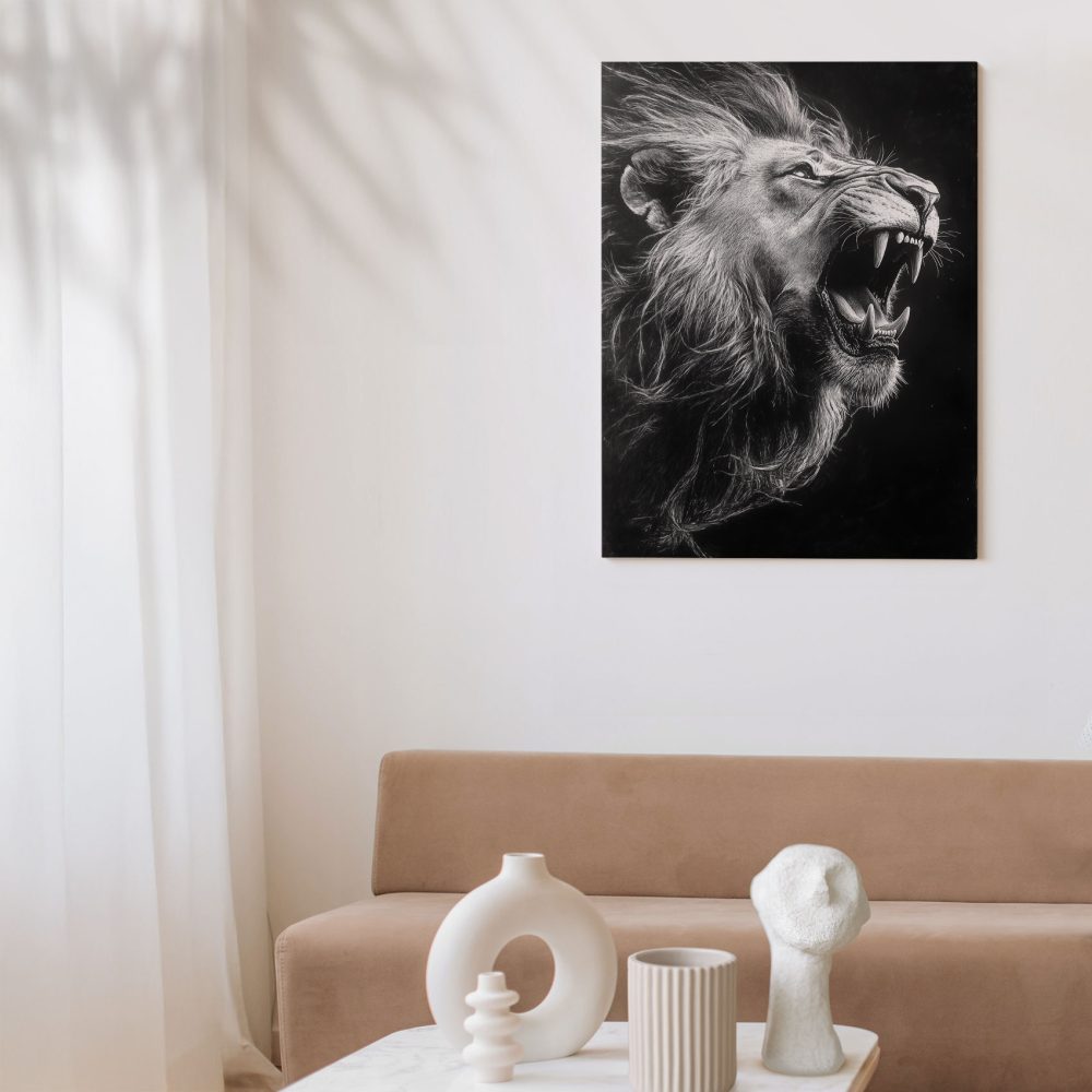 Terug naar collectie / Schilderijen / Dieren Schilderij / Majestueuze zwart-wit leeuw