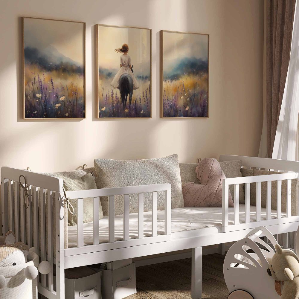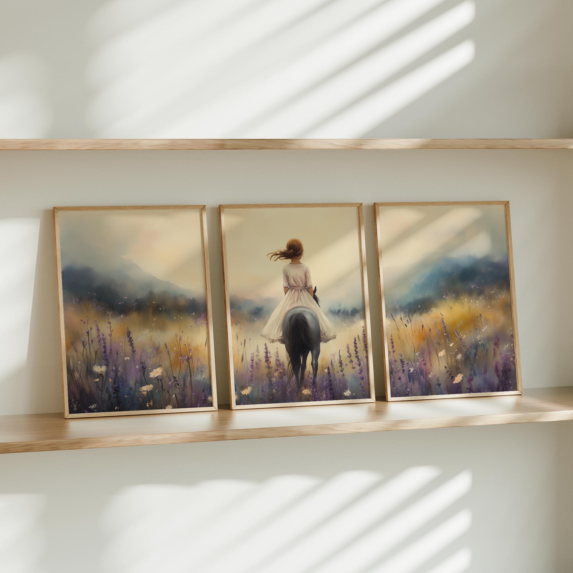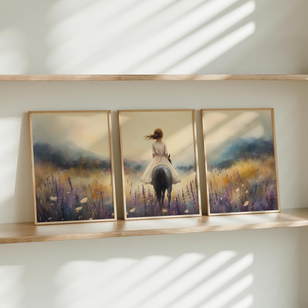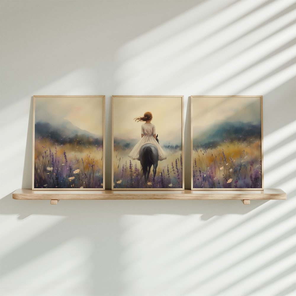 Terug naar collectie / Uncategorized / Meisje op Paard in Bloemenveld – Droomachtig Pastel