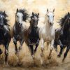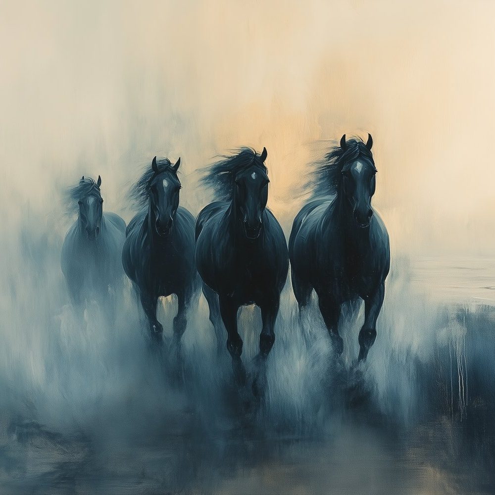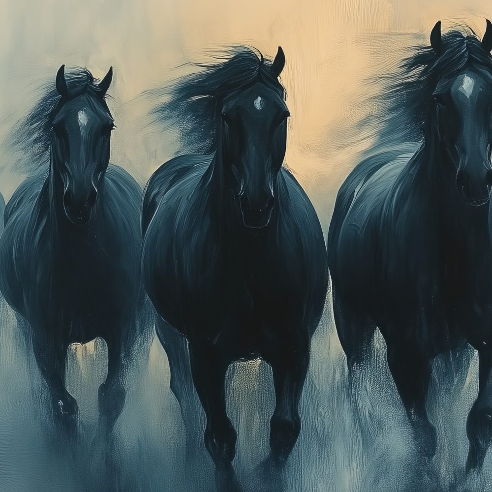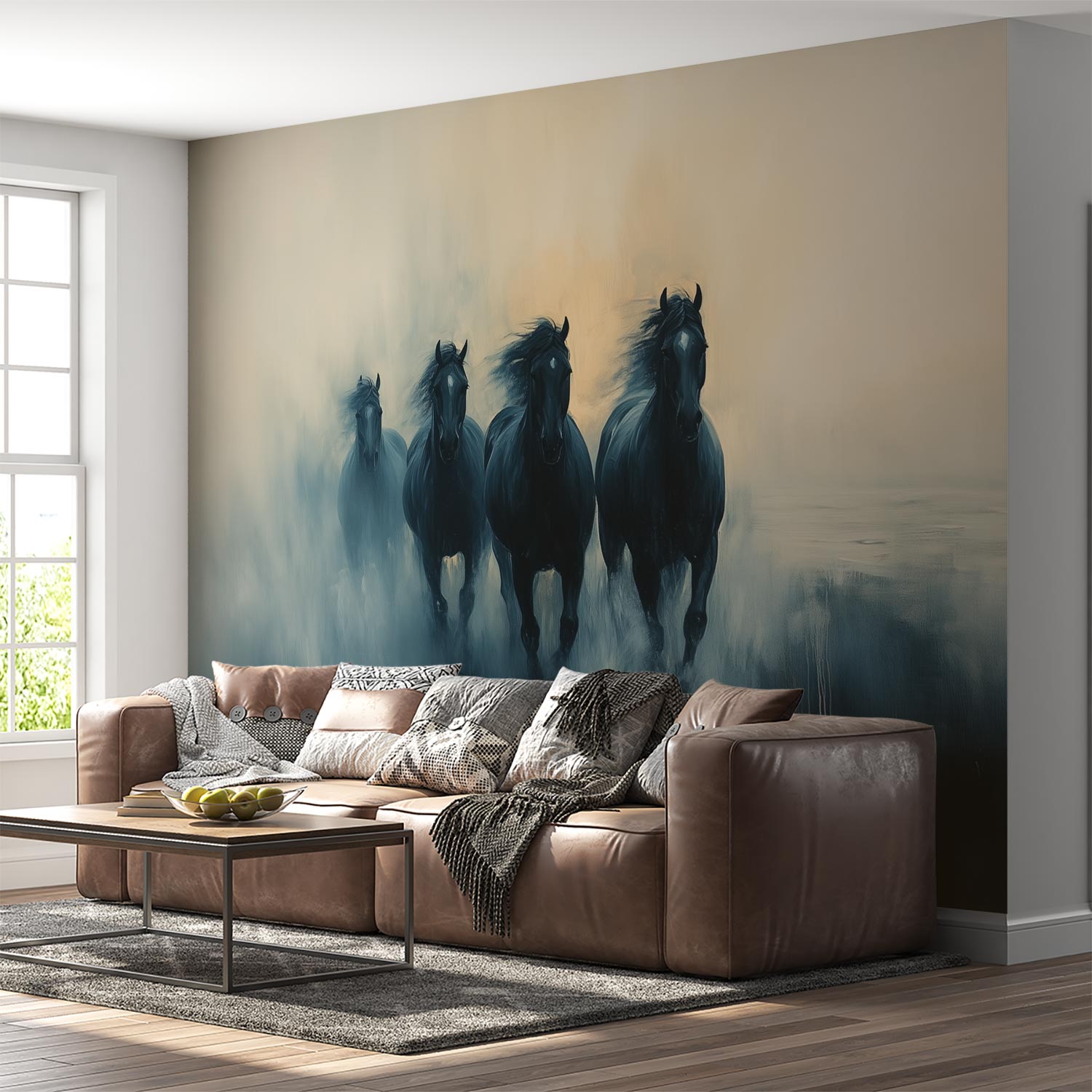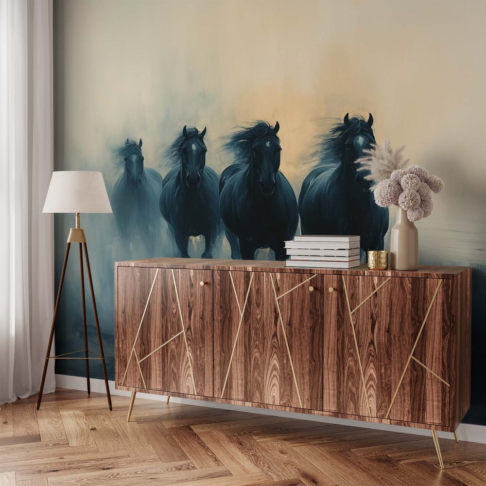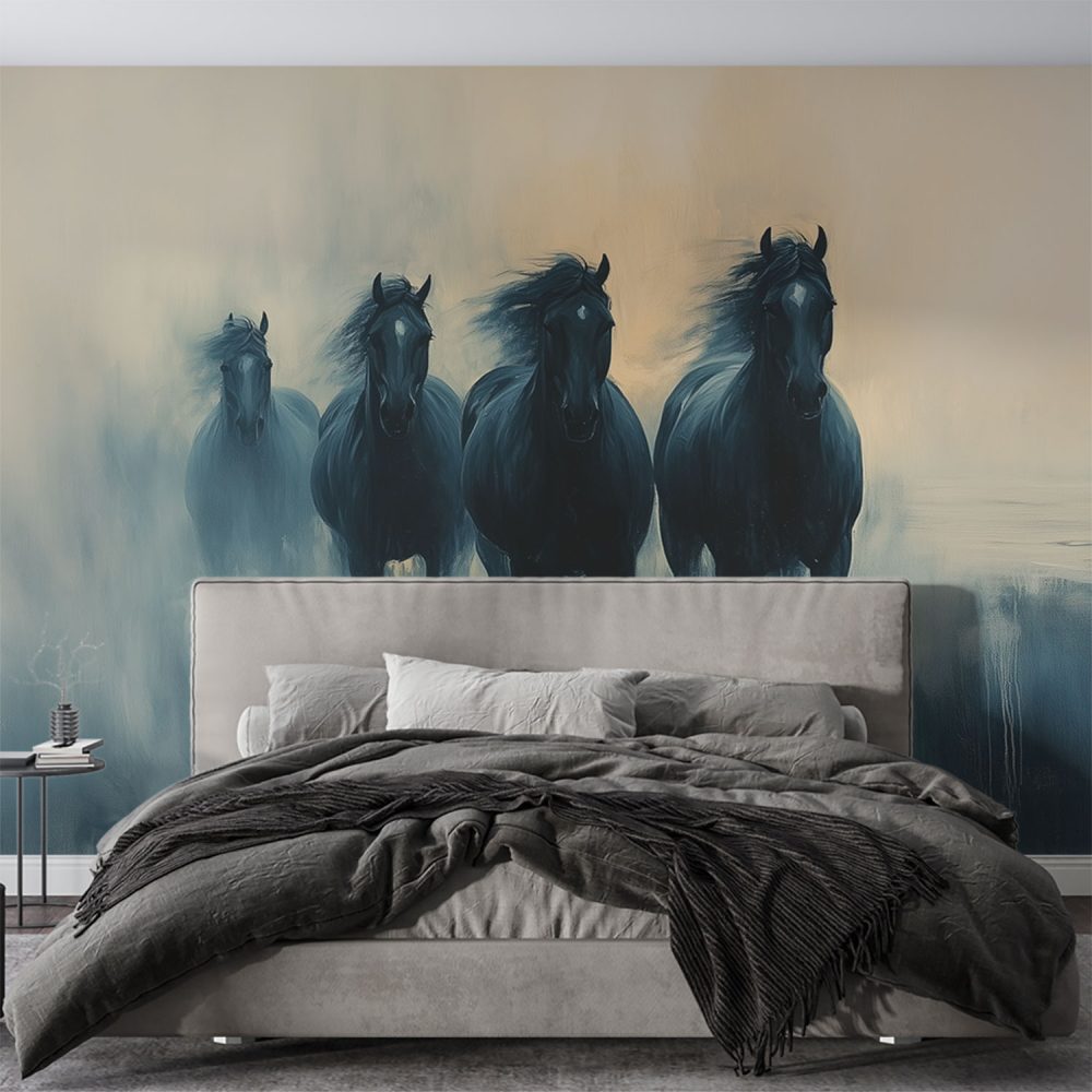 Terug naar collectie / Behang / Mistige Galopperende Zwarte Paarden behang