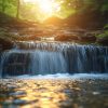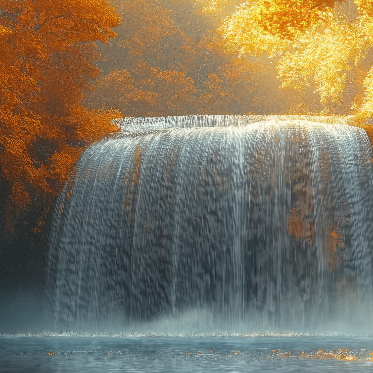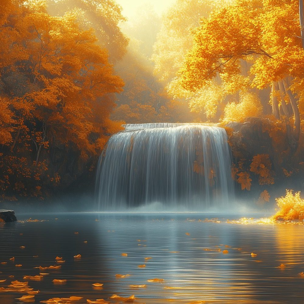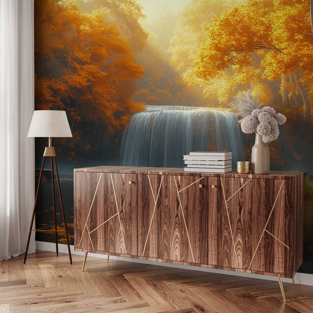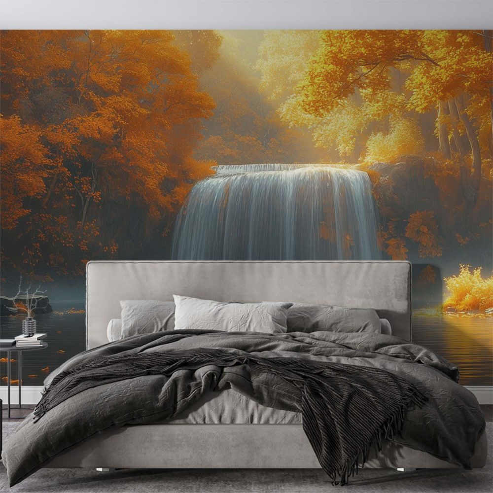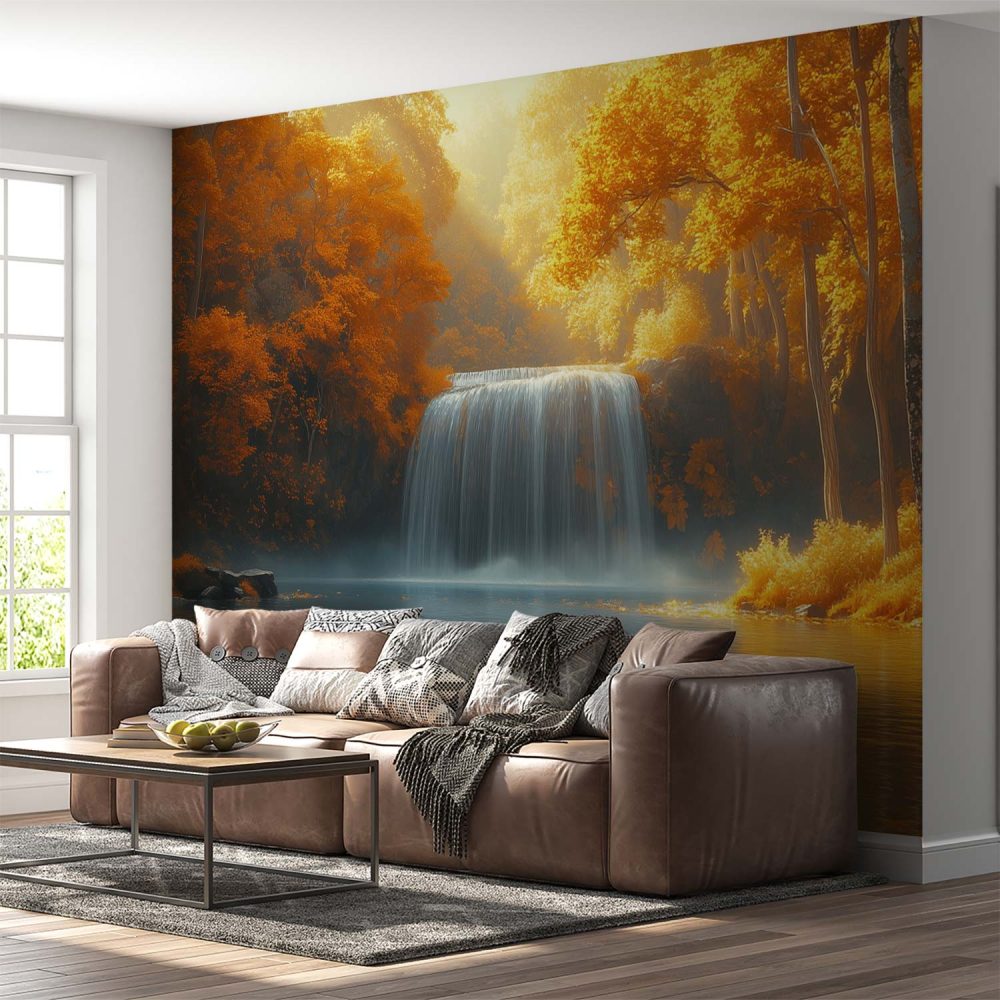 Mistige waterval in herfst behang