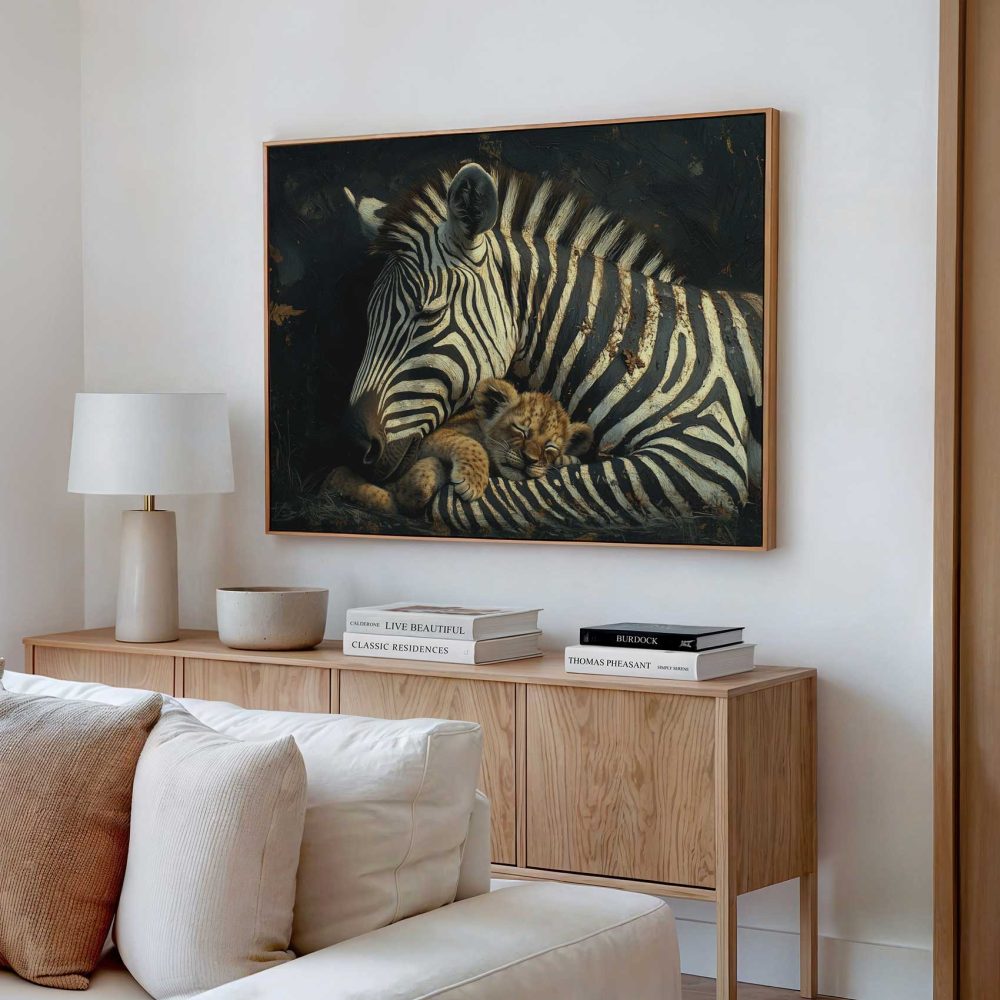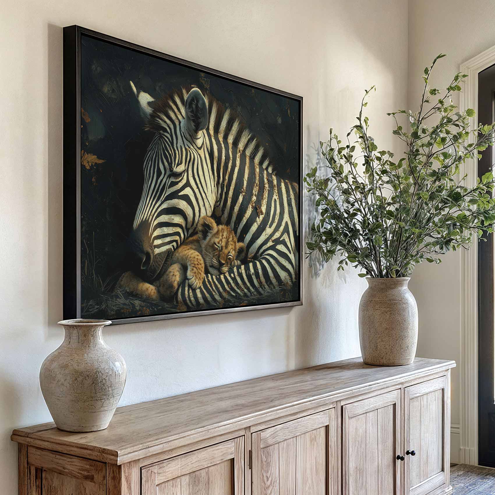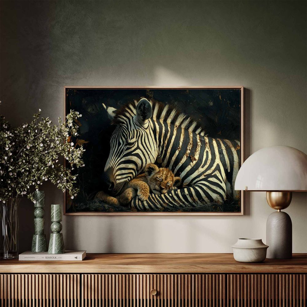 Terug naar collectie / Schilderijen / Dieren Schilderij / Moeder en baby zebra rusten