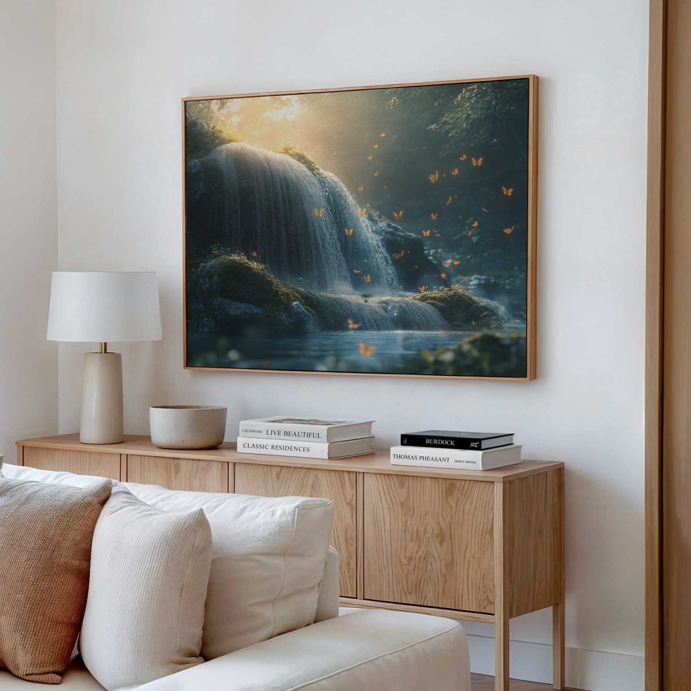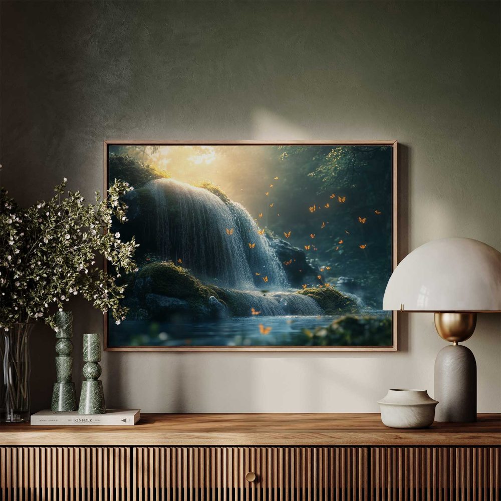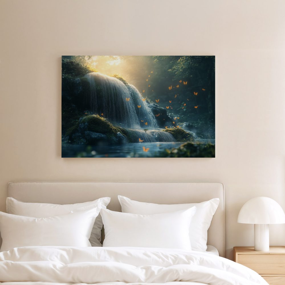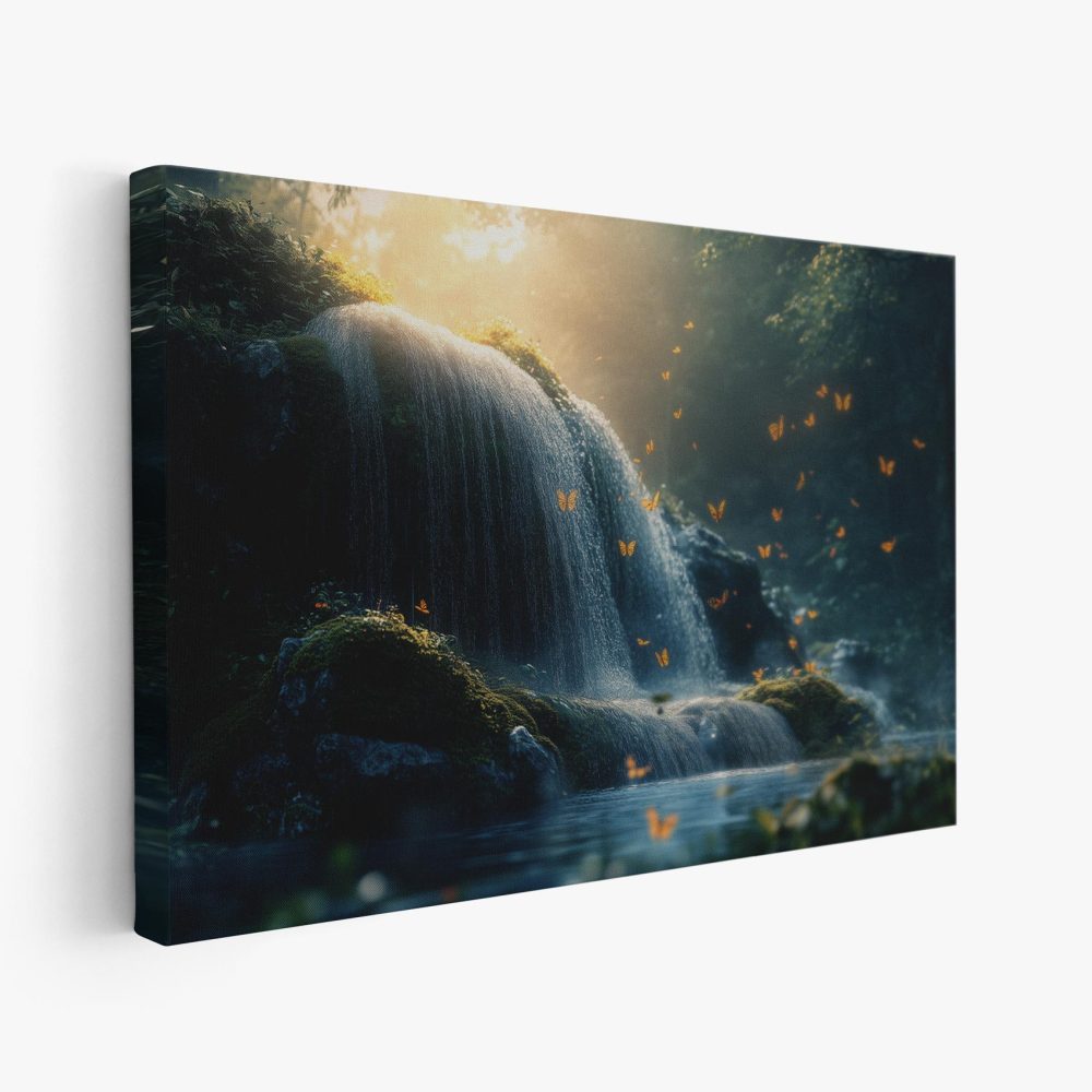 Terug naar collectie / Schilderijen / Bergen Schilderij / Mossige waterval met vlinders