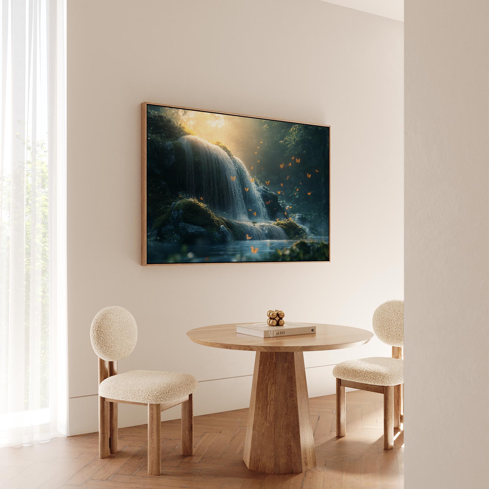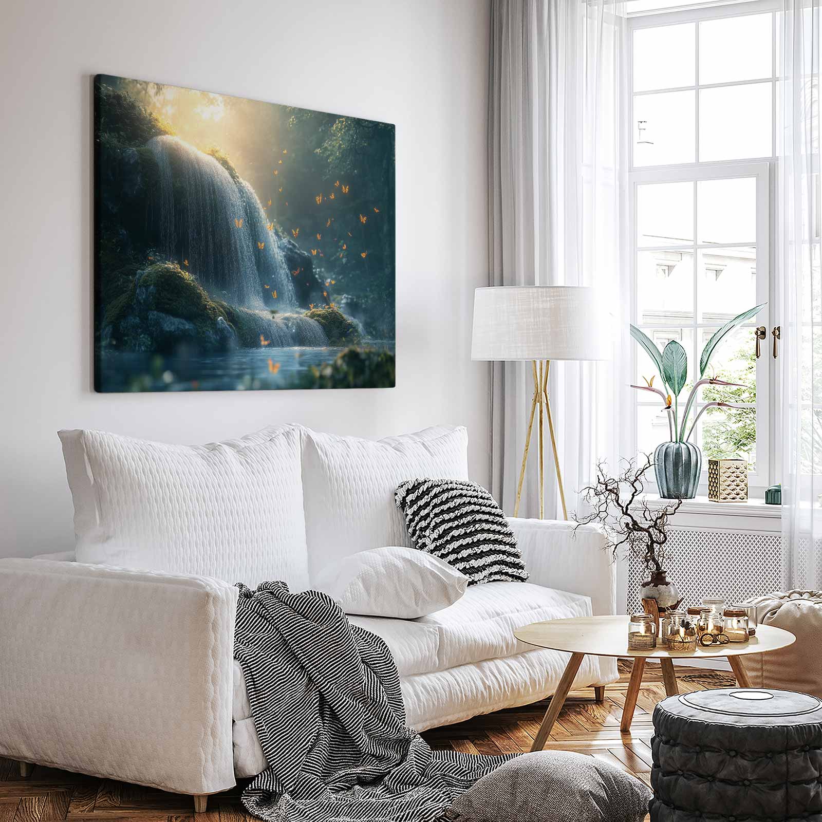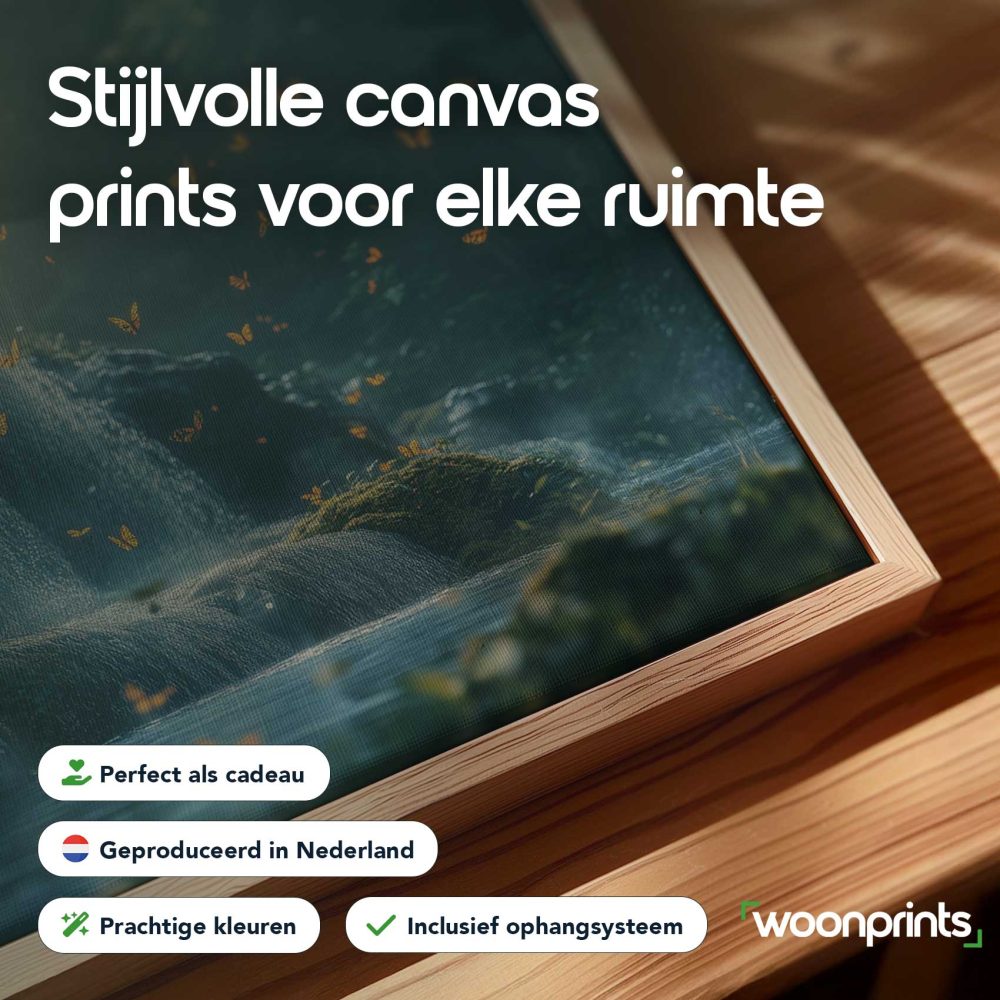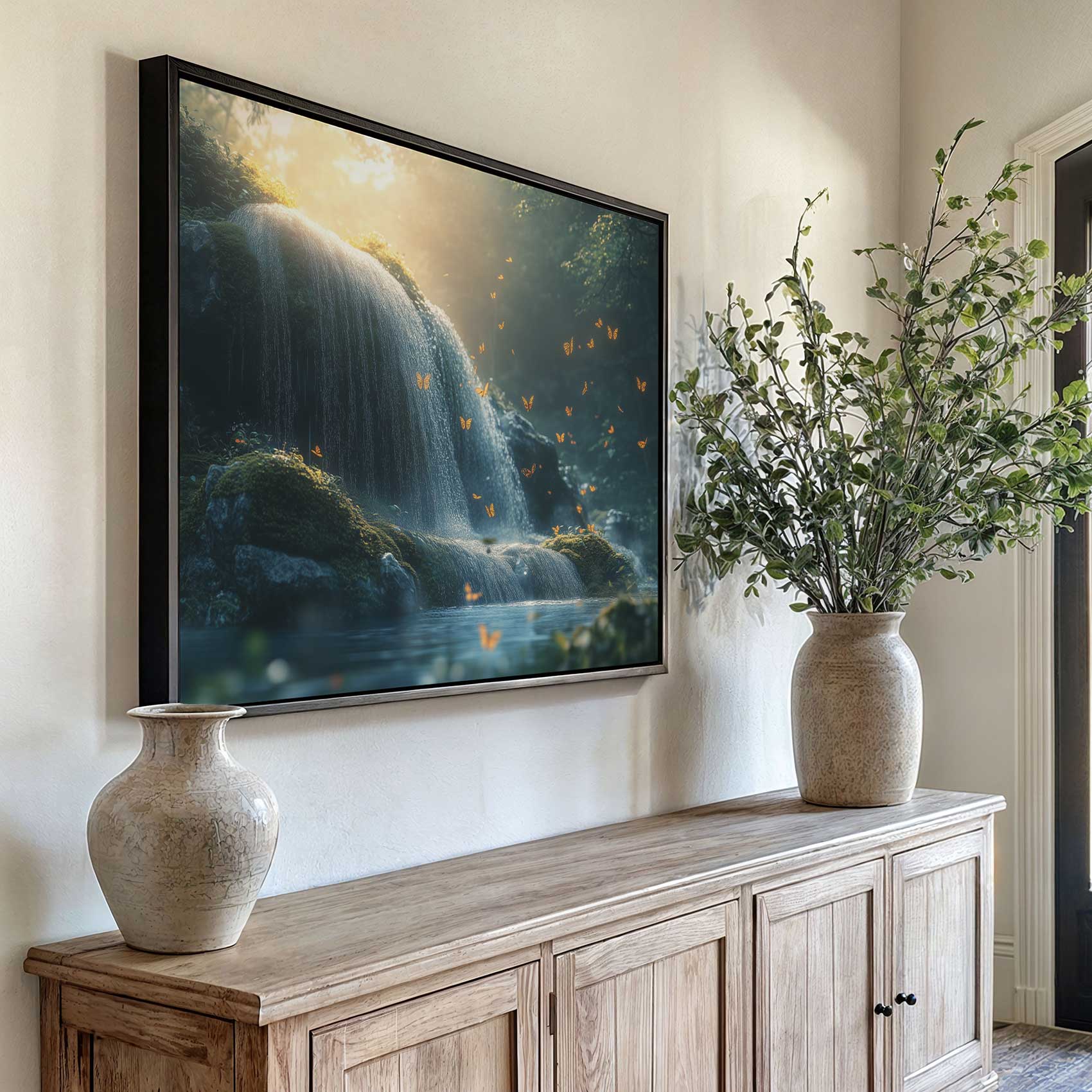 Terug naar collectie / Schilderijen / Bergen Schilderij / Mossige waterval met vlinders