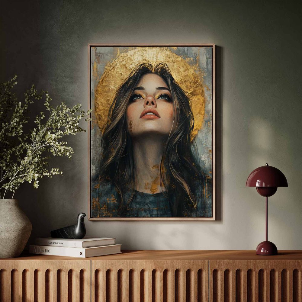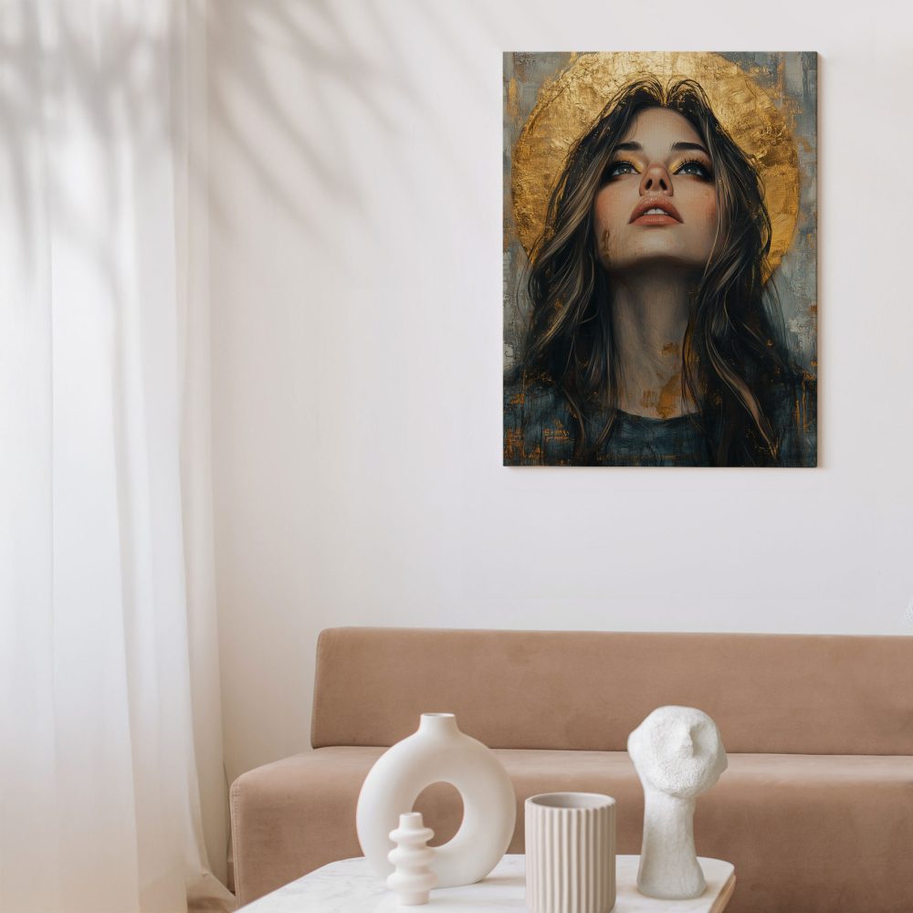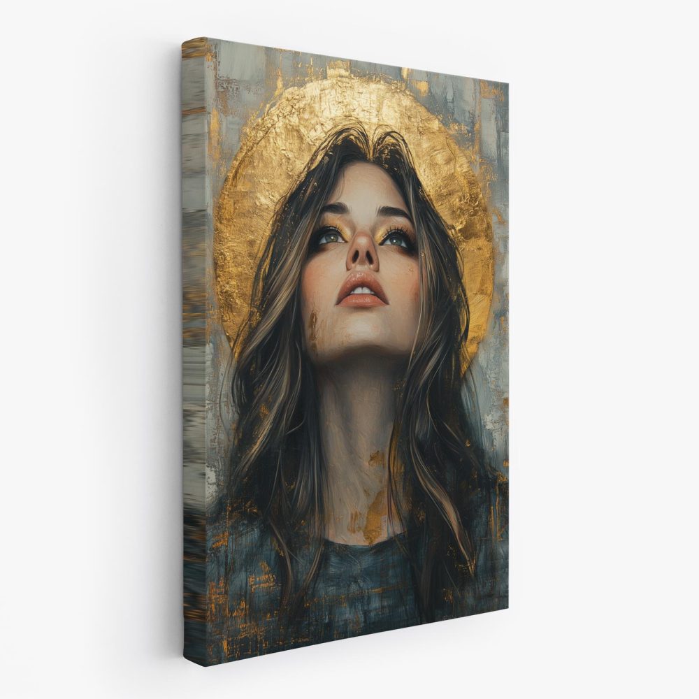 Terug naar collectie / Schilderijen / Figuren en Vormen Schilderij / Mysterieuze vrouw met gouden halo