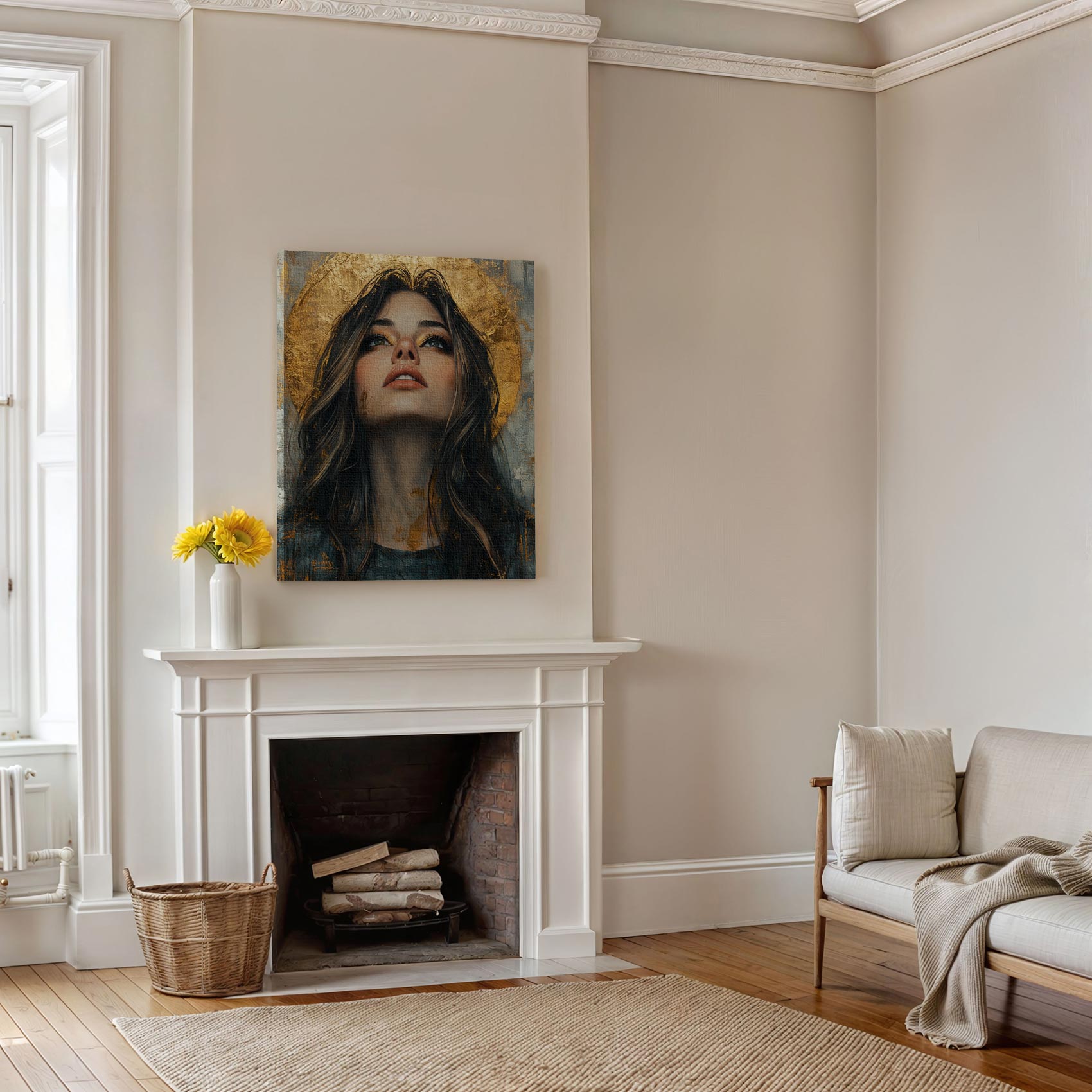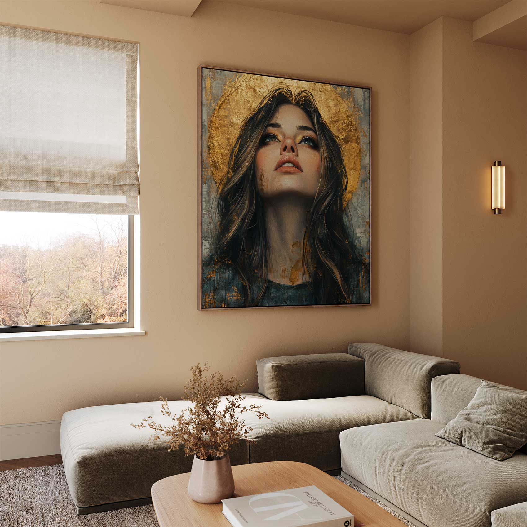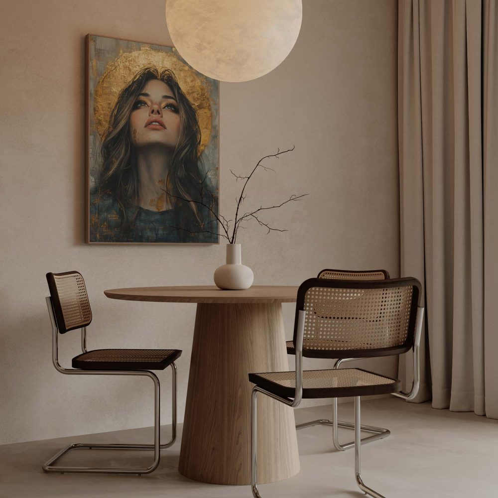 Terug naar collectie / Schilderijen / Figuren en Vormen Schilderij / Mysterieuze vrouw met gouden halo