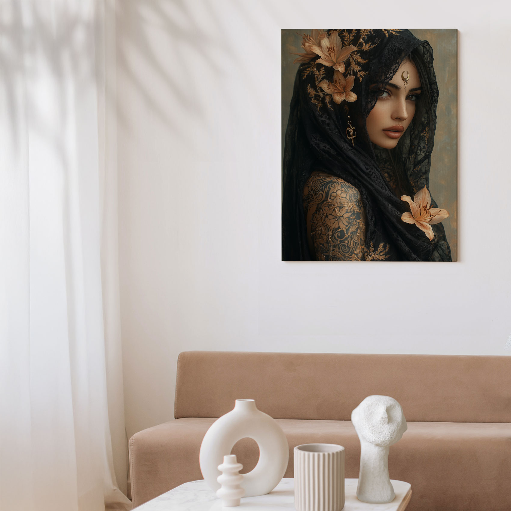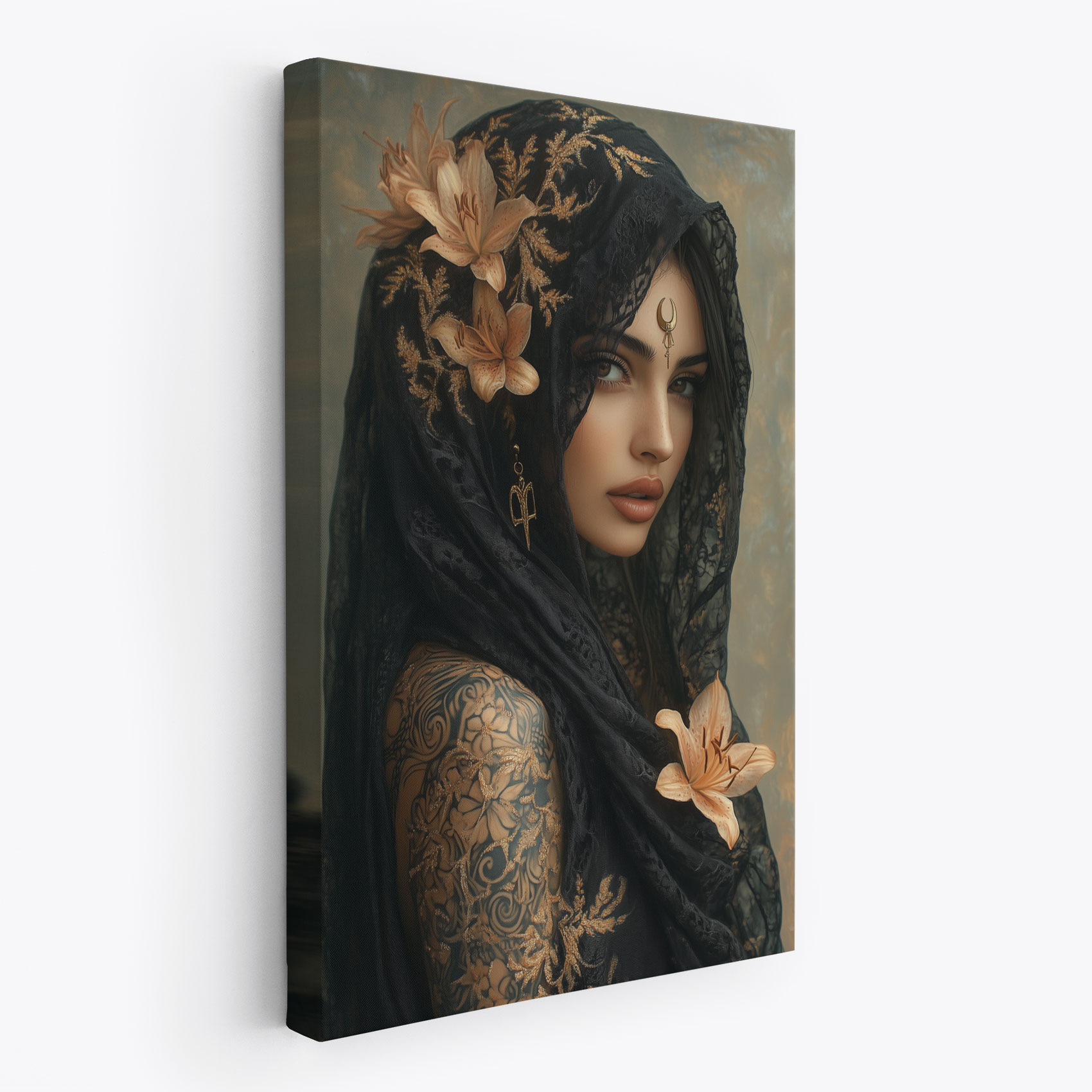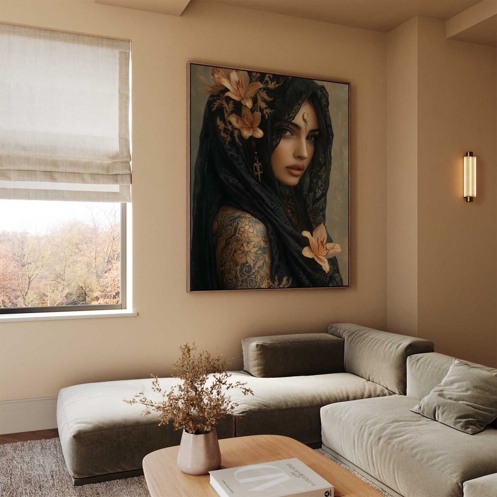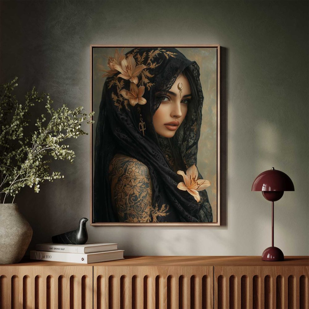 Terug naar collectie / Schilderijen / Bloemen Schilderij / Mystieke vrouw met bloemensjaal