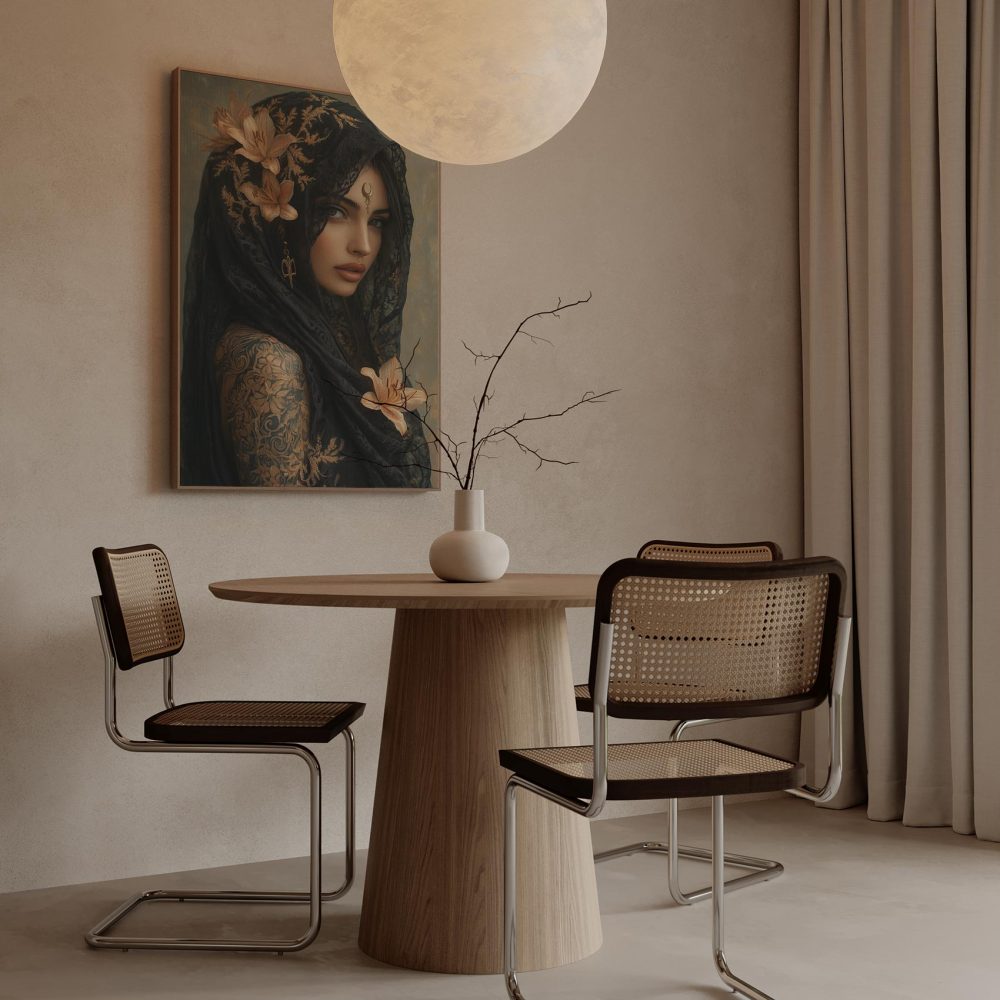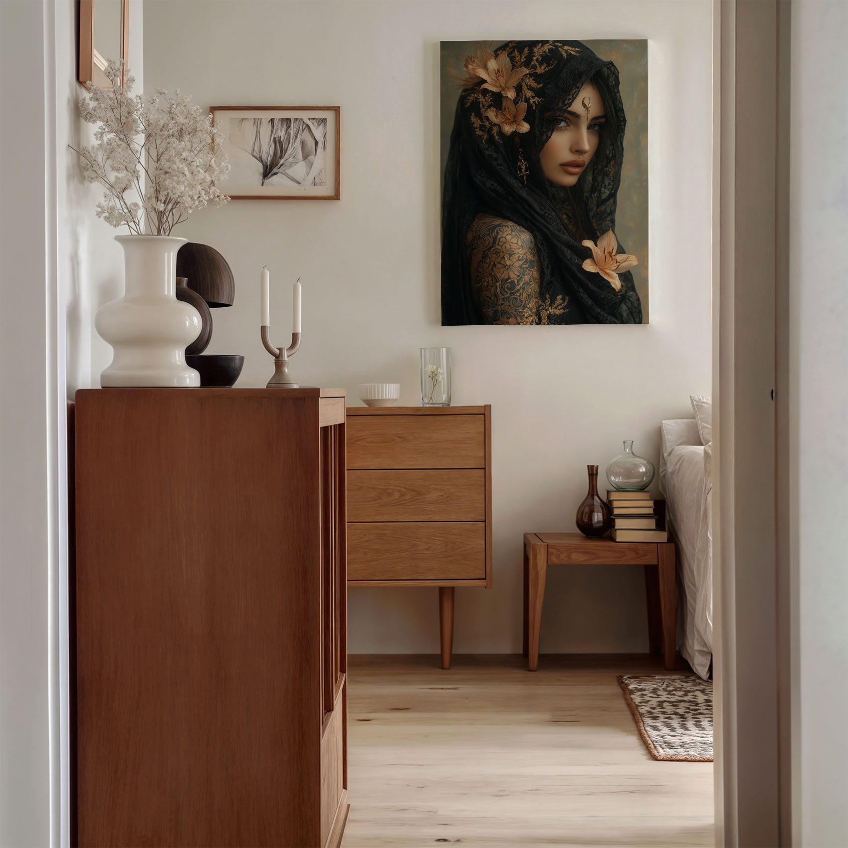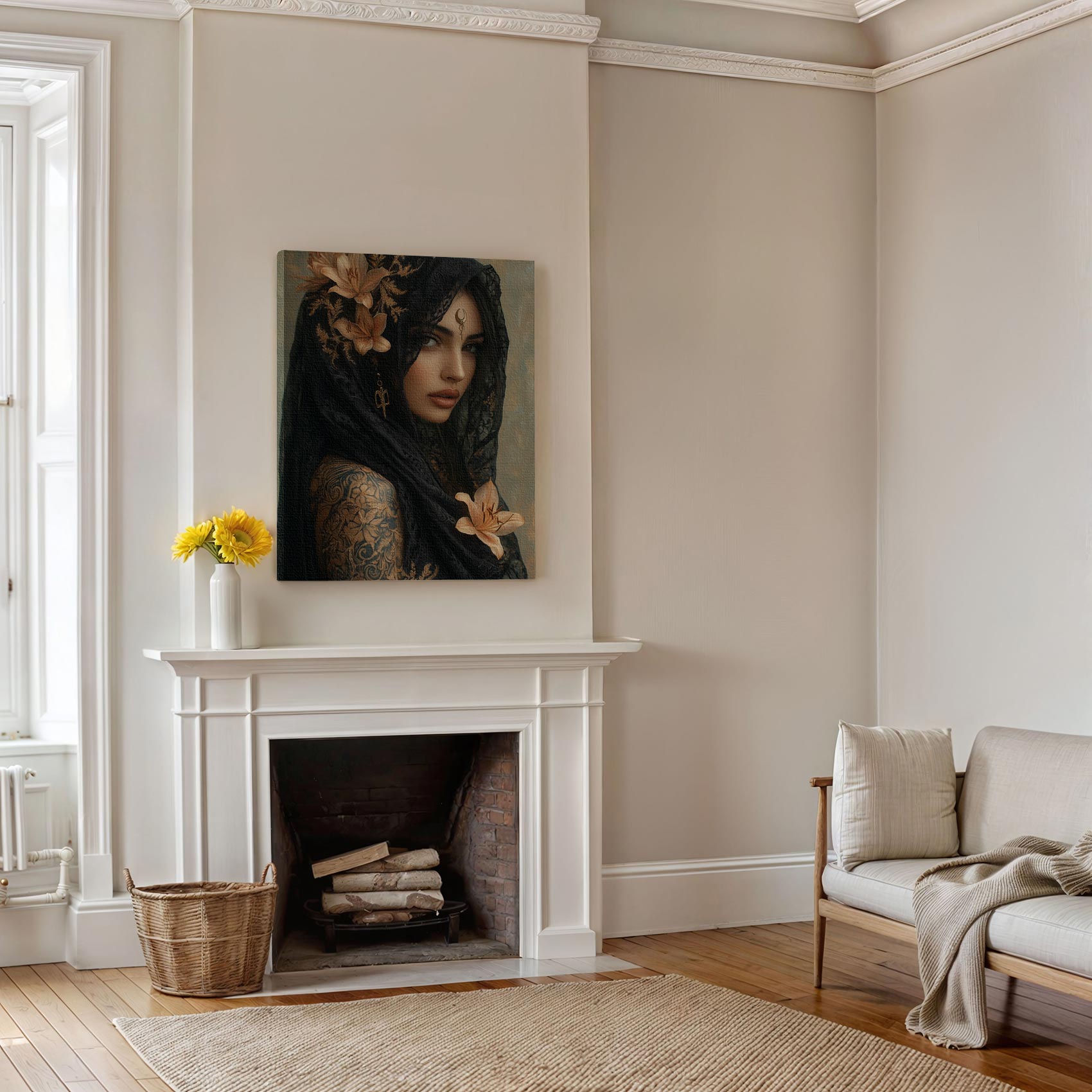 Terug naar collectie / Schilderijen / Bloemen Schilderij / Mystieke vrouw met bloemensjaal