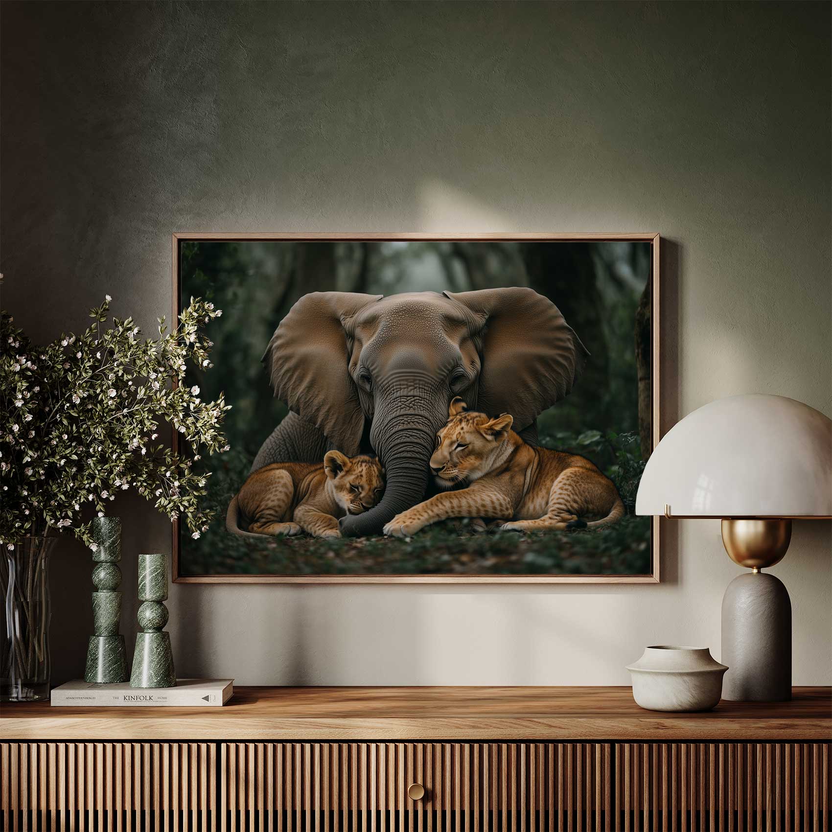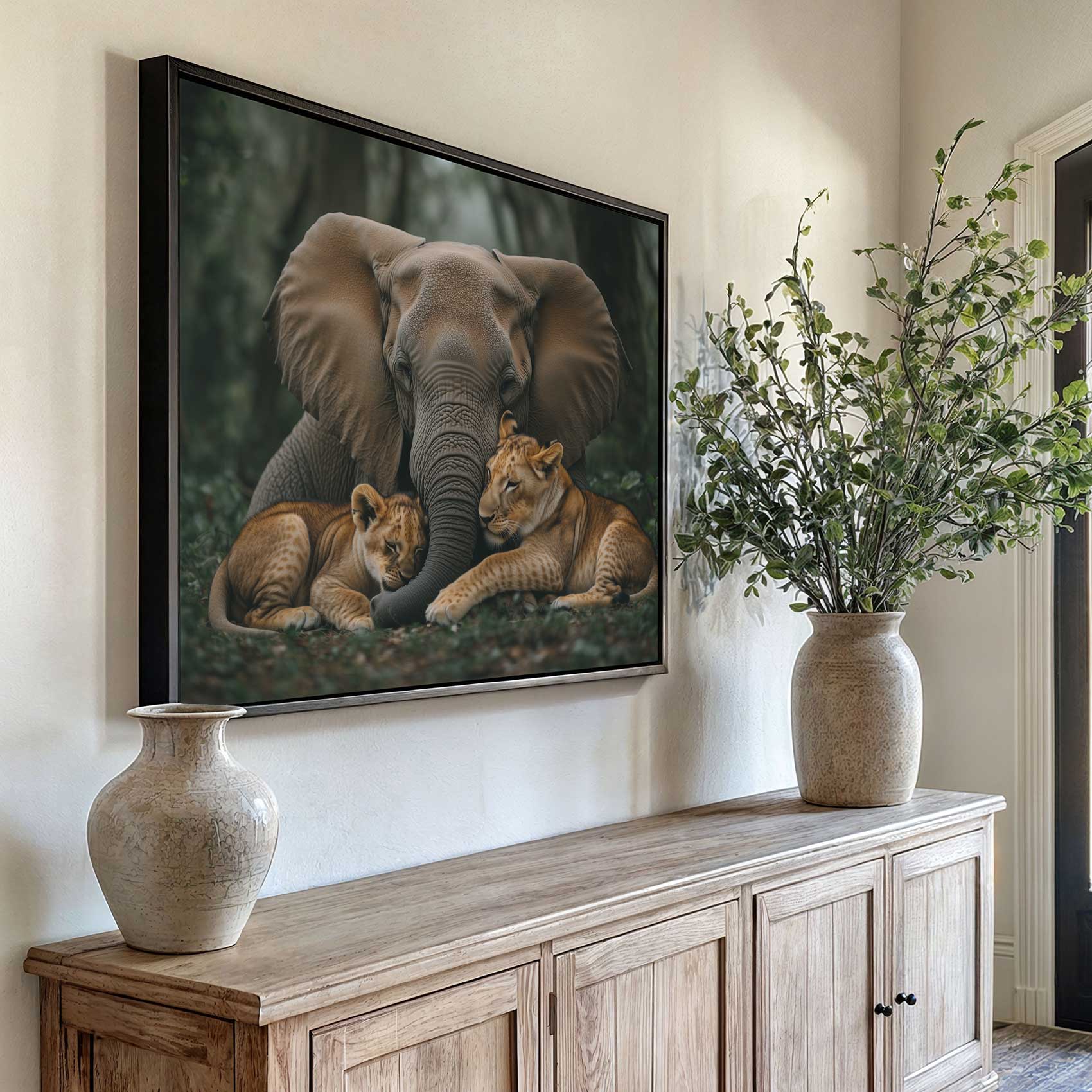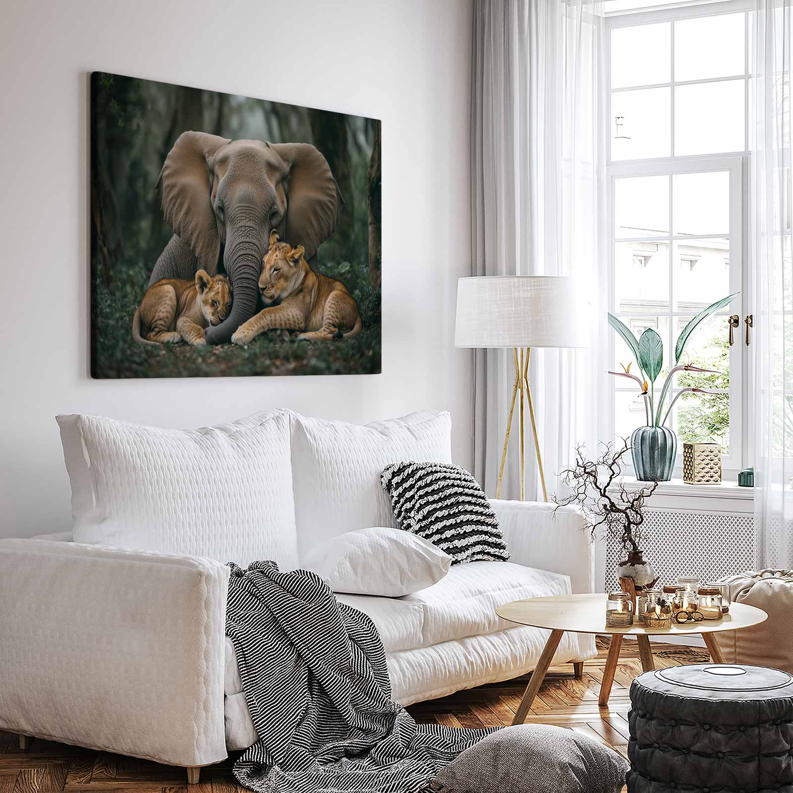 Terug naar collectie / Schilderijen / Bloemen Schilderij / Olifant en leeuwen in jungle