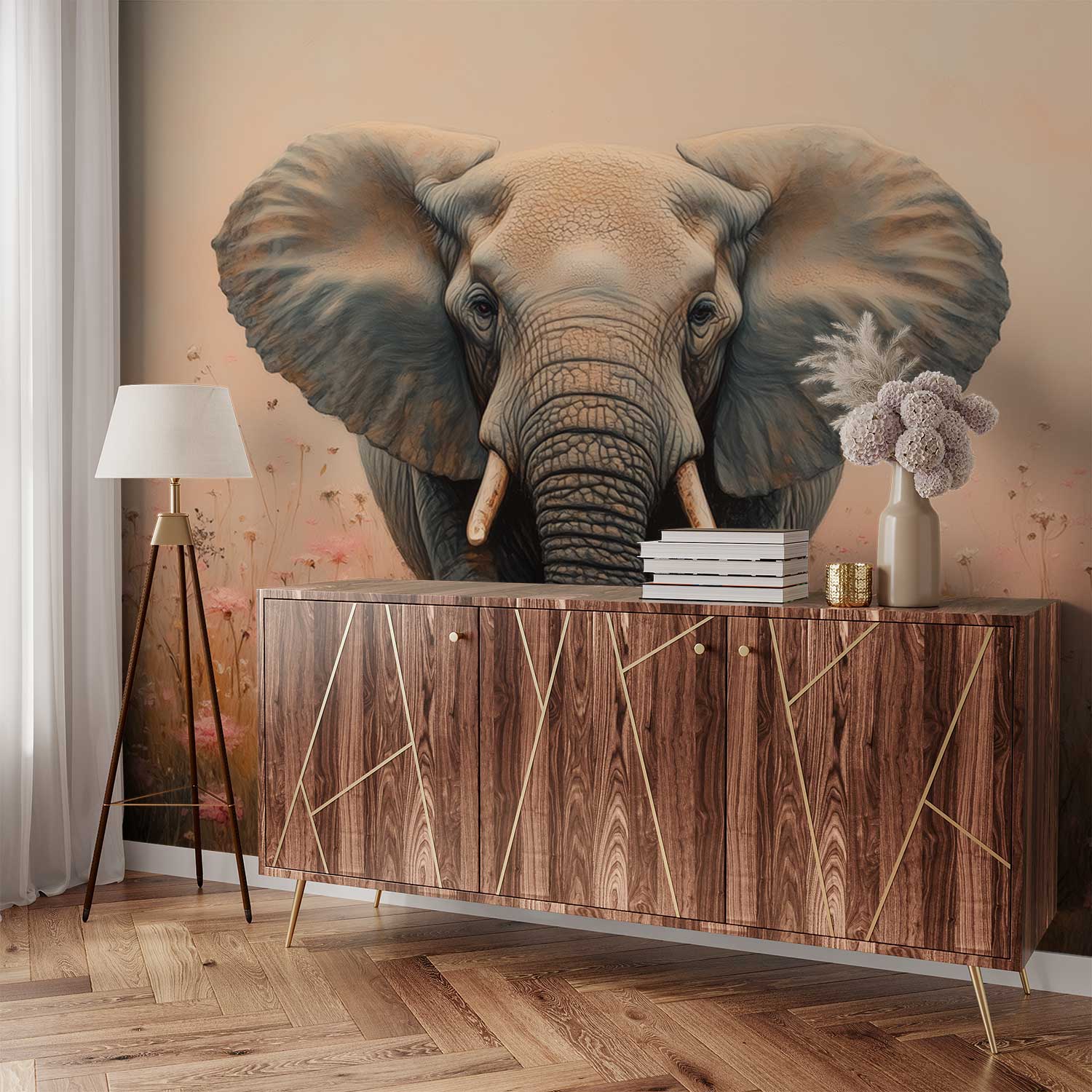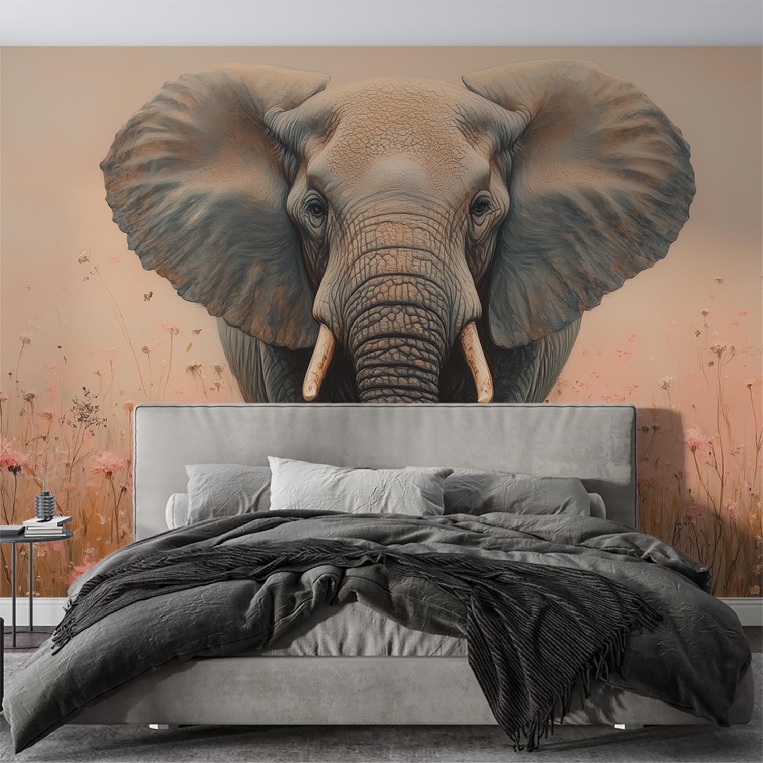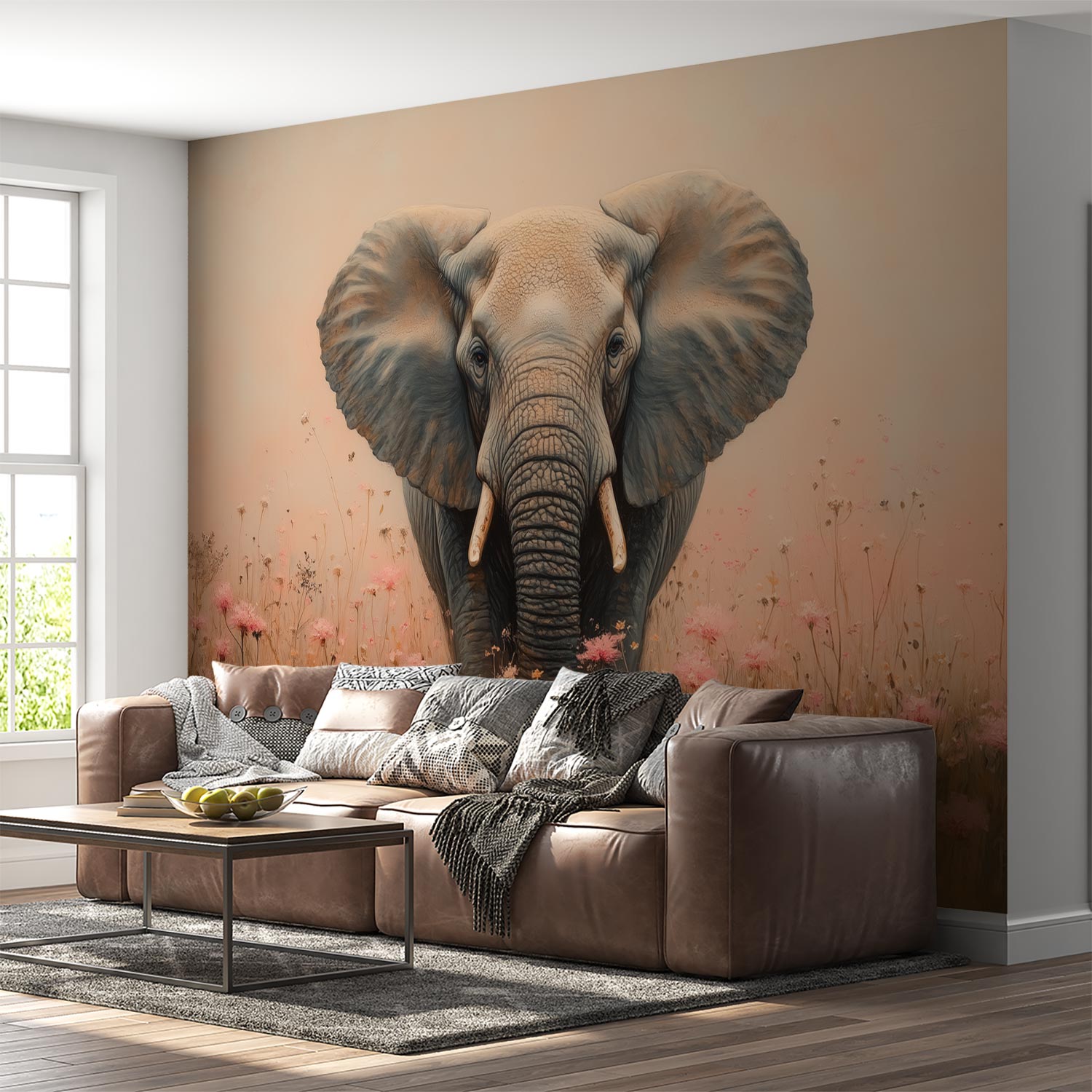Terug naar collectie / Behang / Olifant in roze bloemenveld behang