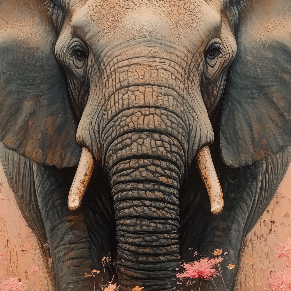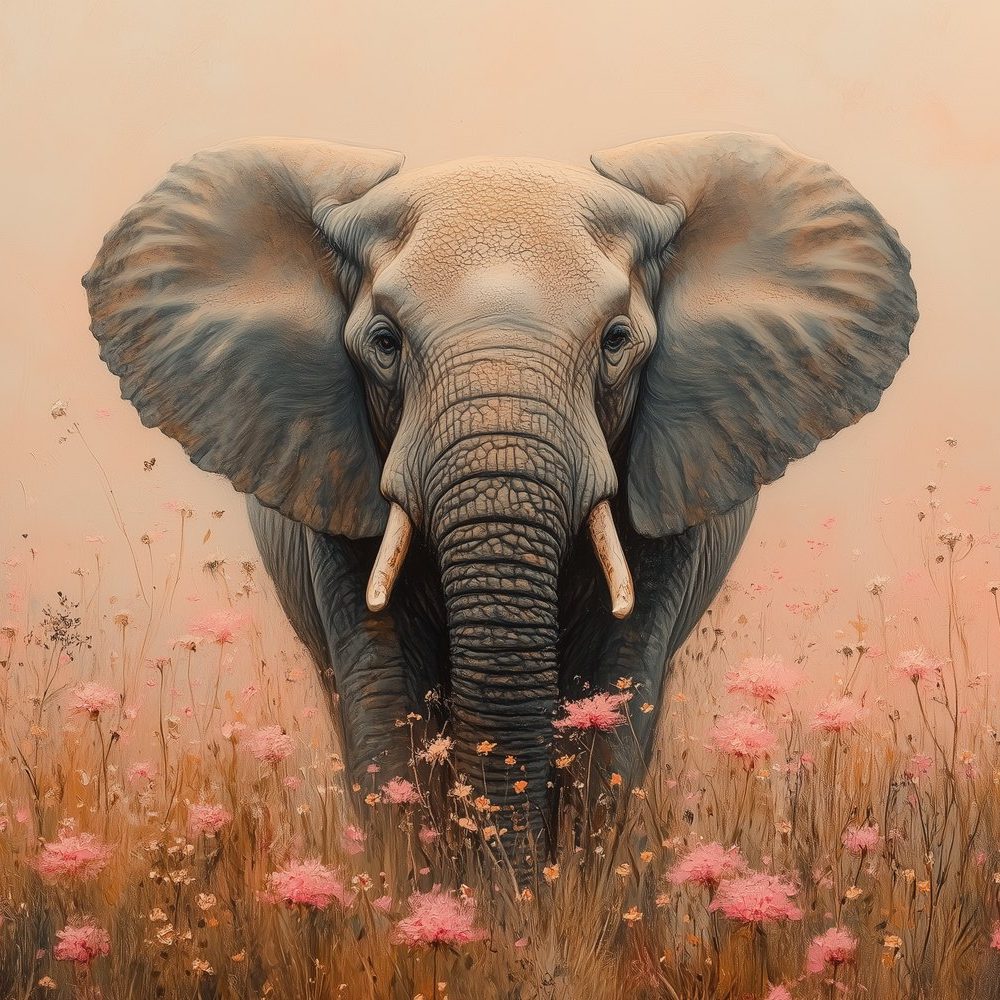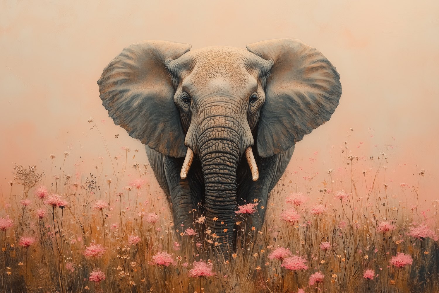 Terug naar collectie / Behang / Olifant in roze bloemenveld behang