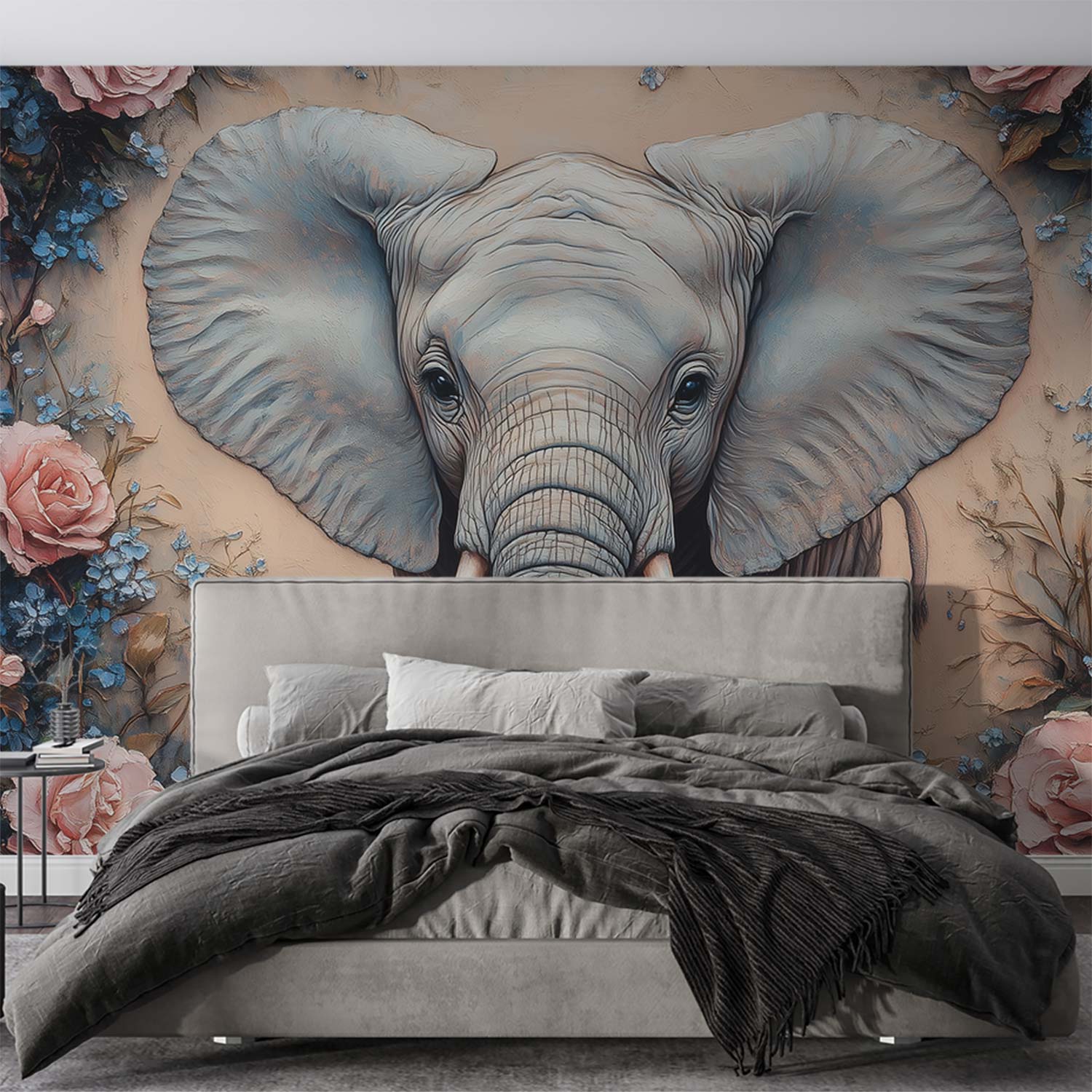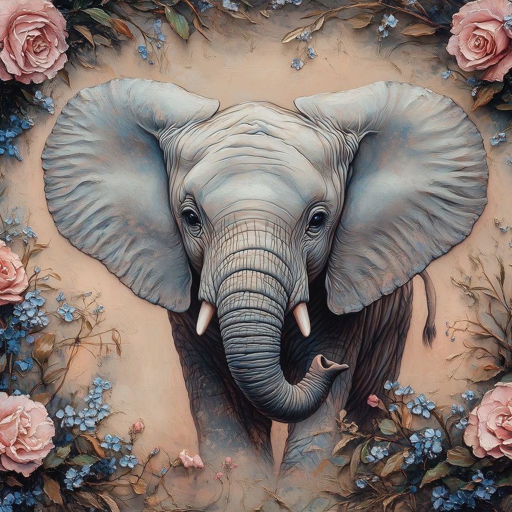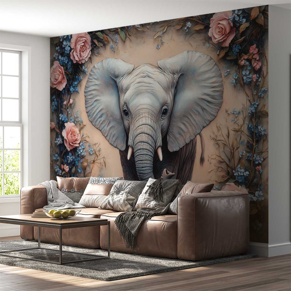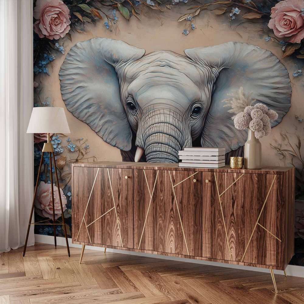 Olifant omringd door bloemen behang