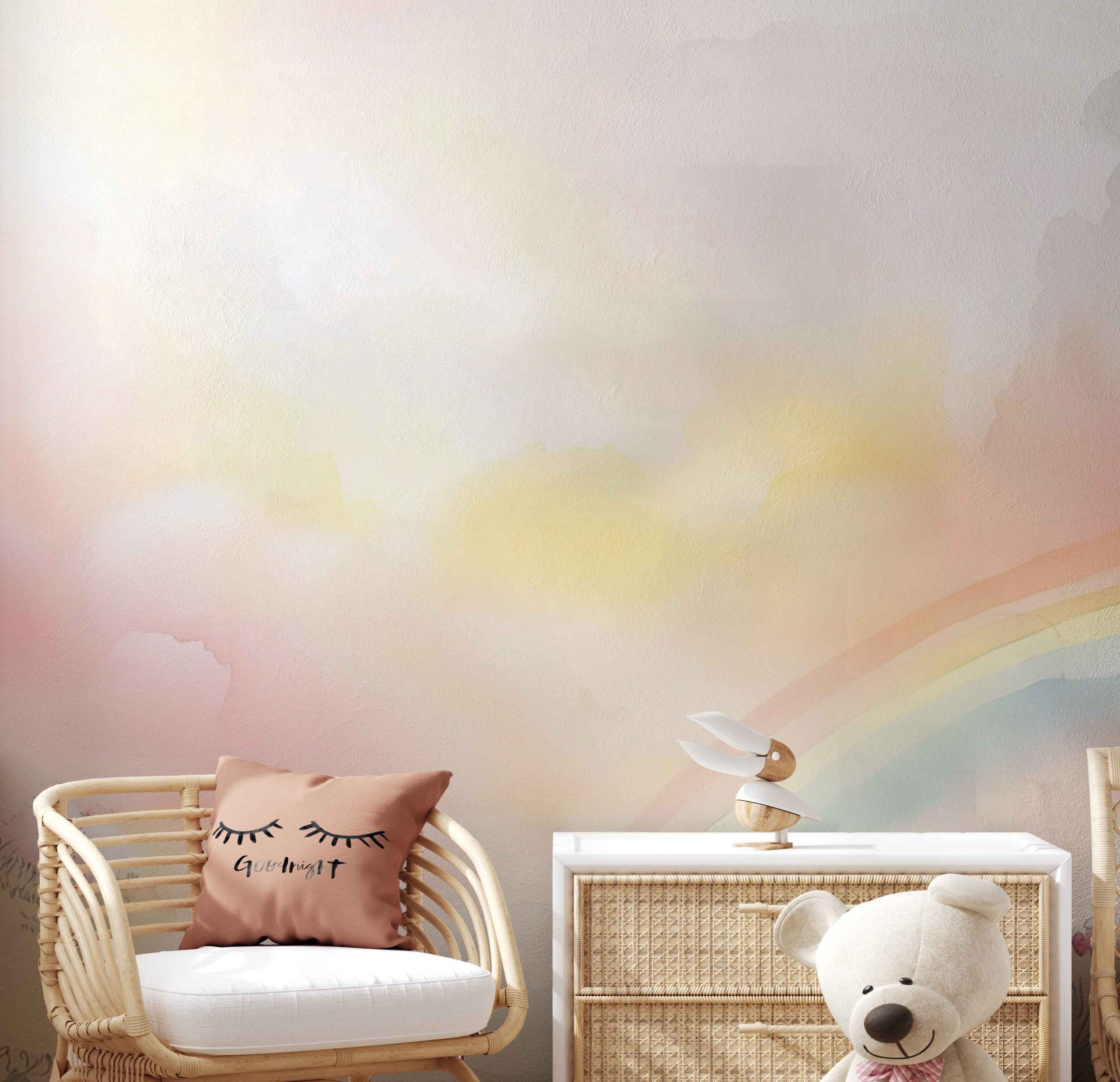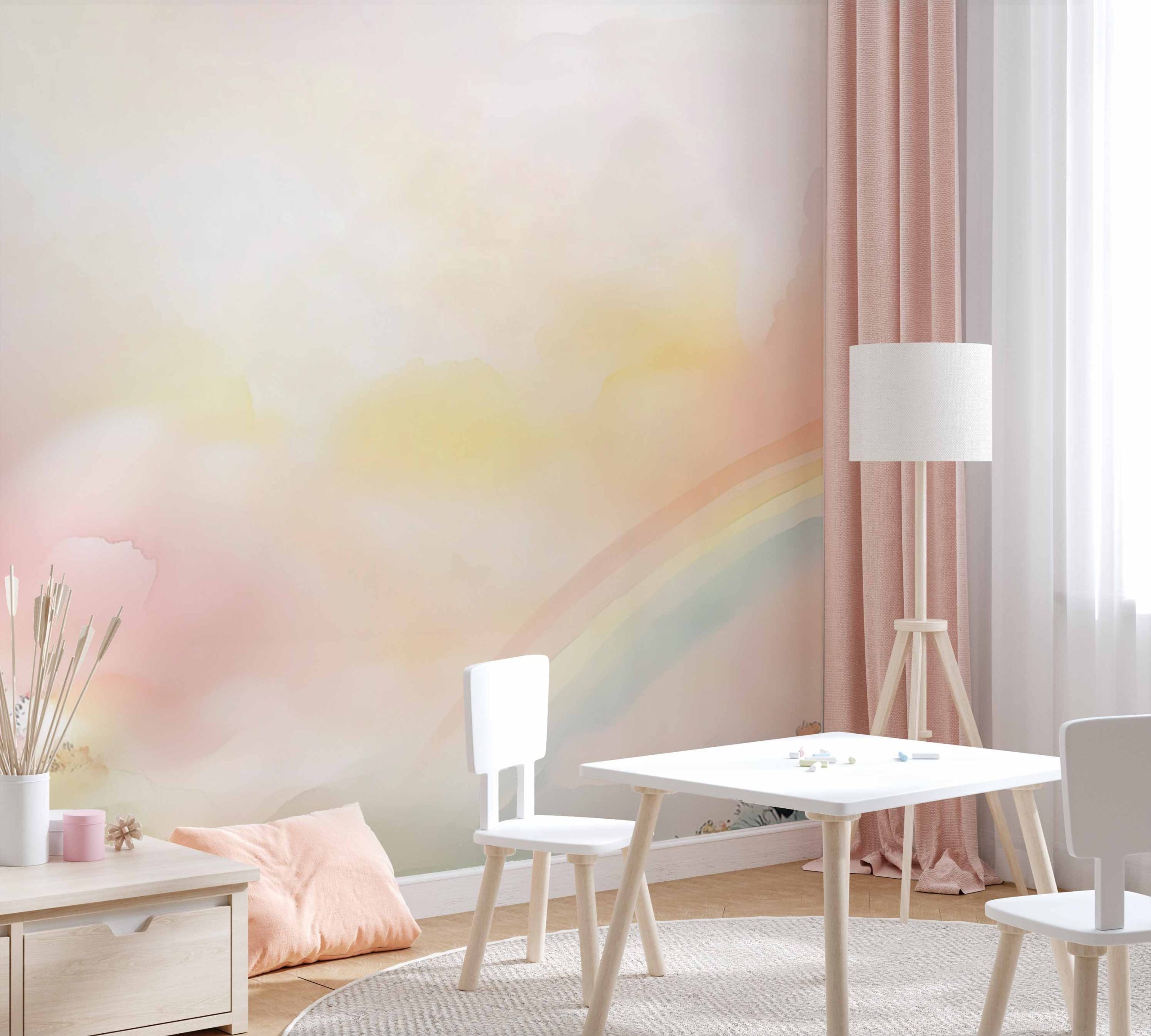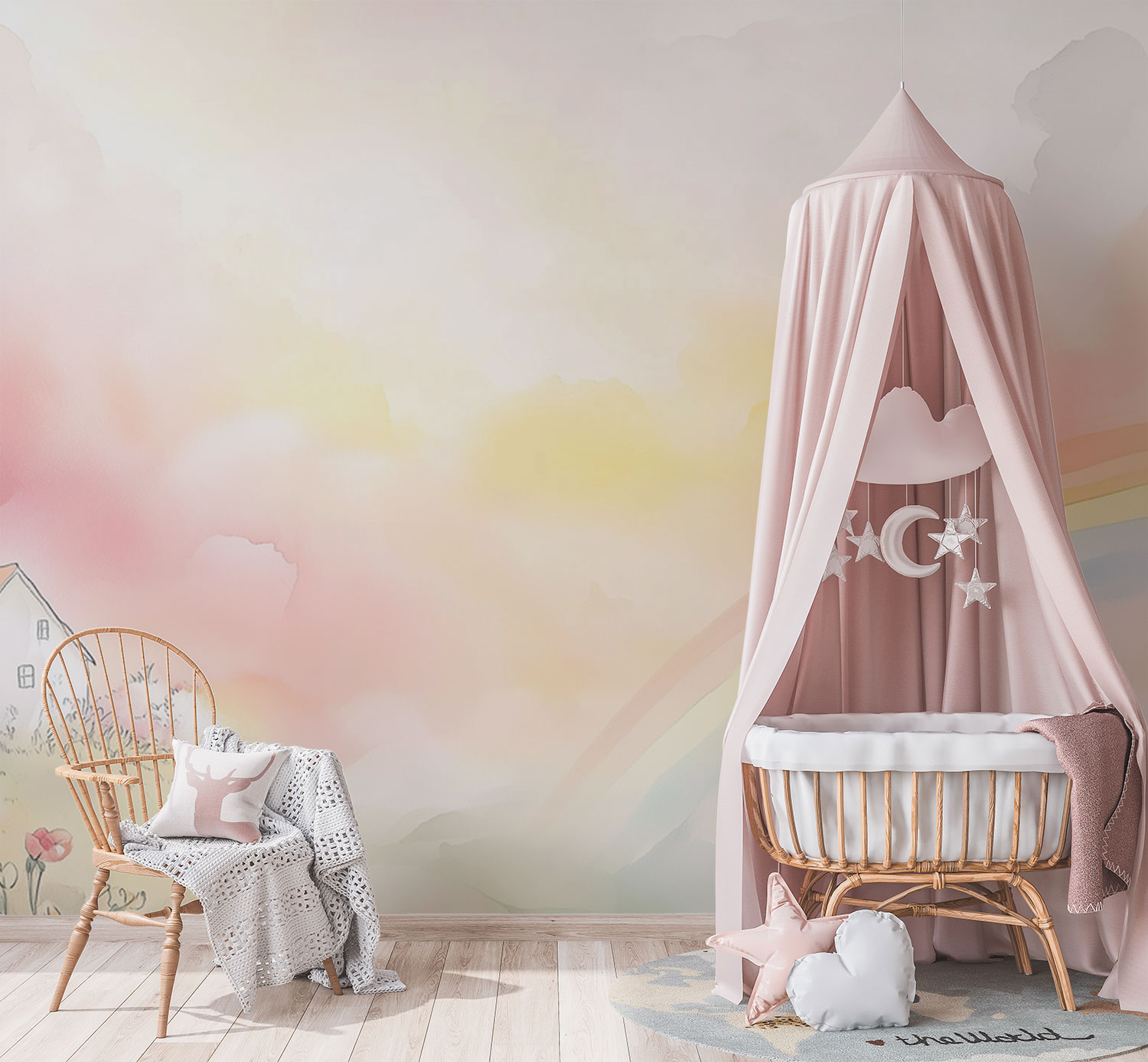 Terug naar collectie / Behang / Kinderkamer behang / Babykamer behang / Pastel regenbooghuis op heuvel behang