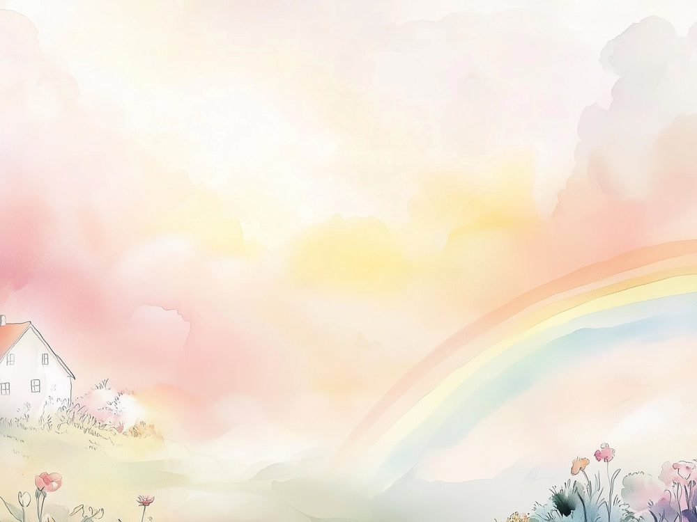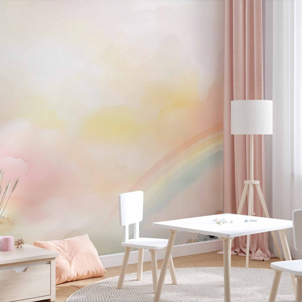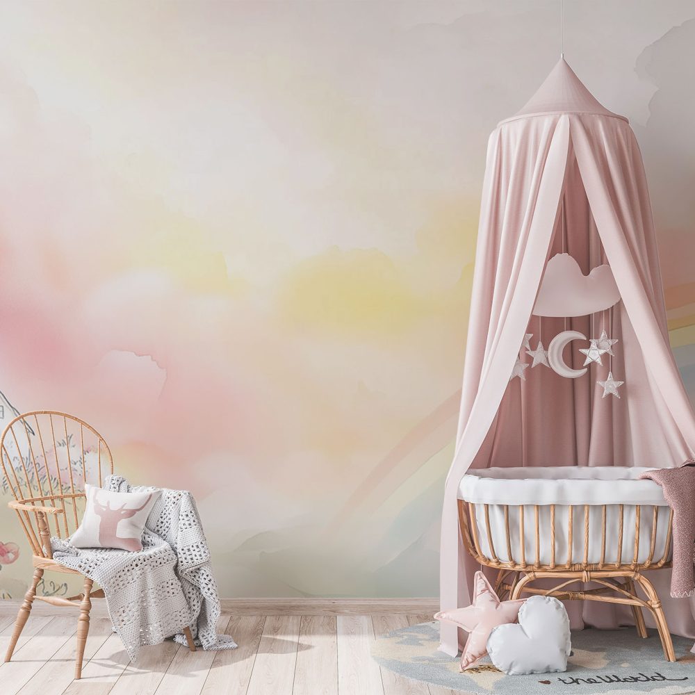 Terug naar collectie / Behang / Kinderkamer behang / Babykamer behang / Pastel regenbooghuis op heuvel behang