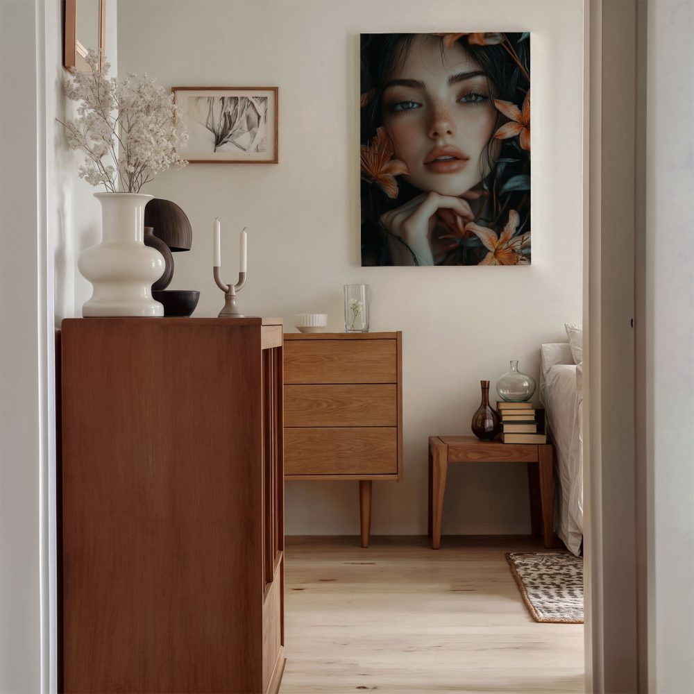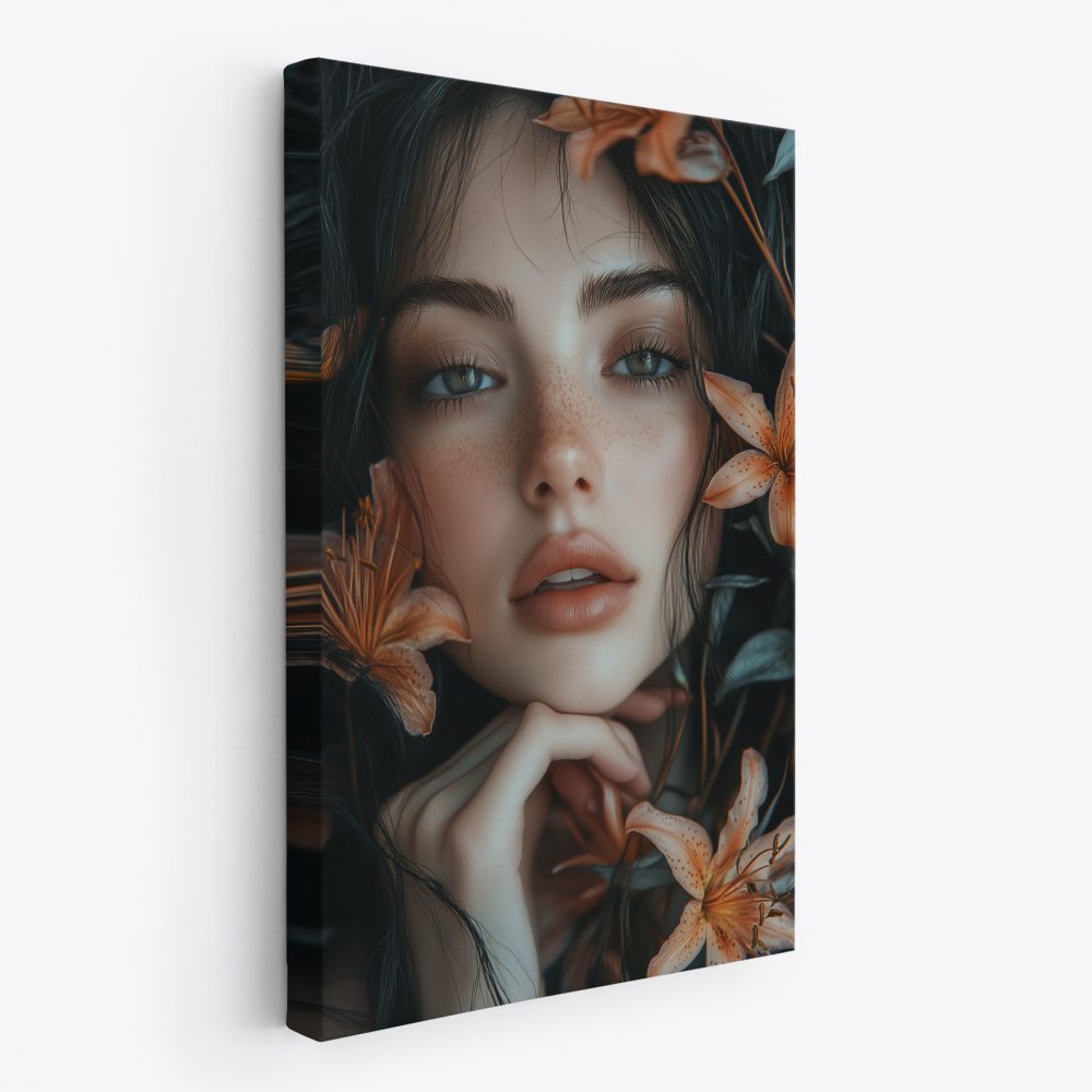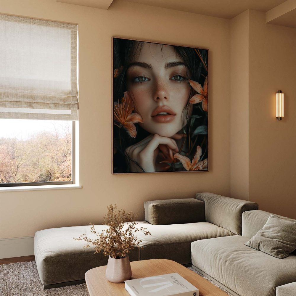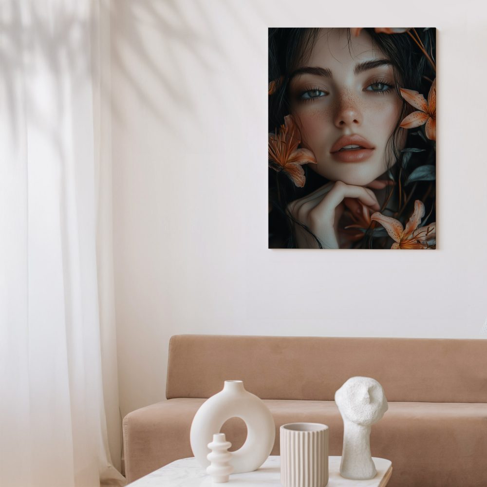 Terug naar collectie / Schilderijen / Bloemen Schilderij / Pensieve vrouw met oranje bloemen