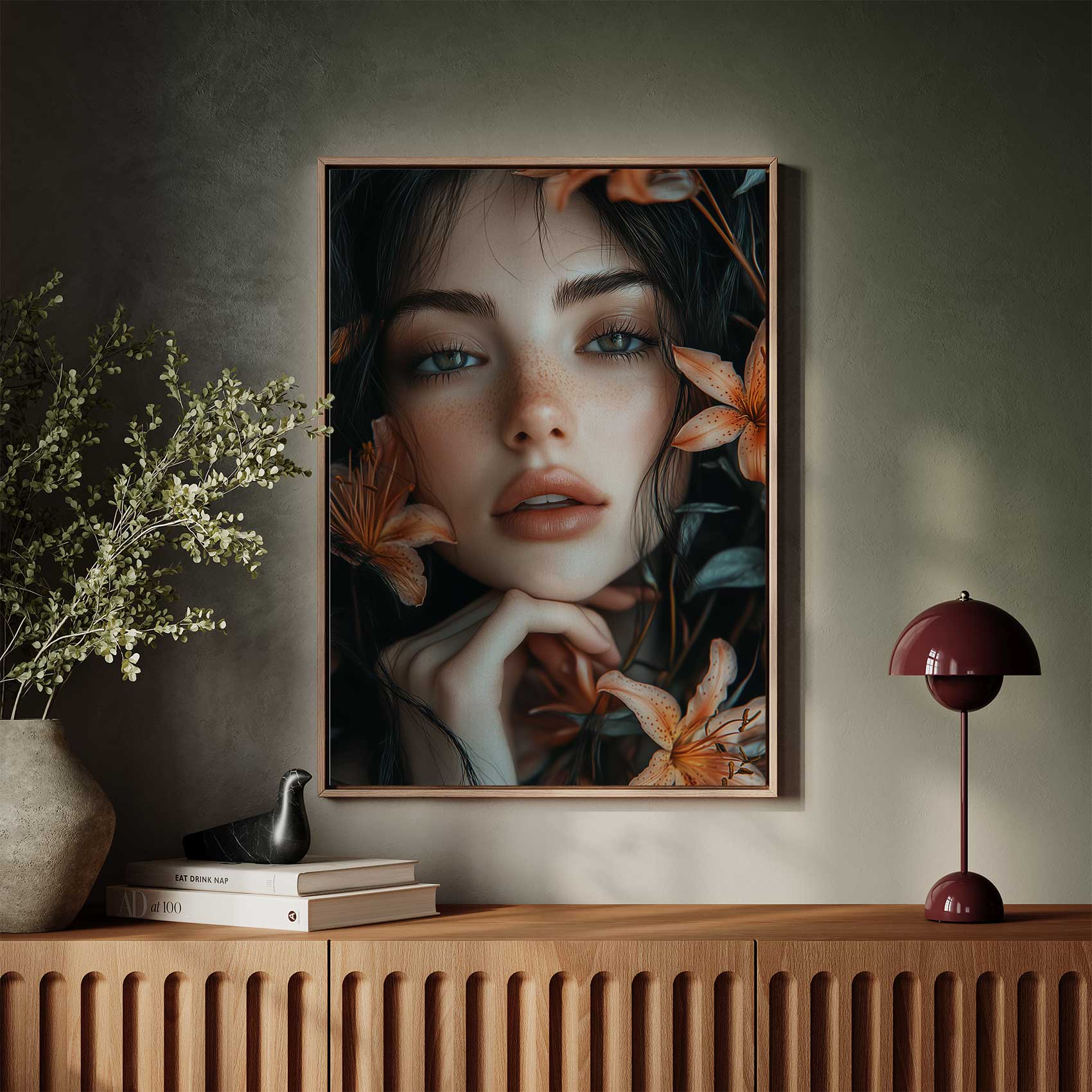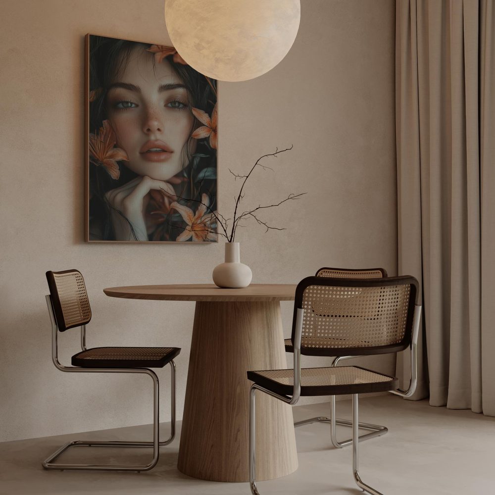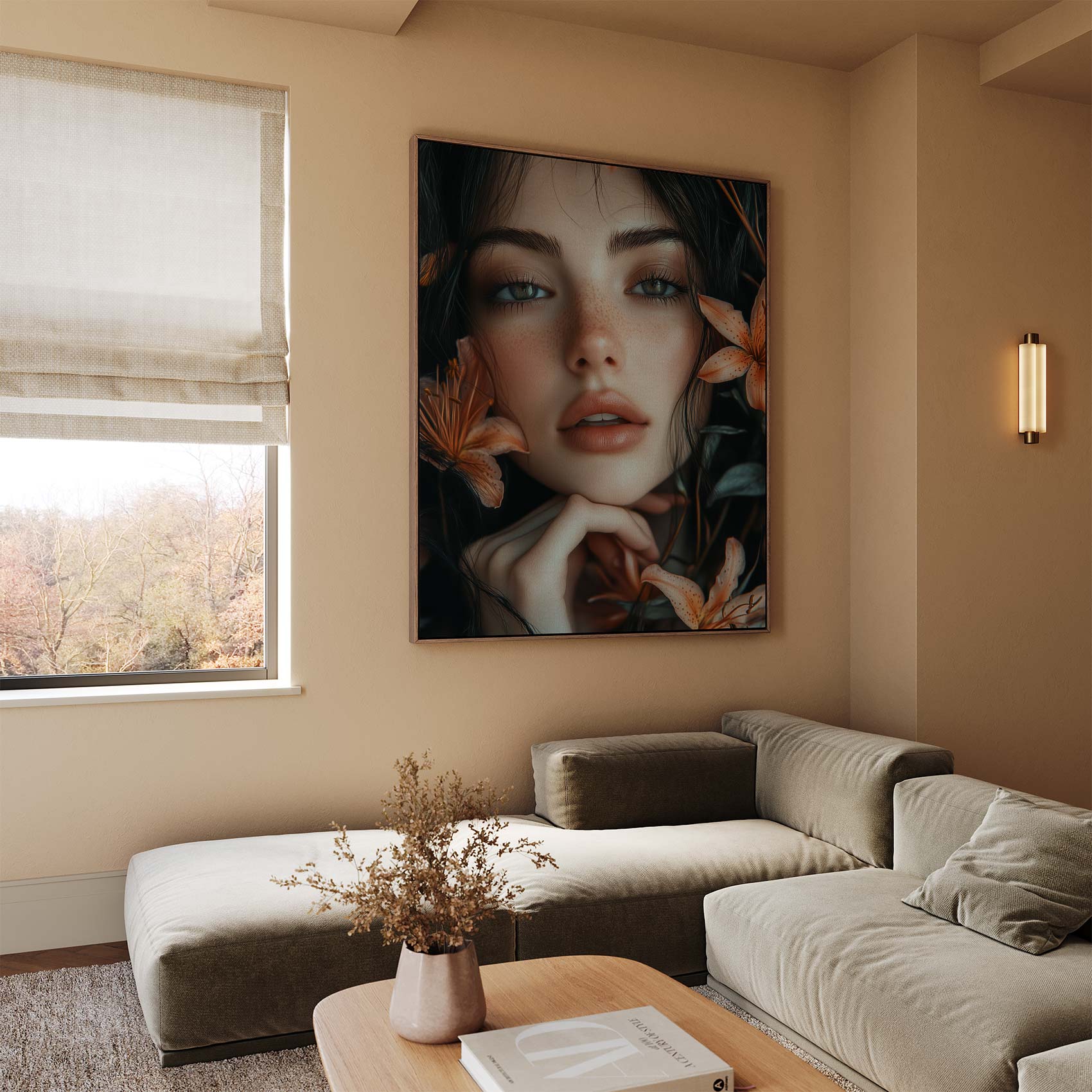 Terug naar collectie / Schilderijen / Bloemen Schilderij / Pensieve vrouw met oranje bloemen