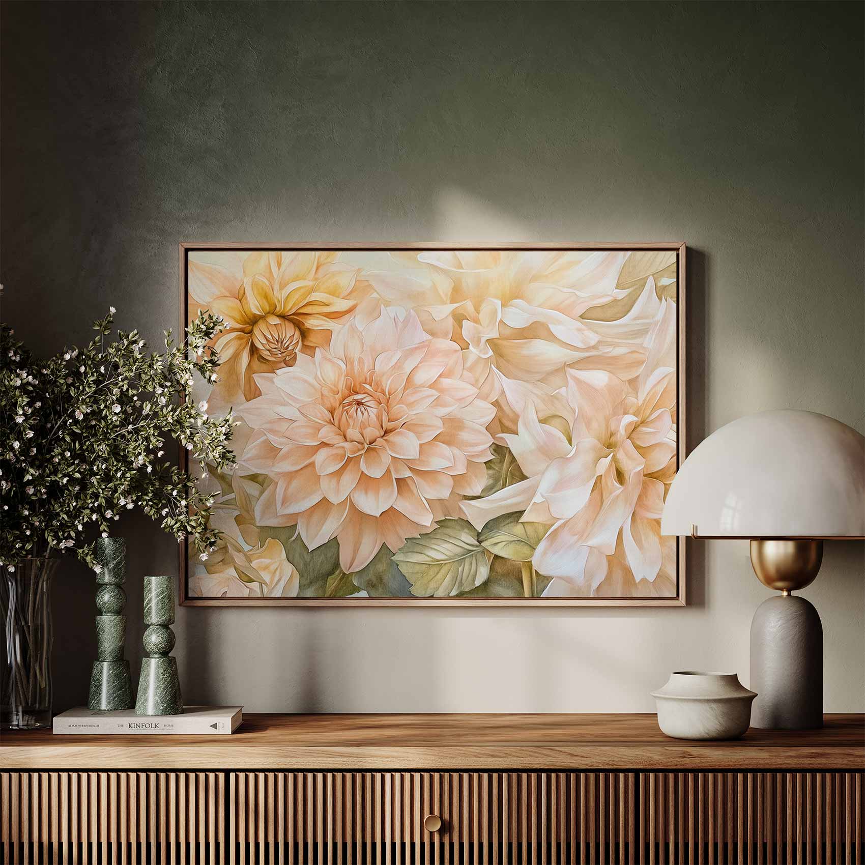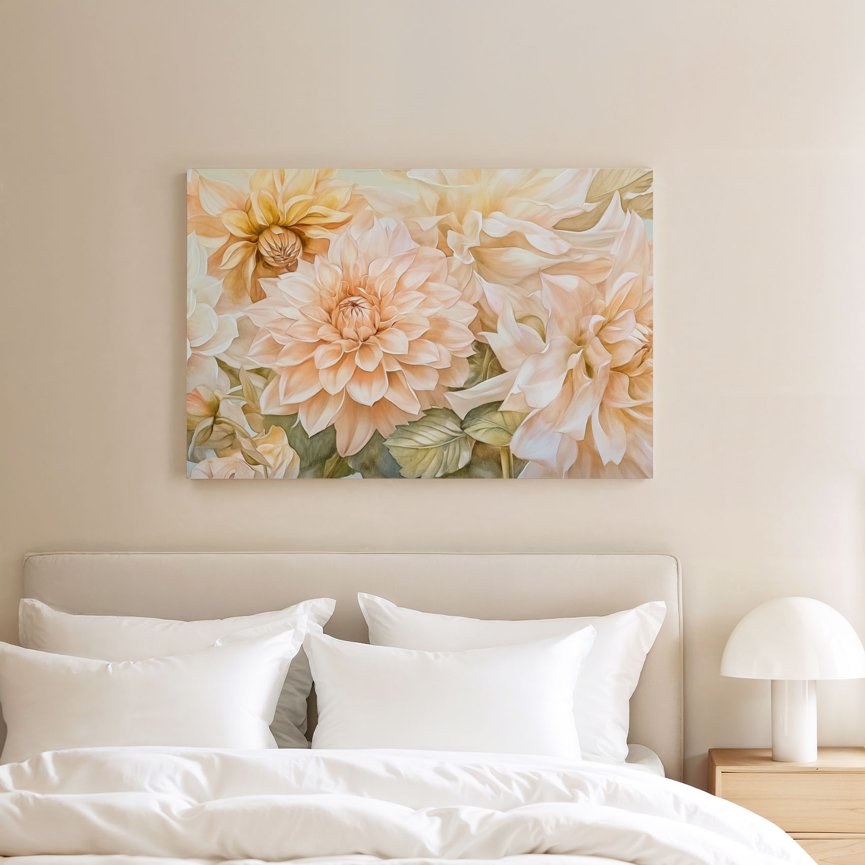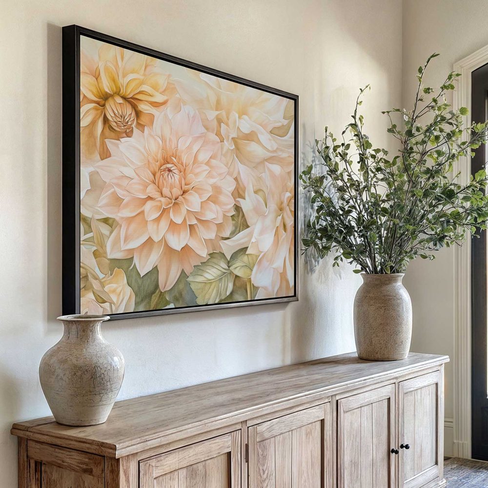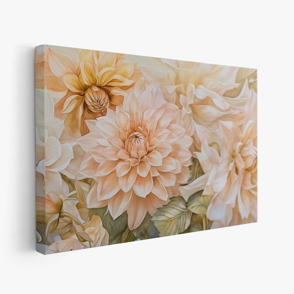 Terug naar collectie / Schilderijen / Bloemen Schilderij / Prachtige witte en perzik dahlia’s