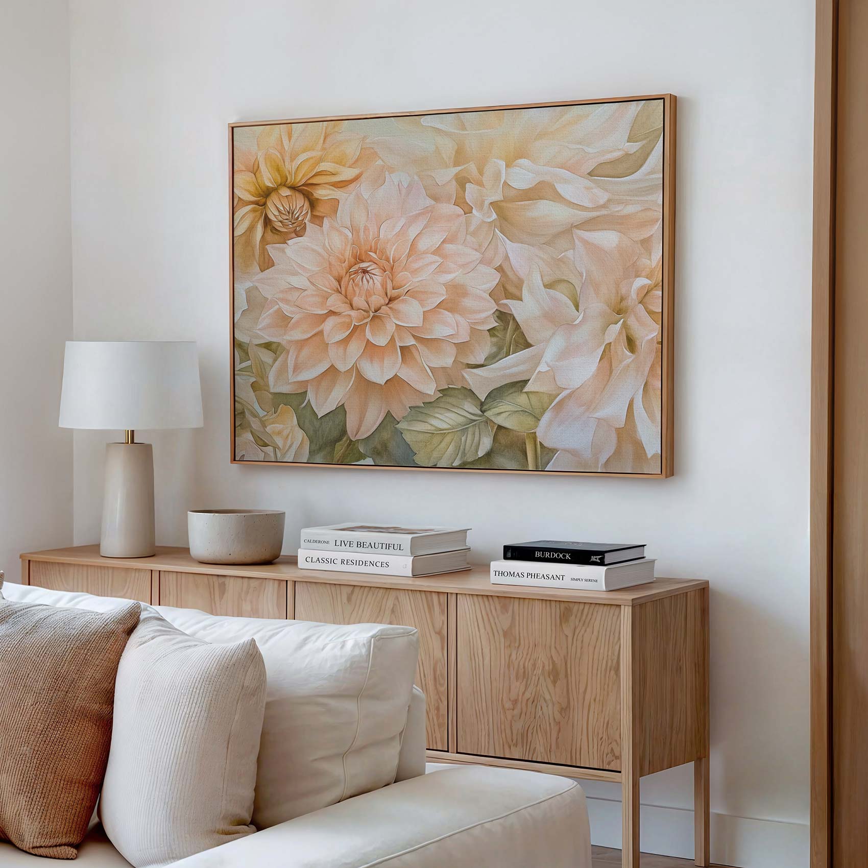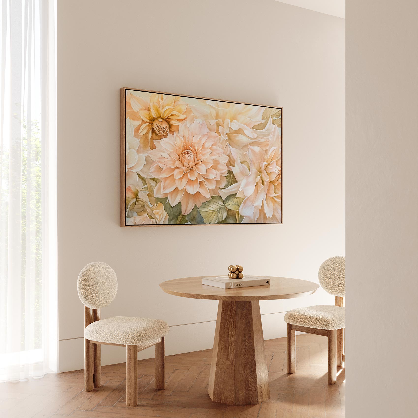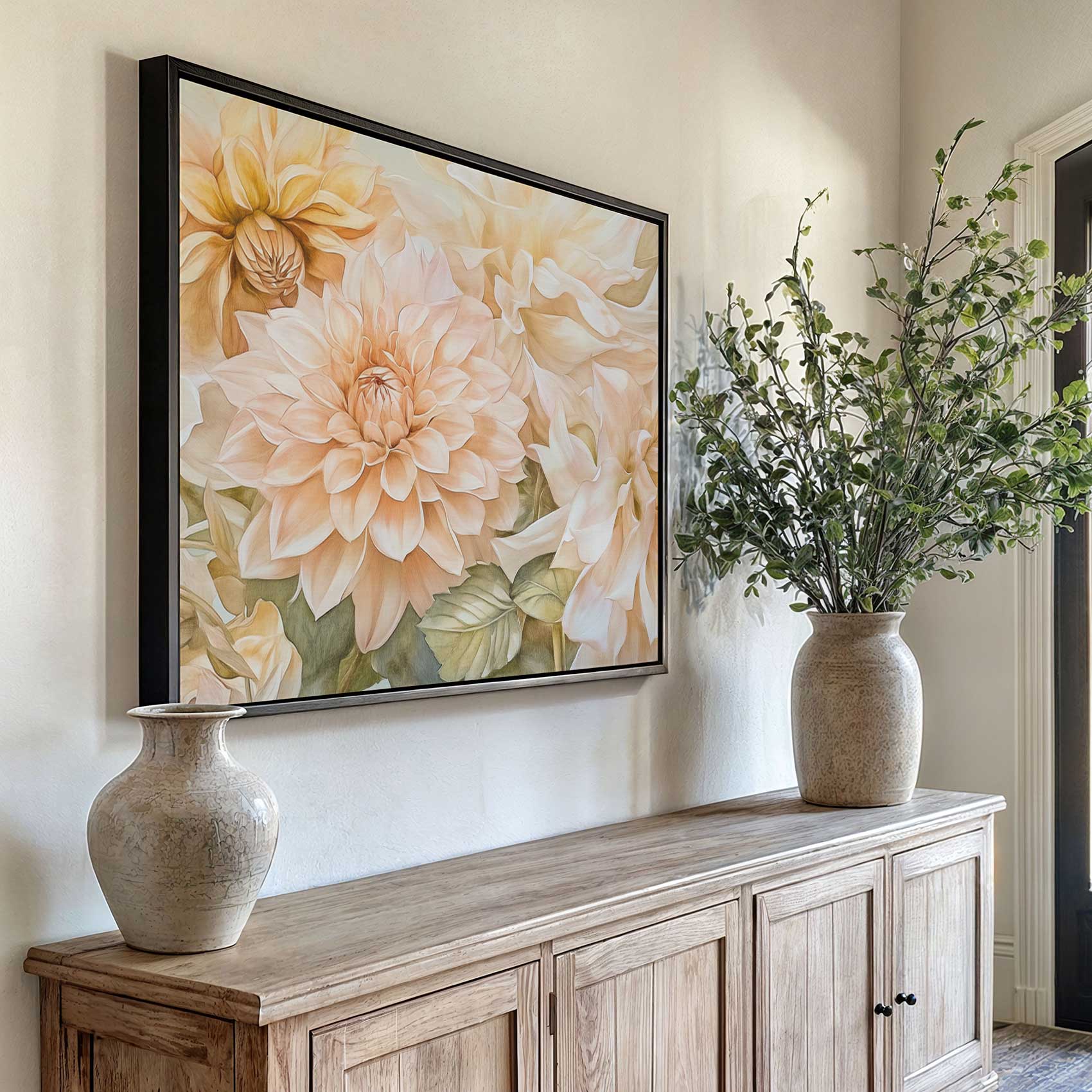 Terug naar collectie / Schilderijen / Bloemen Schilderij / Prachtige witte en perzik dahlia’s