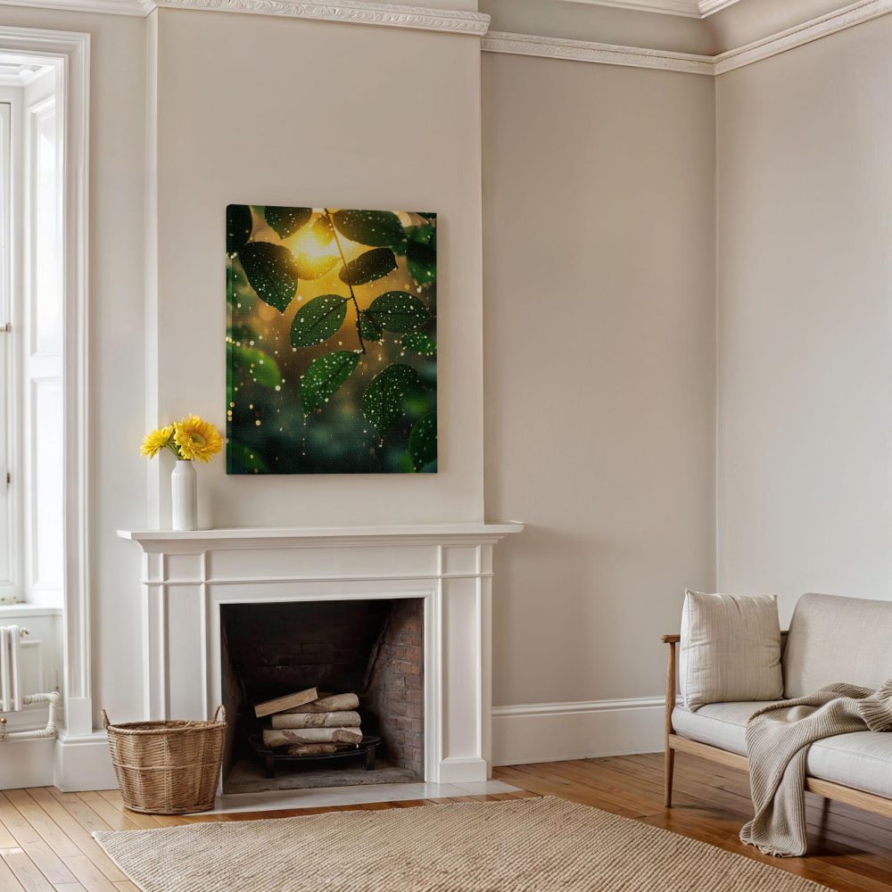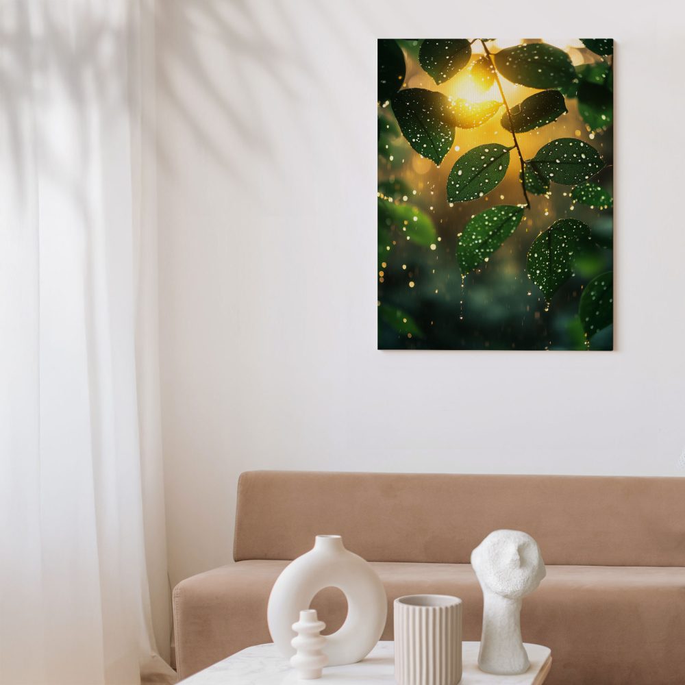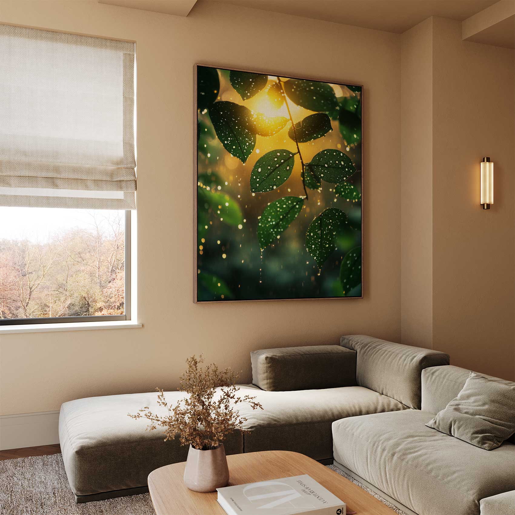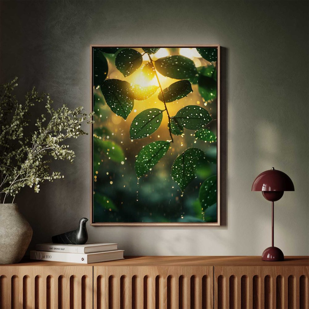 Terug naar collectie / Schilderijen / Bloemen Schilderij / Regendruppels op Zonverlichte Bladeren