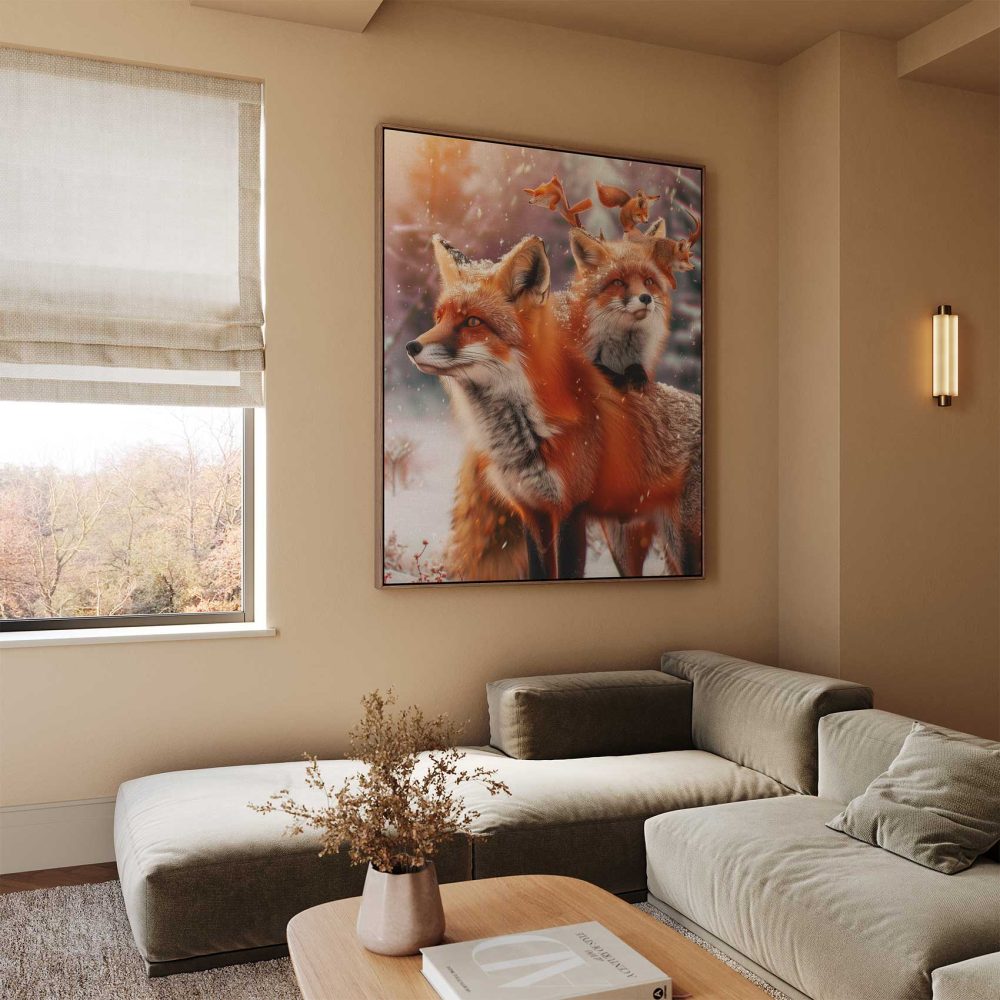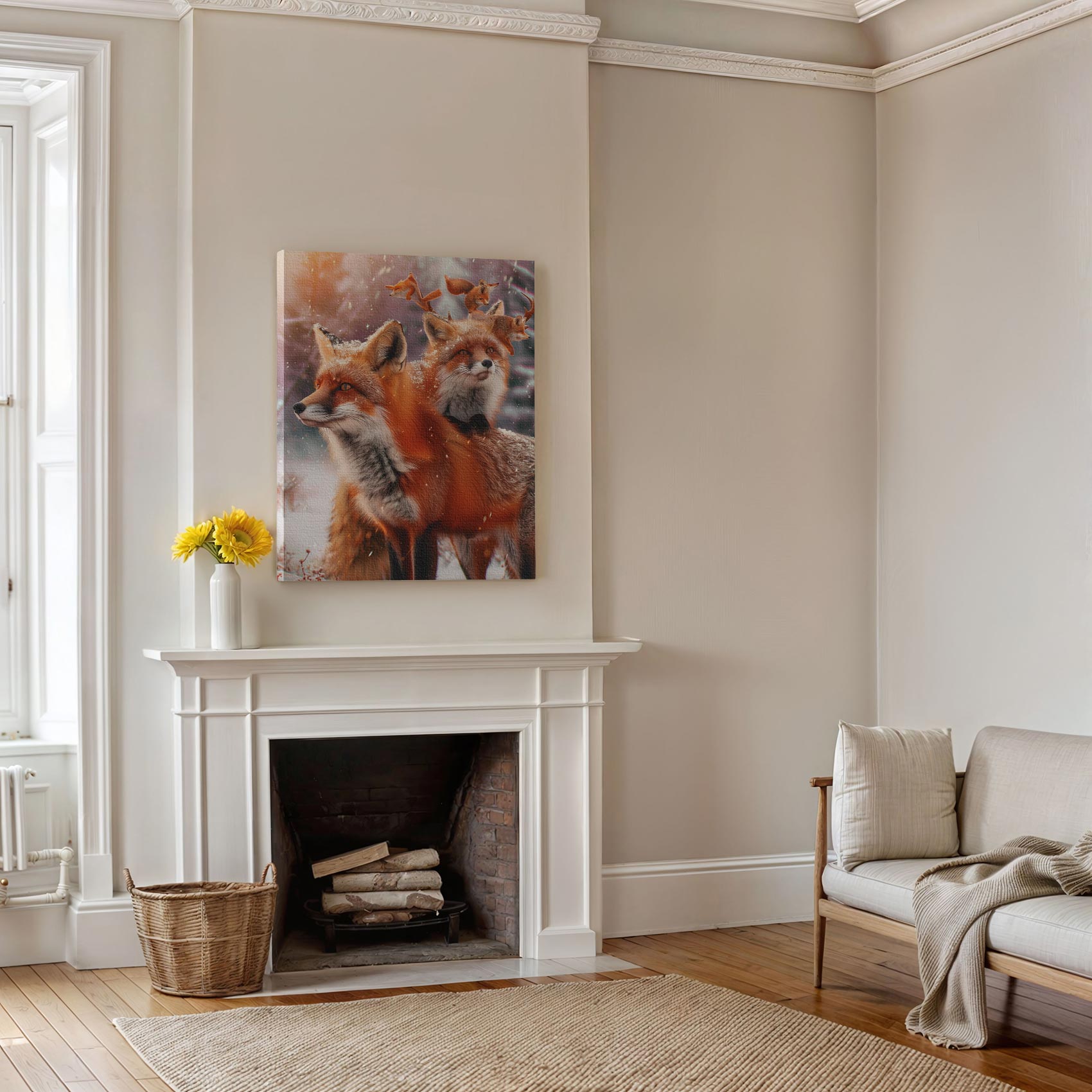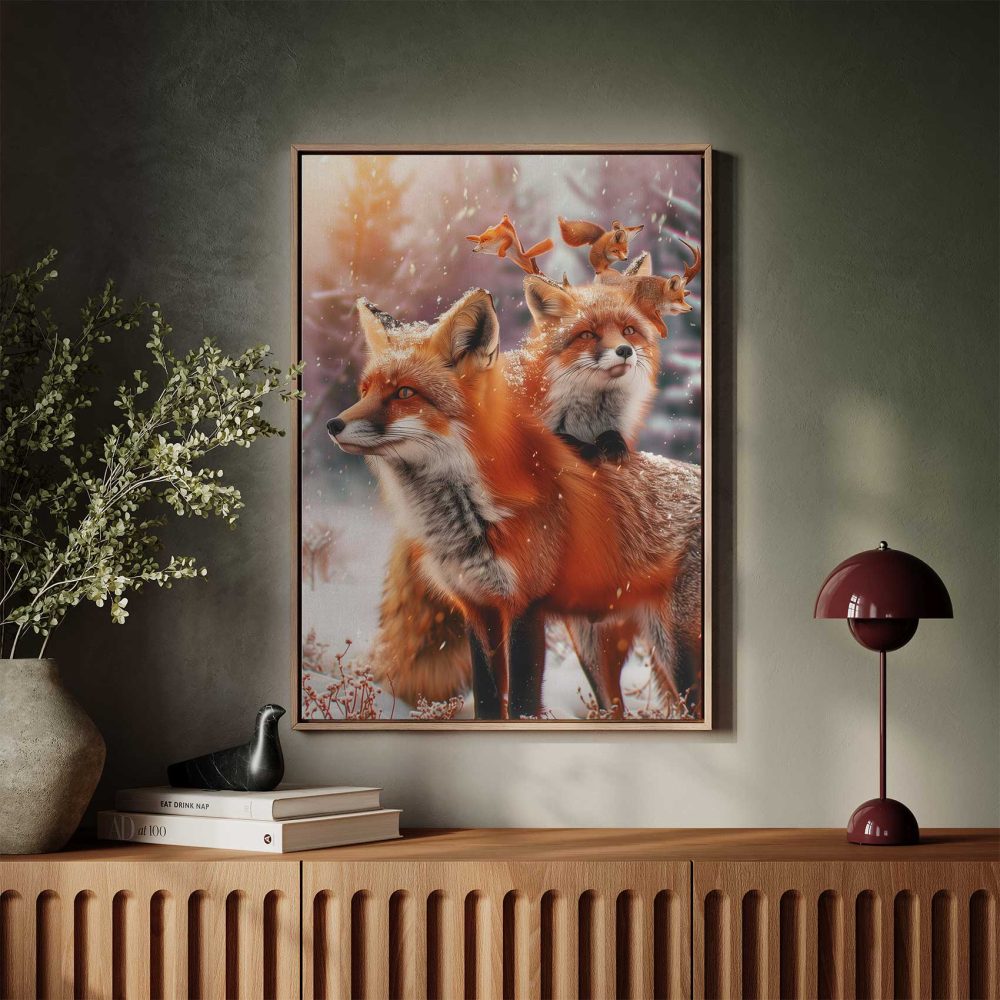 Terug naar collectie / Schilderijen / Bossen Schilderij / Rode vossen in besneeuwd bos