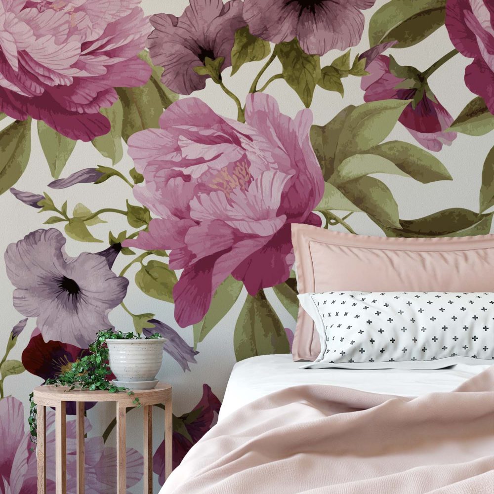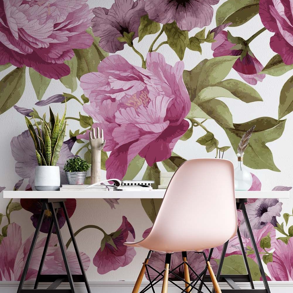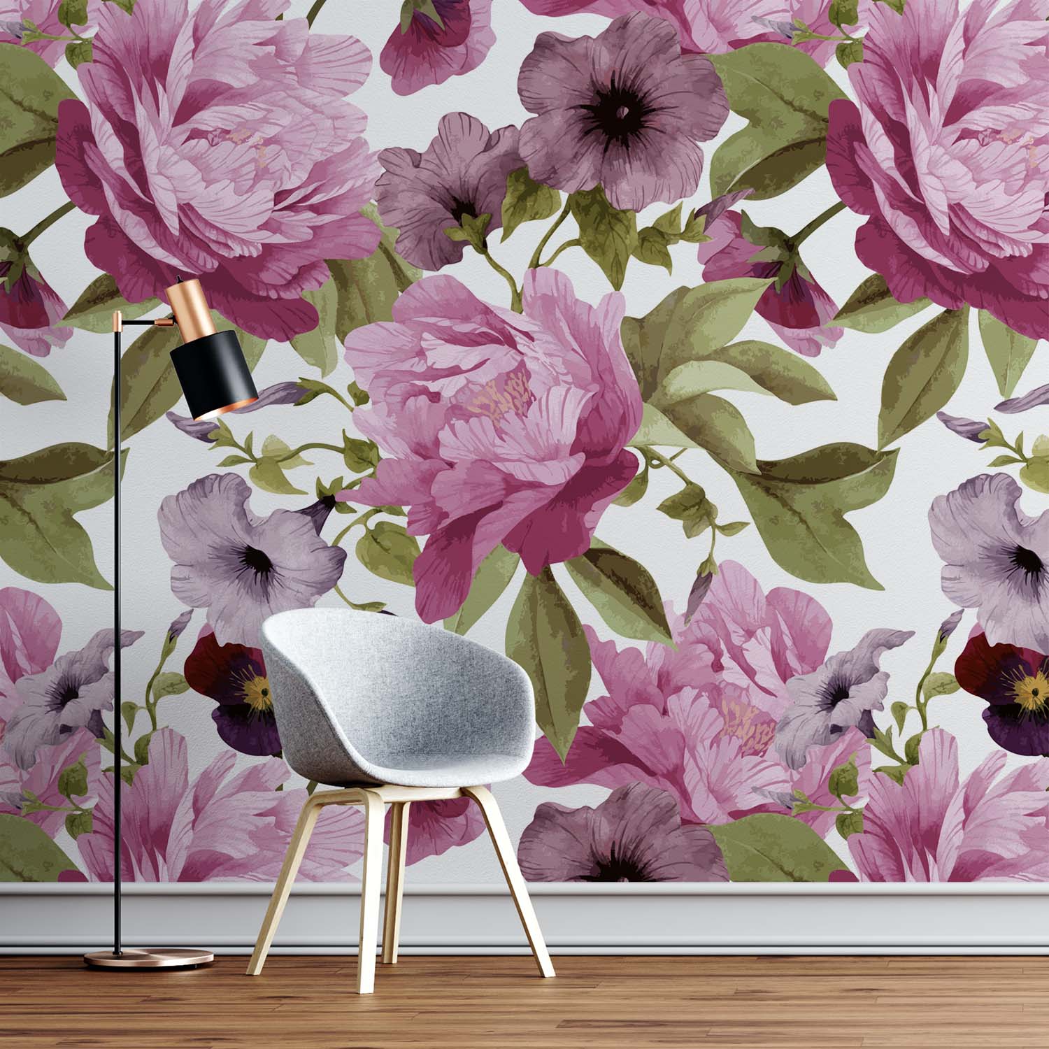 Terug naar collectie / Behang / Roze Bloemen Behang met Paarse Accenten