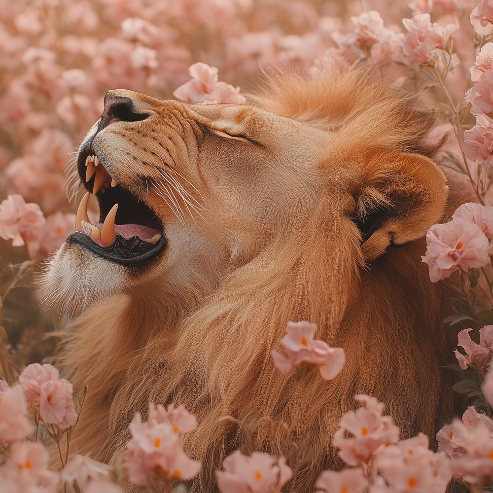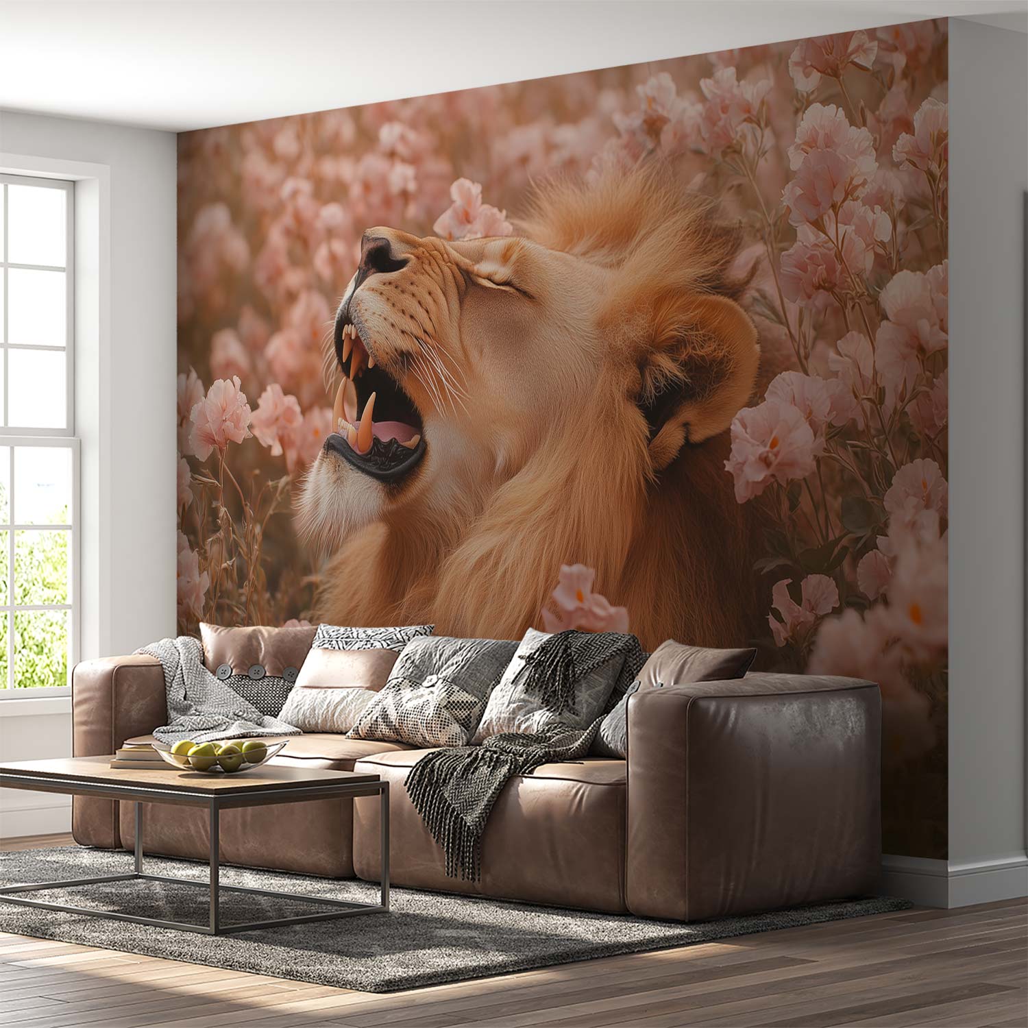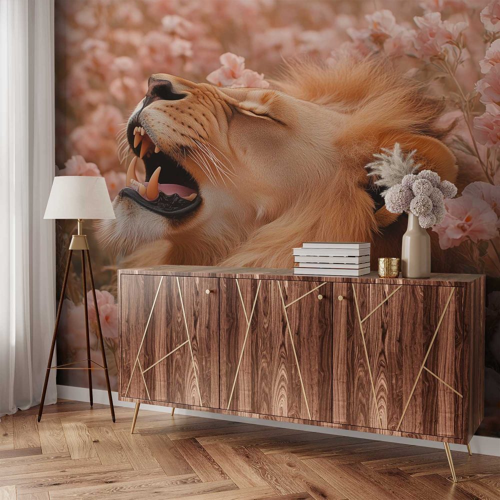 Roze bloemen leeuwensfeer behang