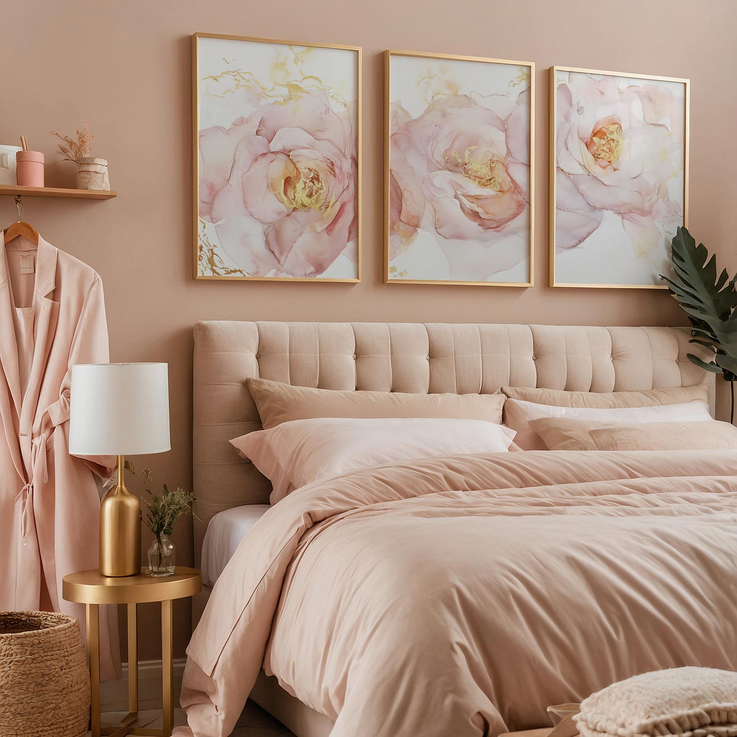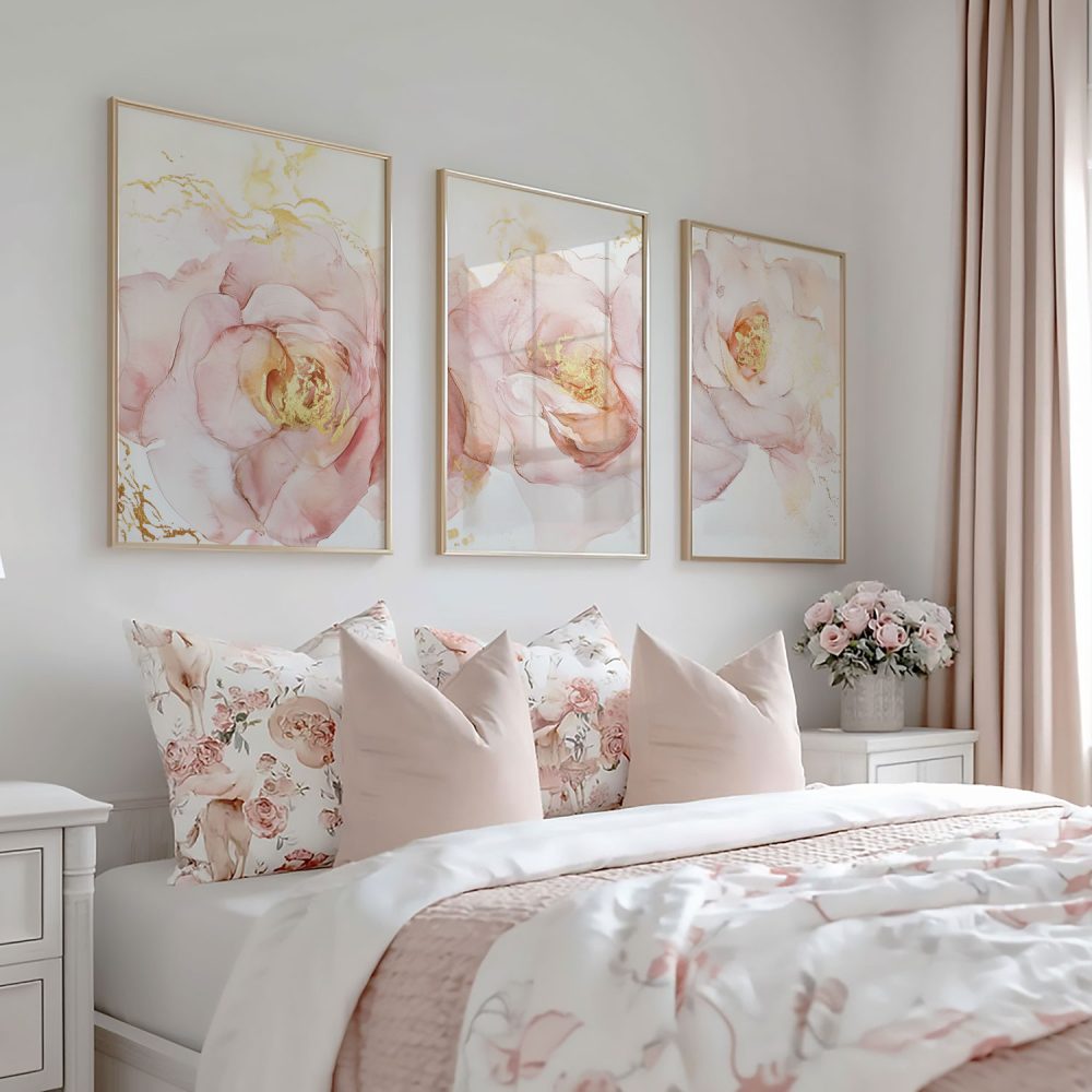 Roze Bloemen met Gouden Toets – Elegante Wanddecoratie