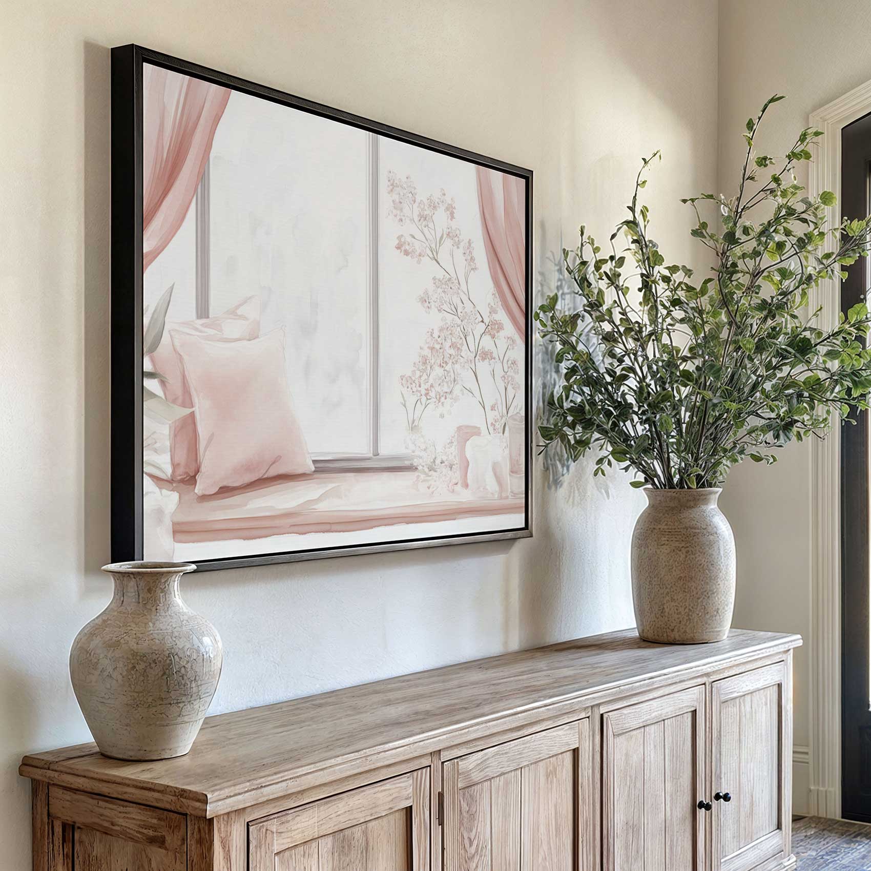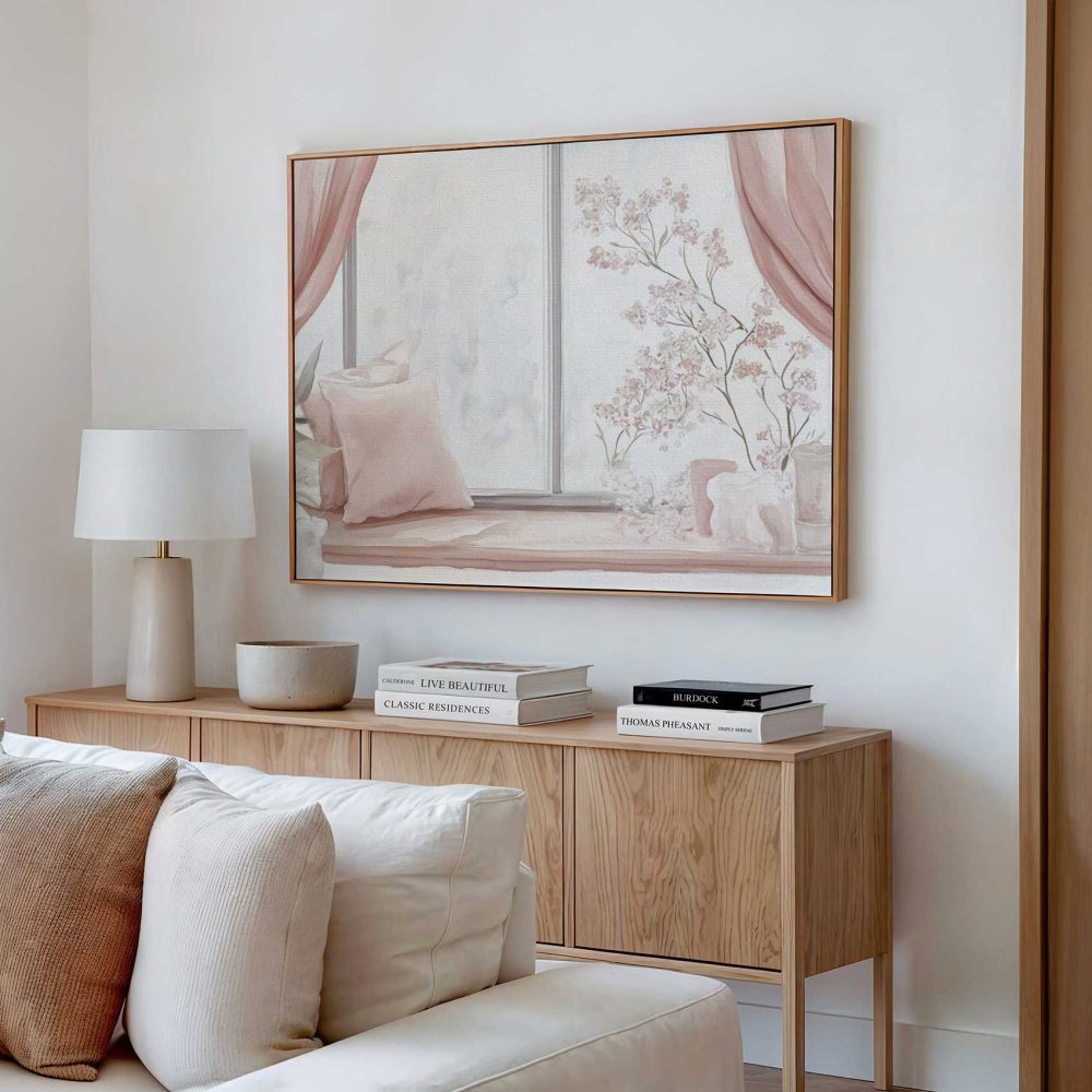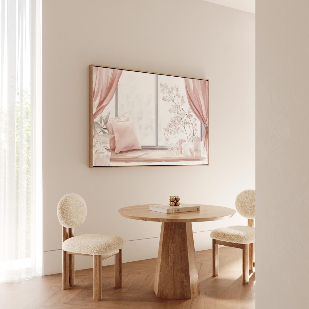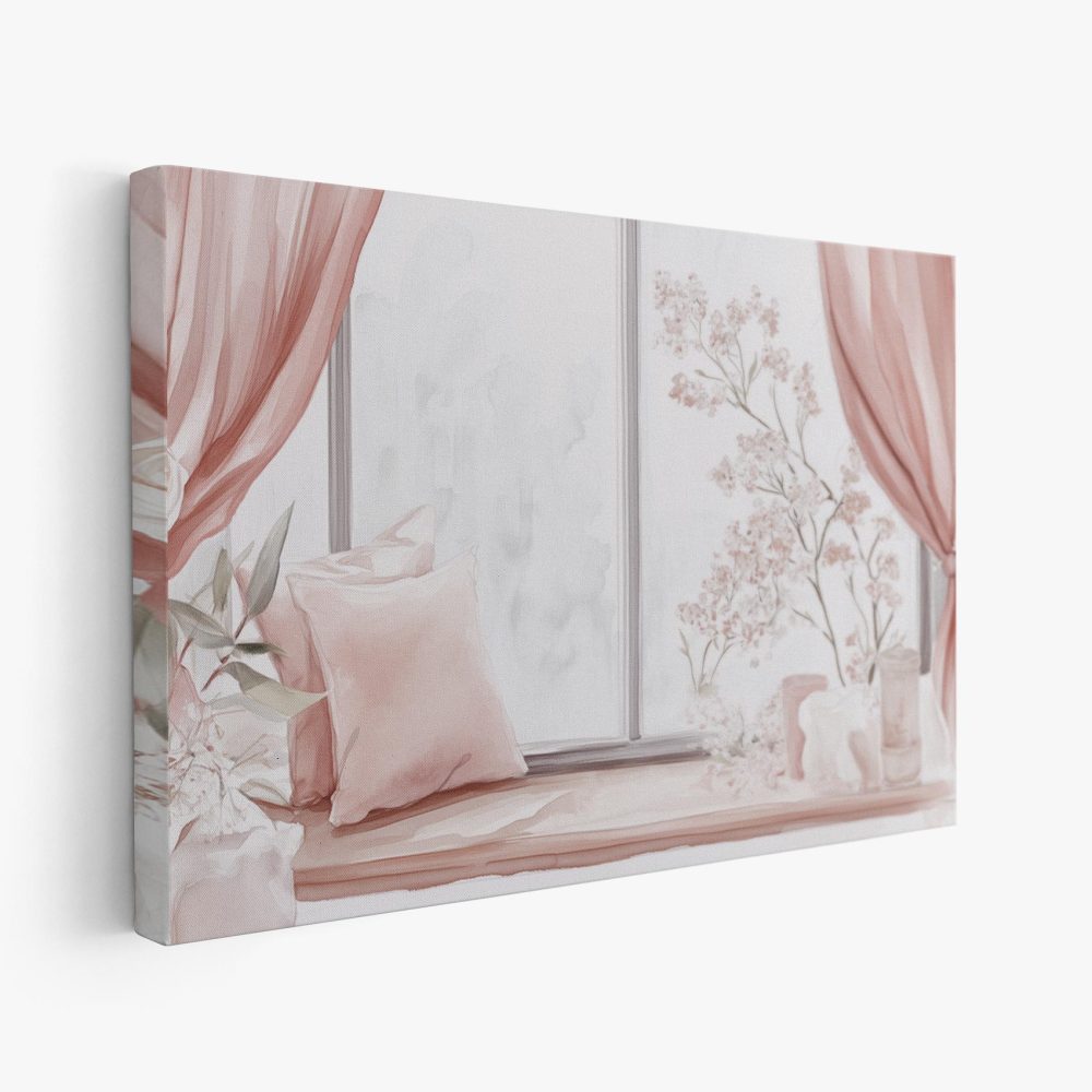Terug naar collectie / Schilderijen / Bloemen Schilderij / Roze bloemen raamdecoratie