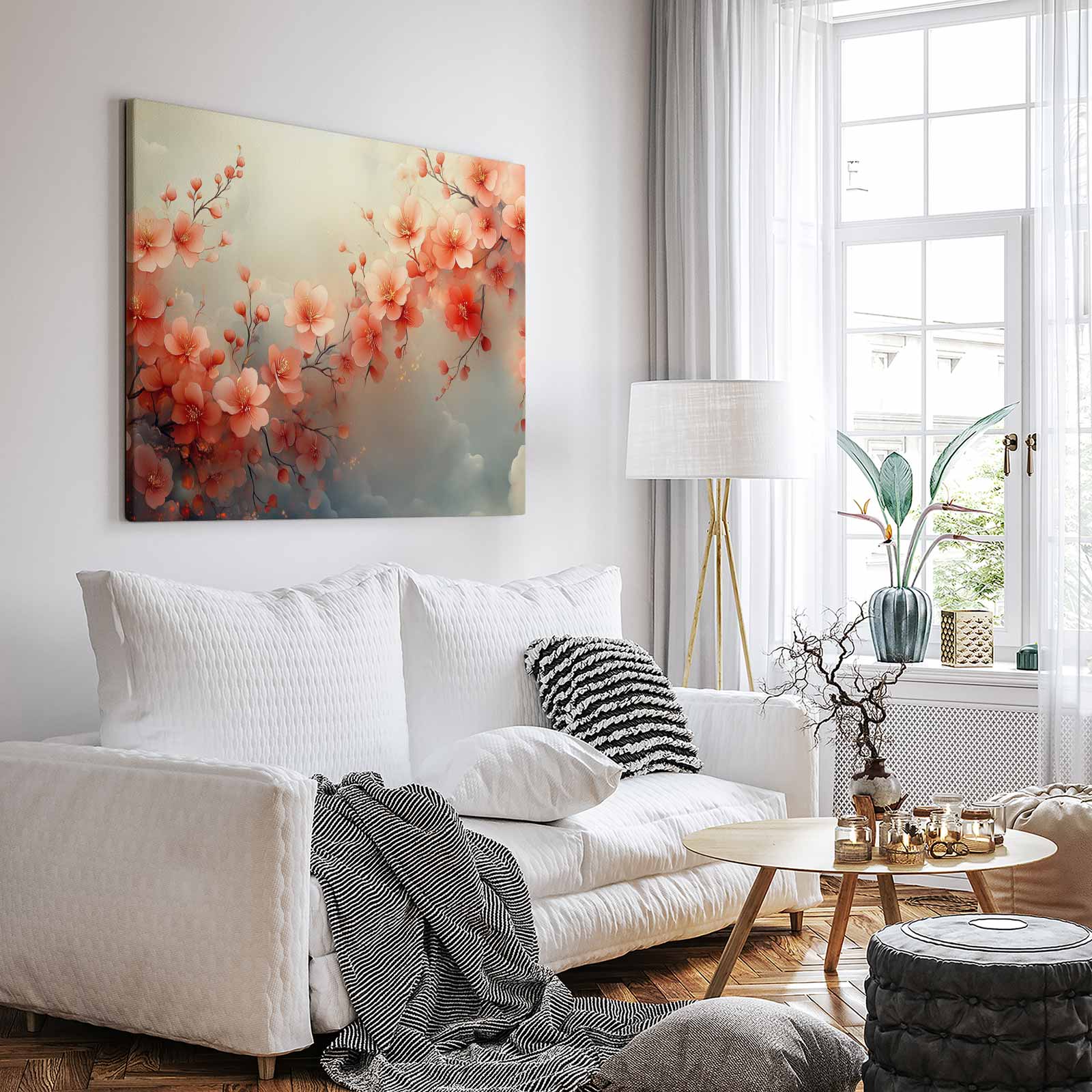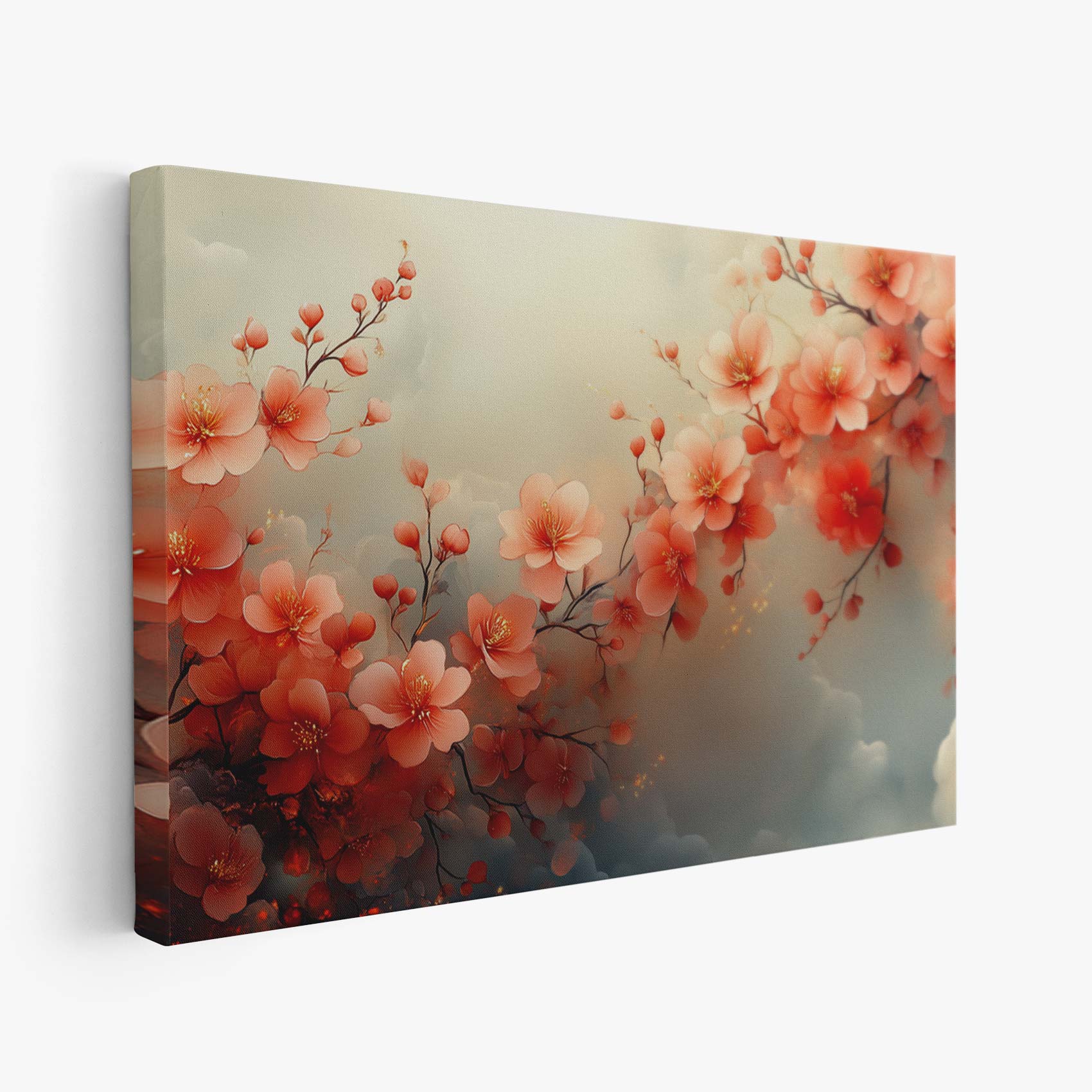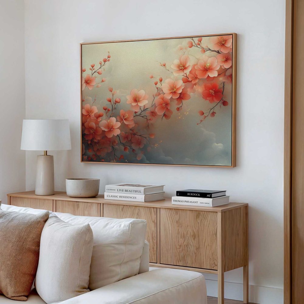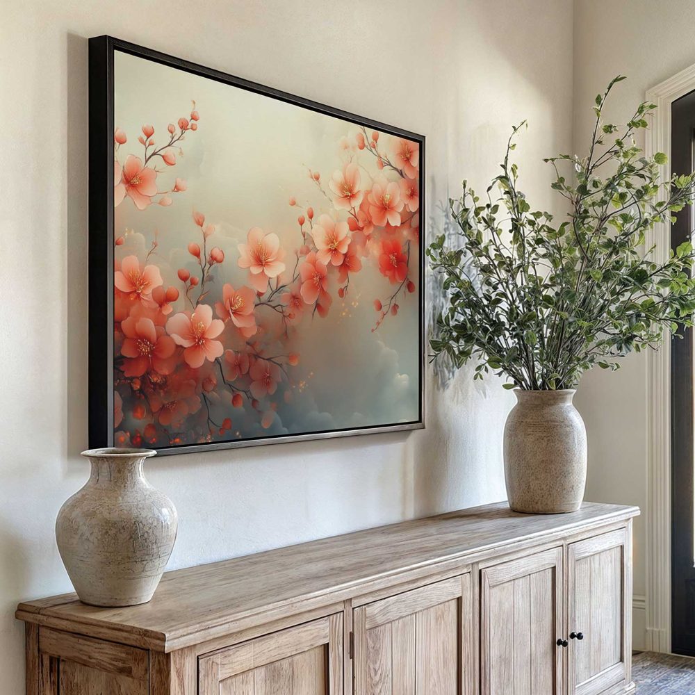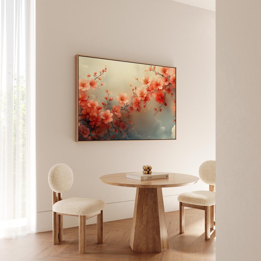 Terug naar collectie / Schilderijen / Bloemen Schilderij / Roze bloesem op blauwe achtergrond