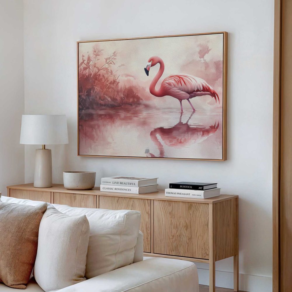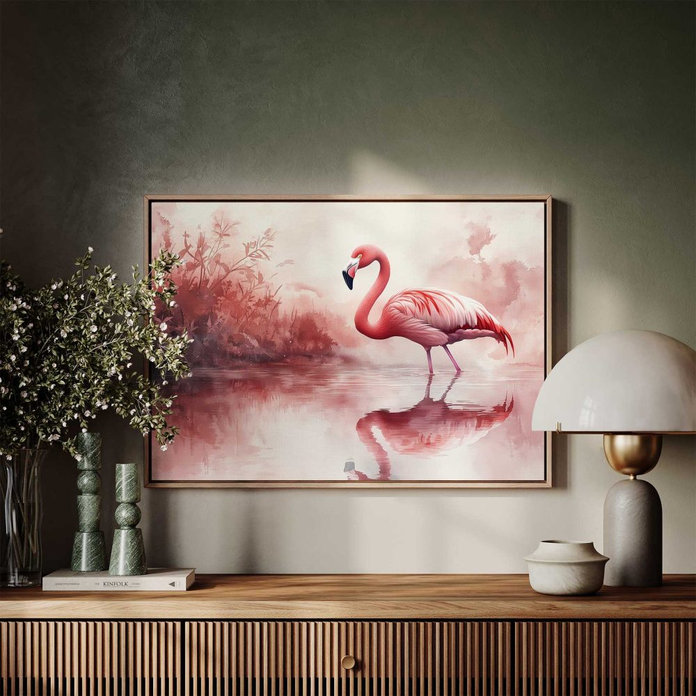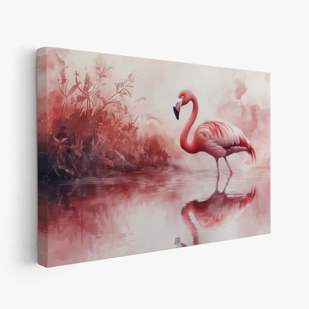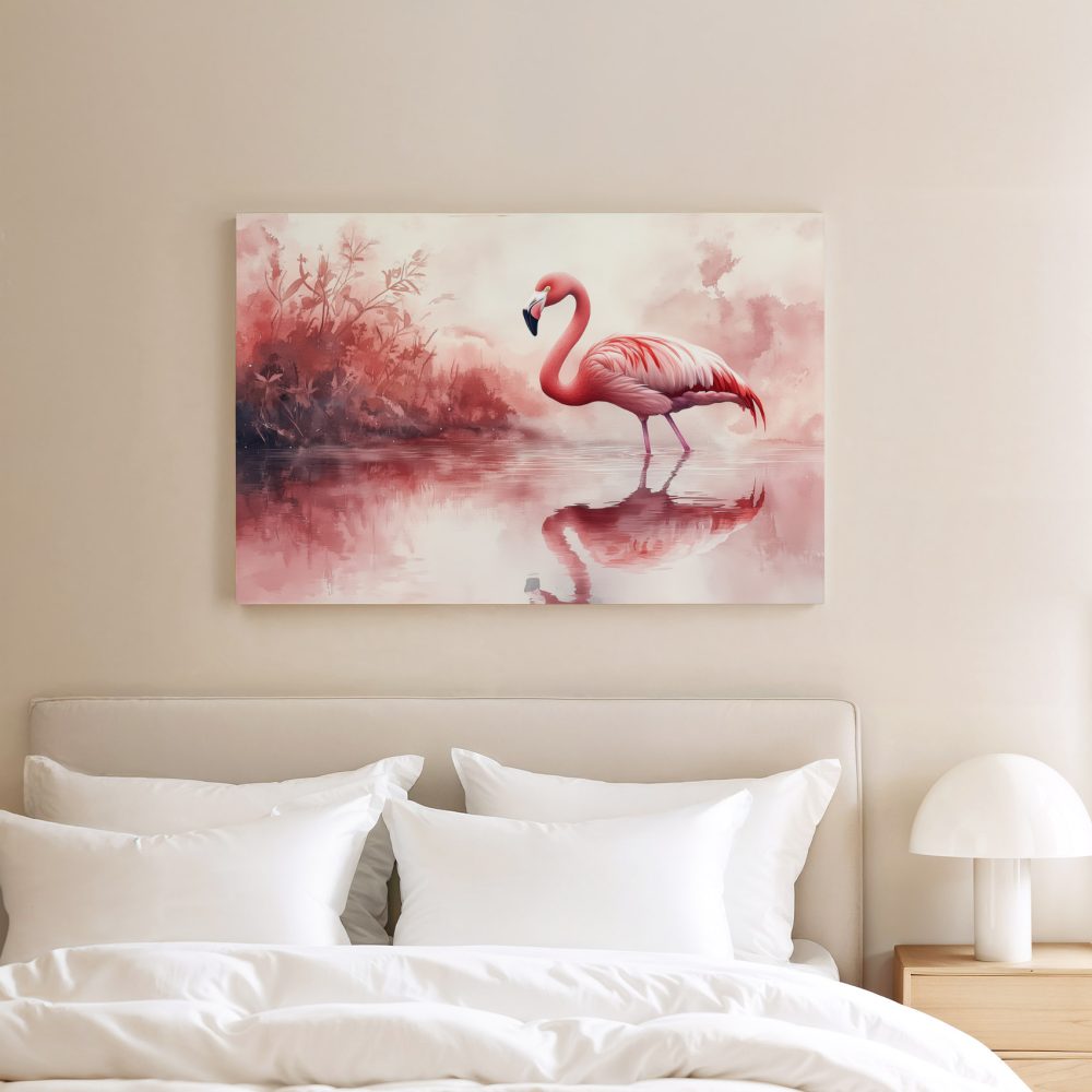 Terug naar collectie / Schilderijen / Dieren Schilderij / Roze flamingo in waterreflectie