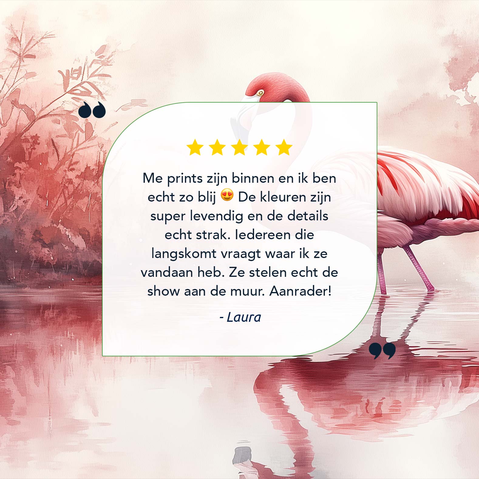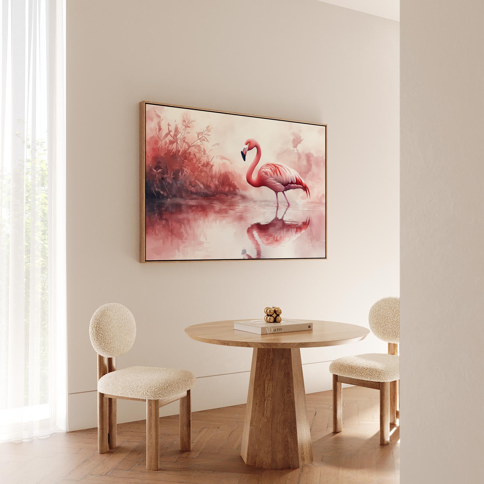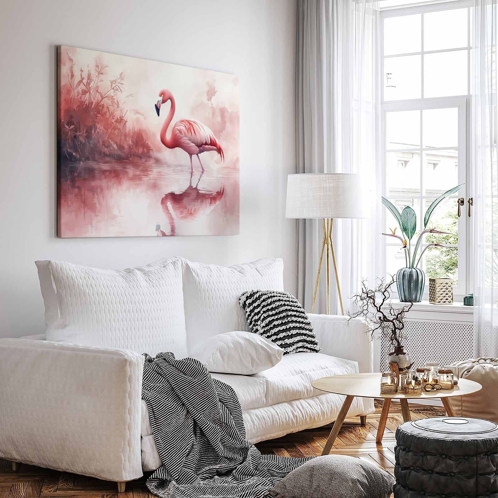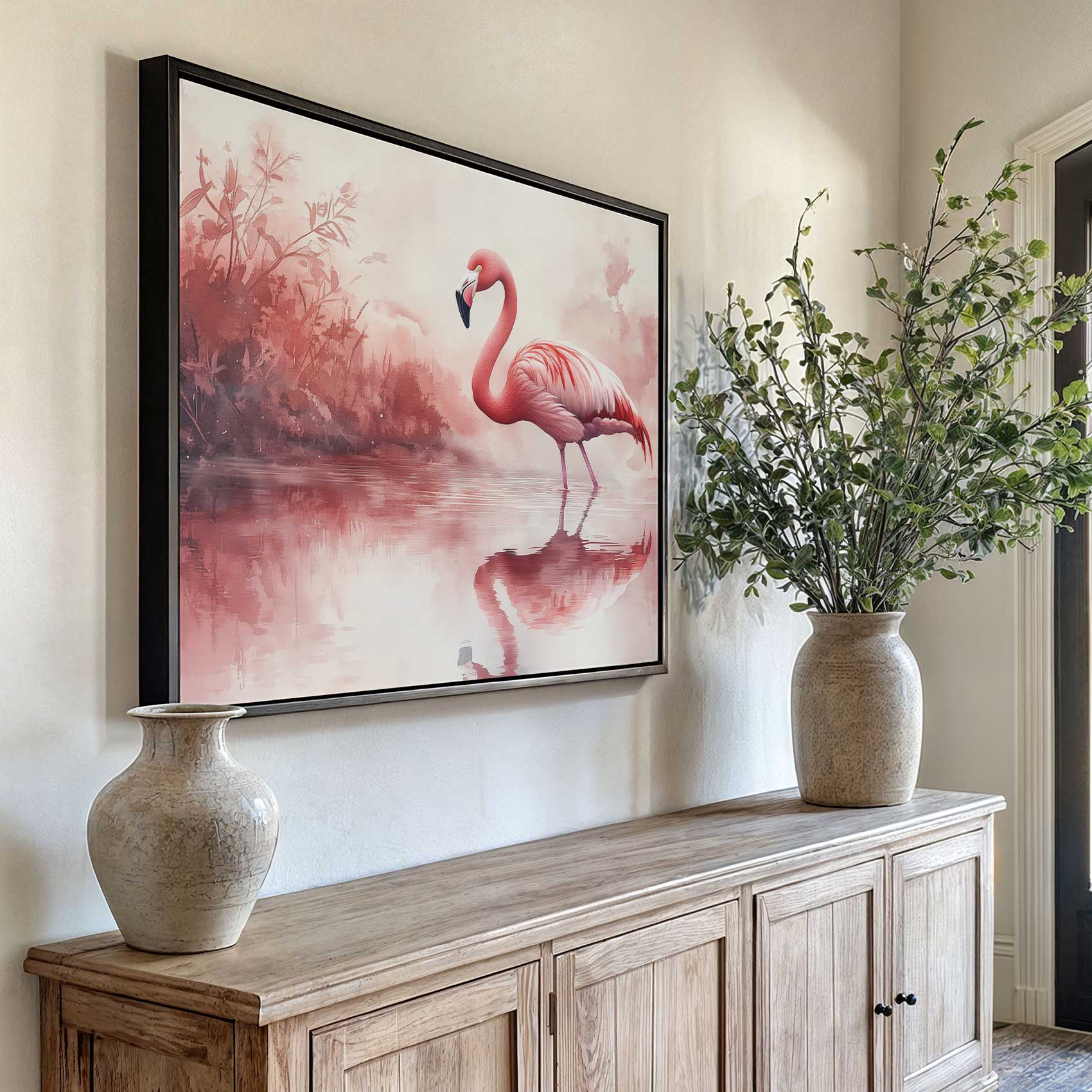 Terug naar collectie / Schilderijen / Dieren Schilderij / Roze flamingo in waterreflectie