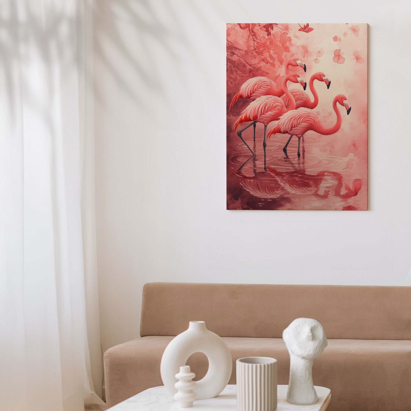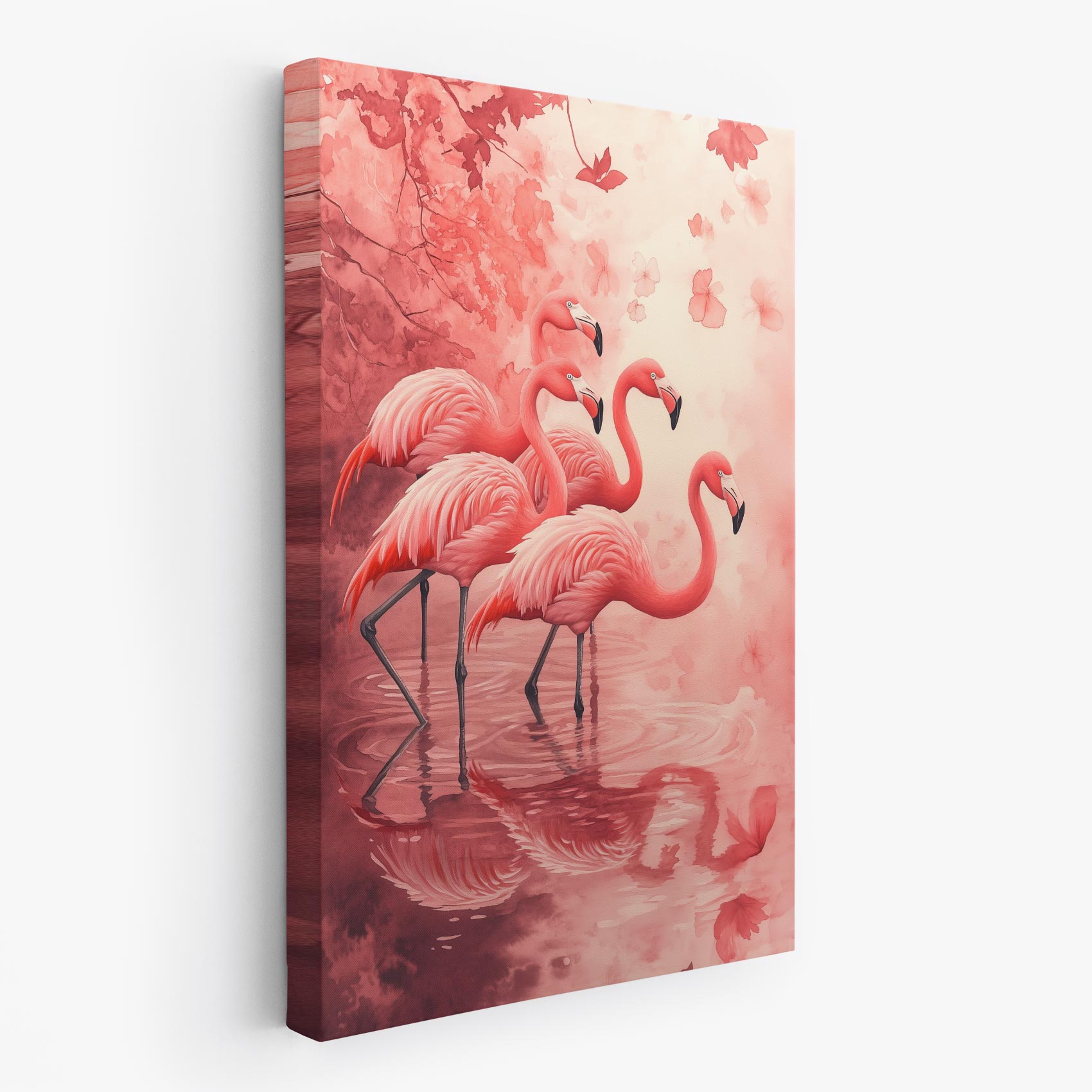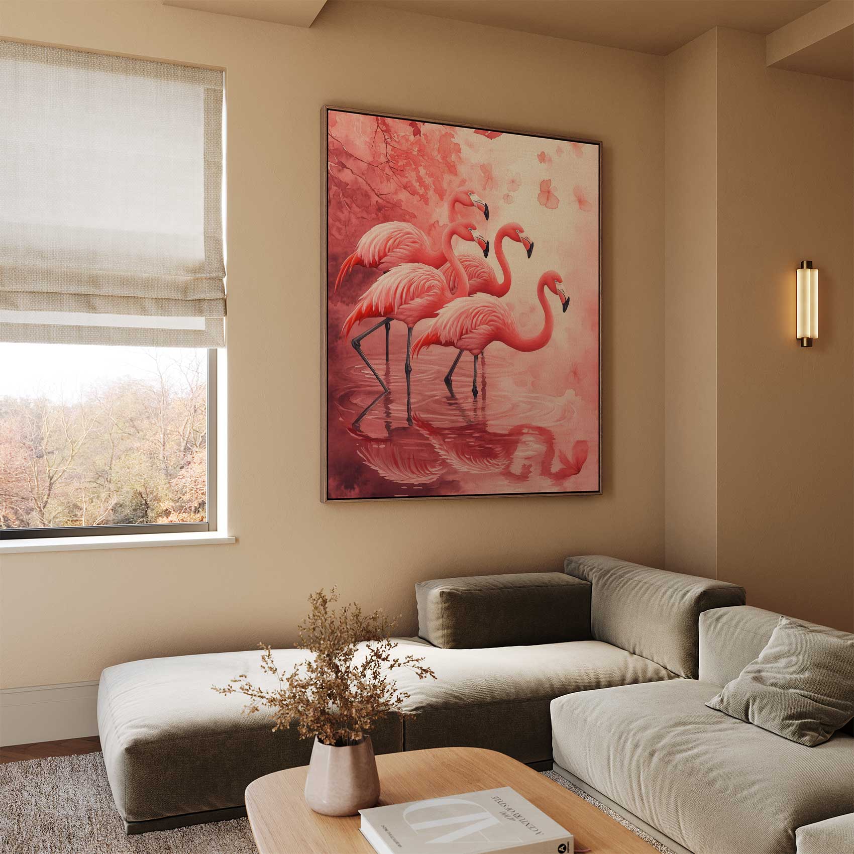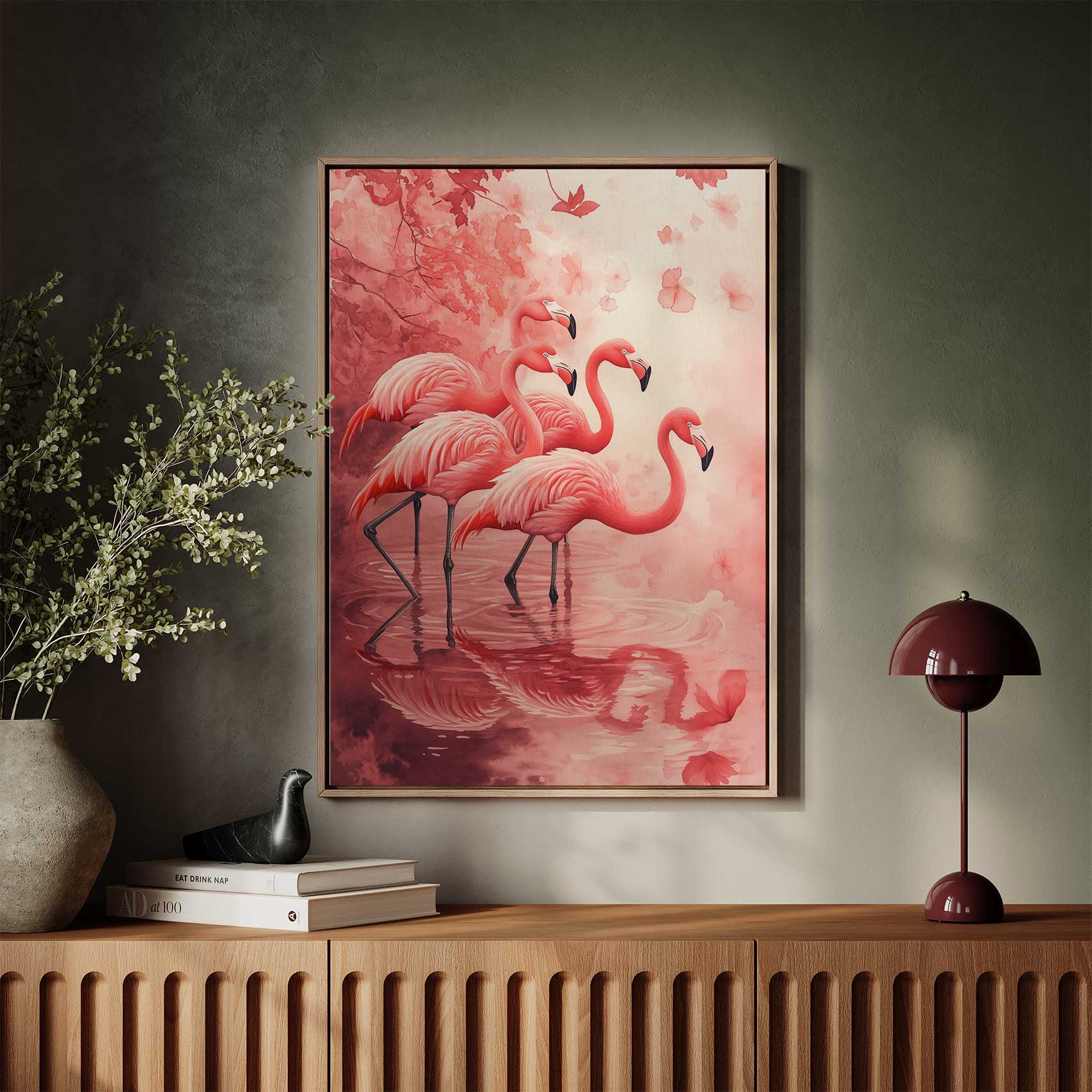 Terug naar collectie / Schilderijen / Bloemen Schilderij / Roze flamingo’s in bloemenwater