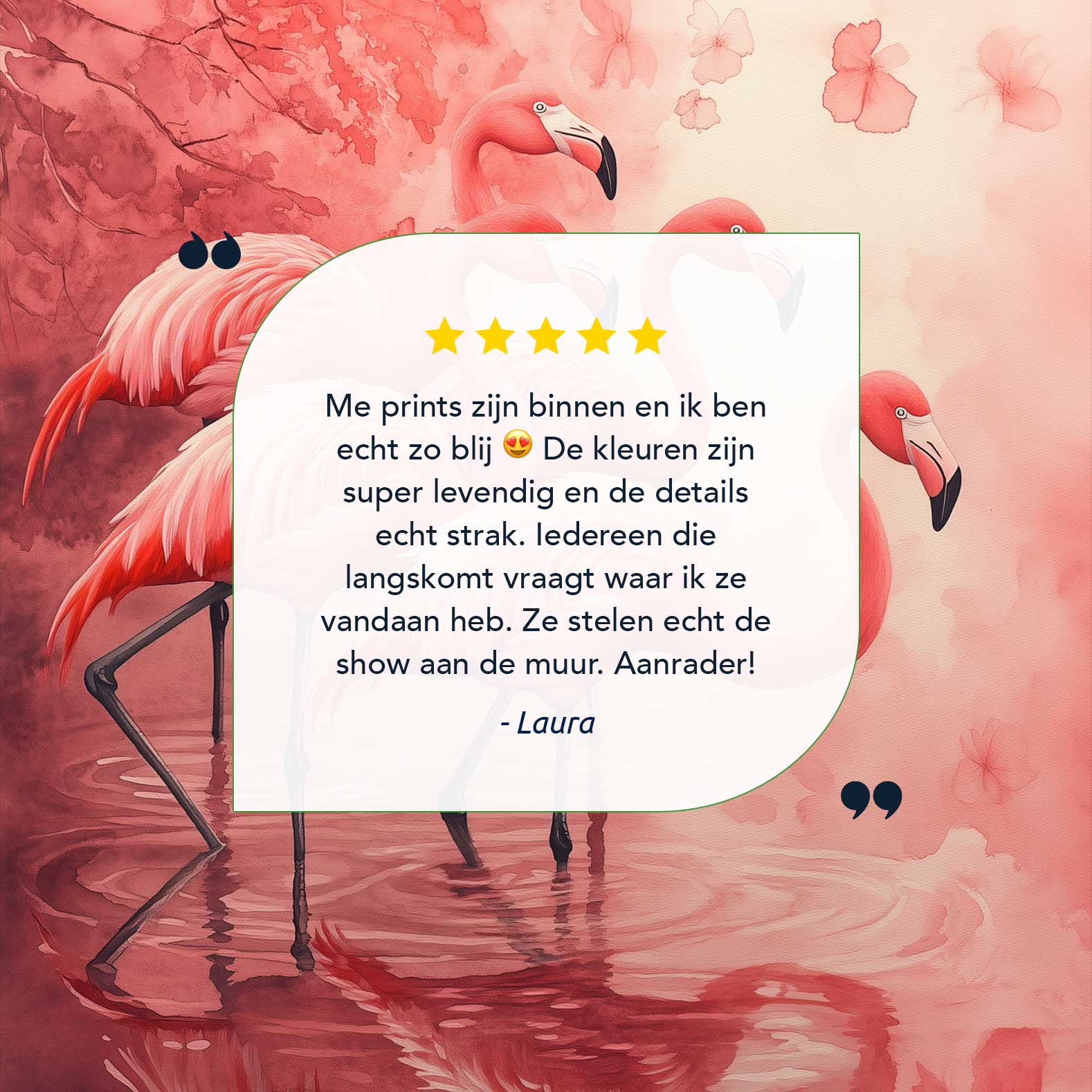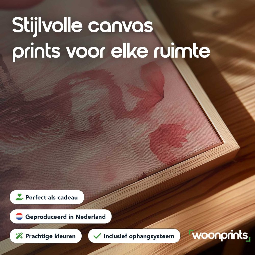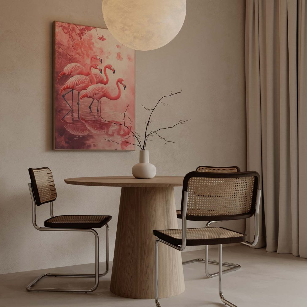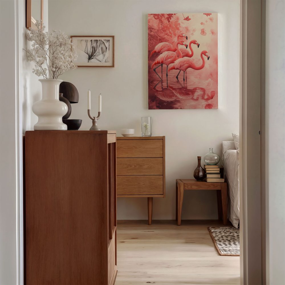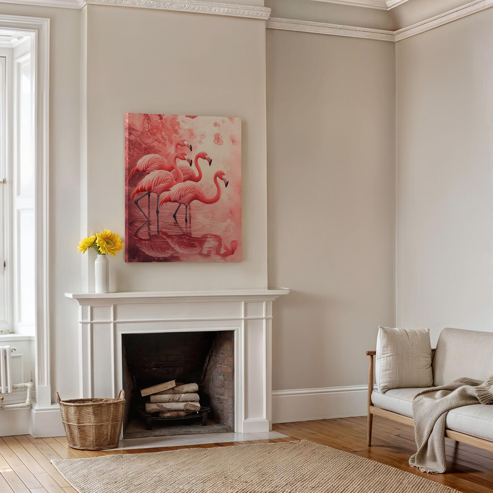 Terug naar collectie / Schilderijen / Bloemen Schilderij / Roze flamingo’s in bloemenwater