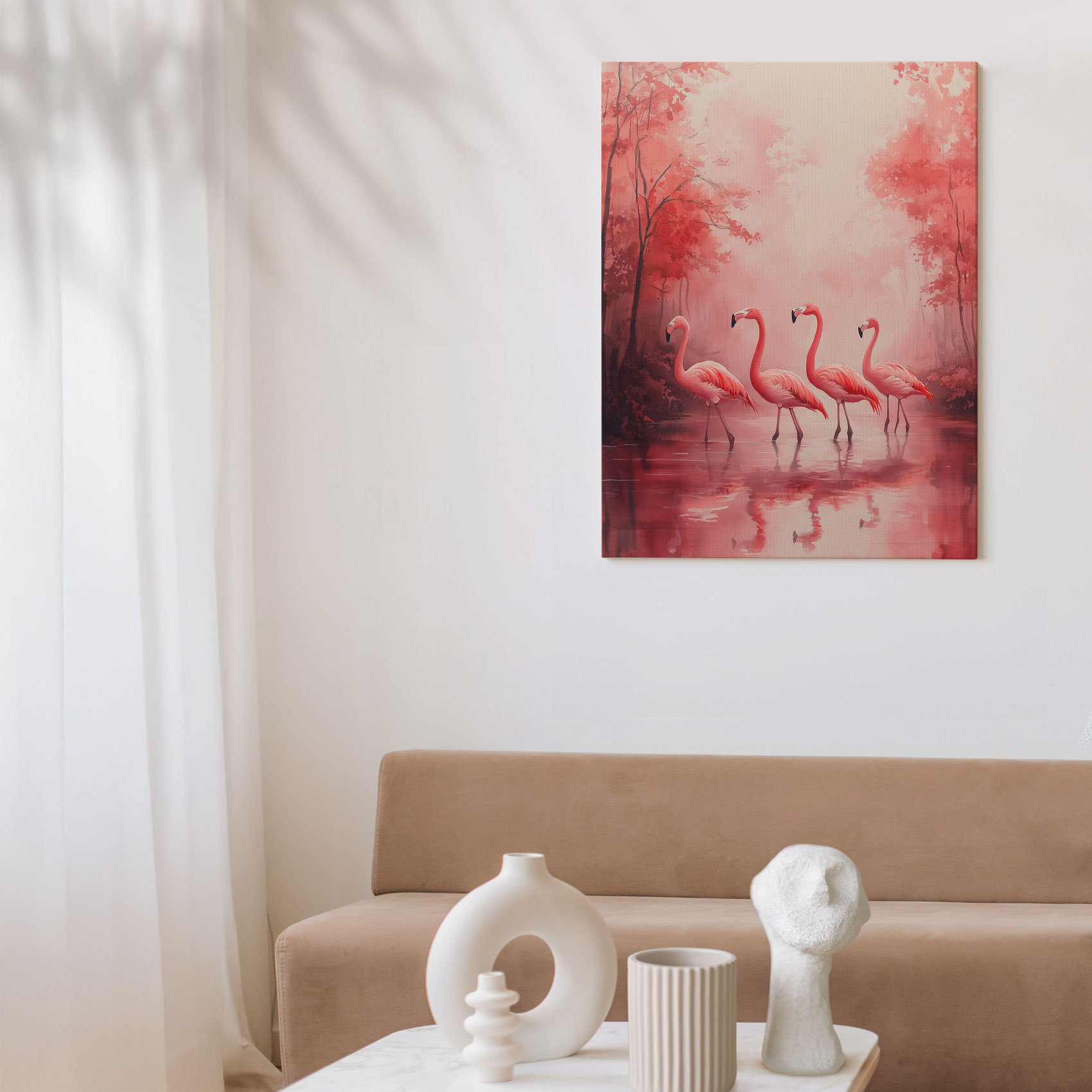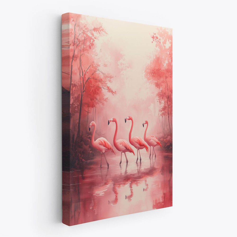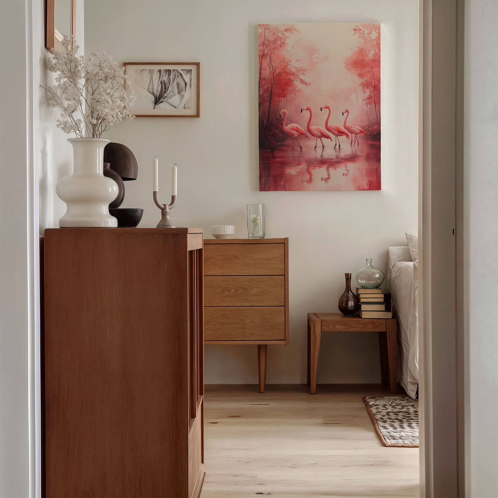 Terug naar collectie / Schilderijen / Bossen Schilderij / Roze flamingo’s in spiegelwater