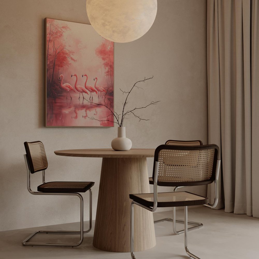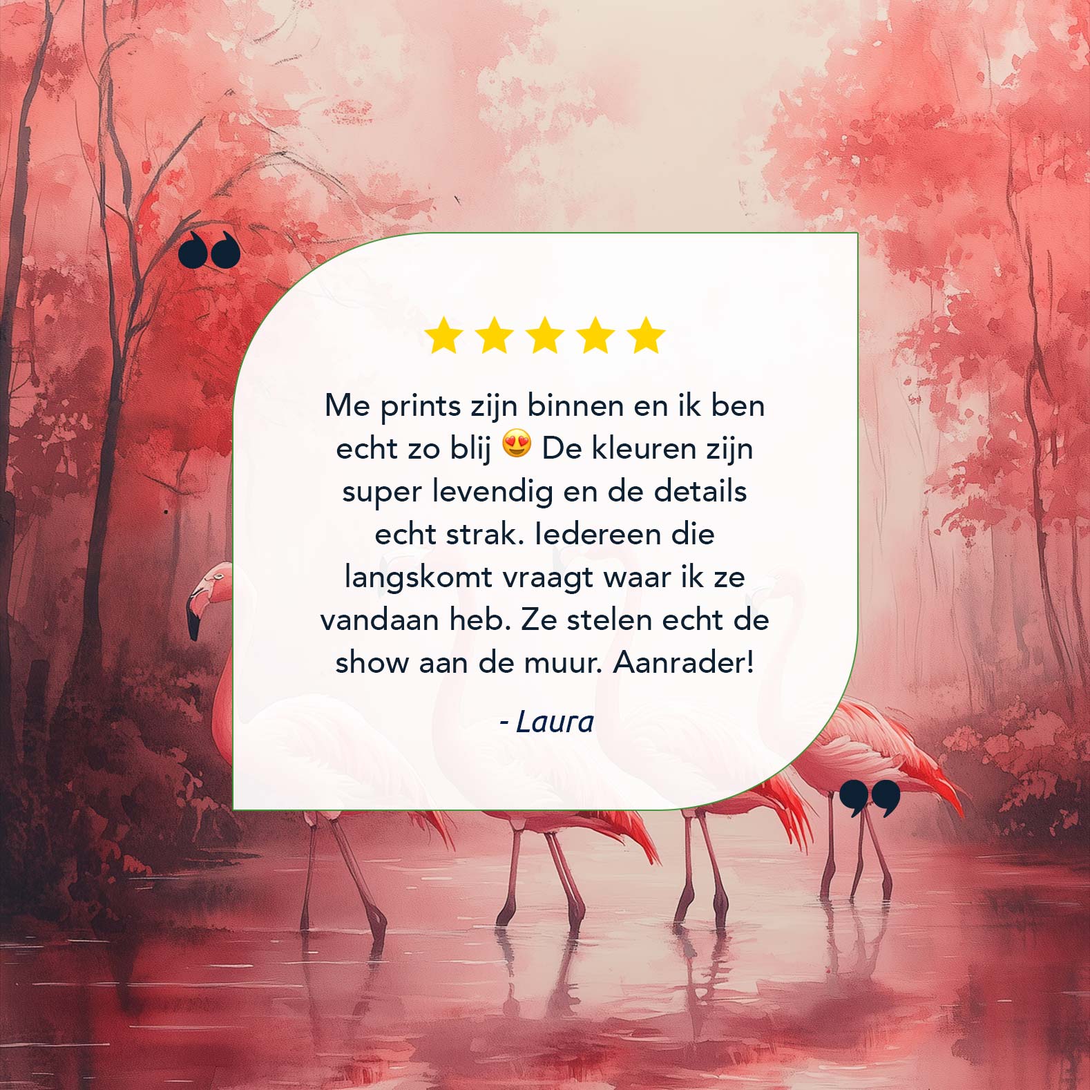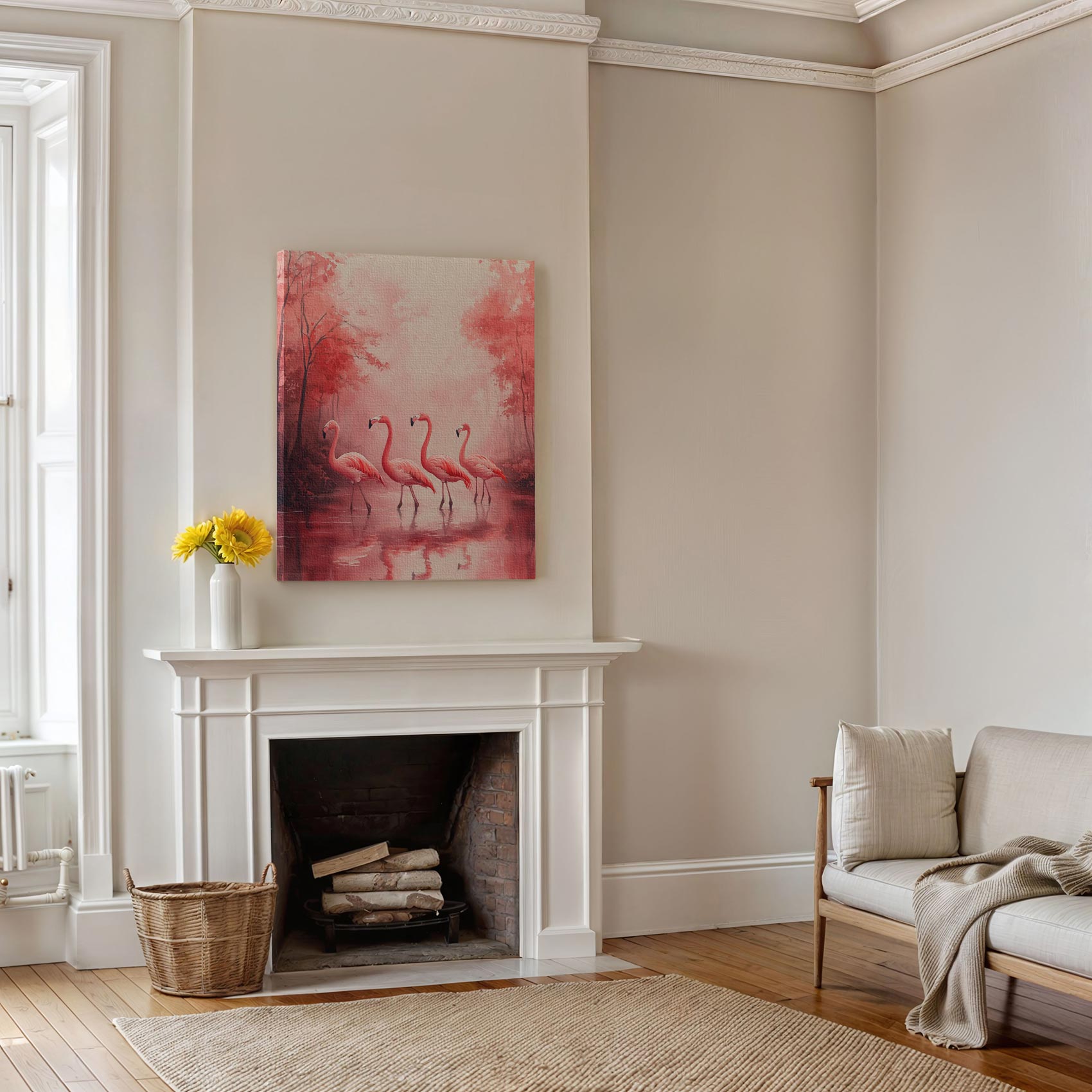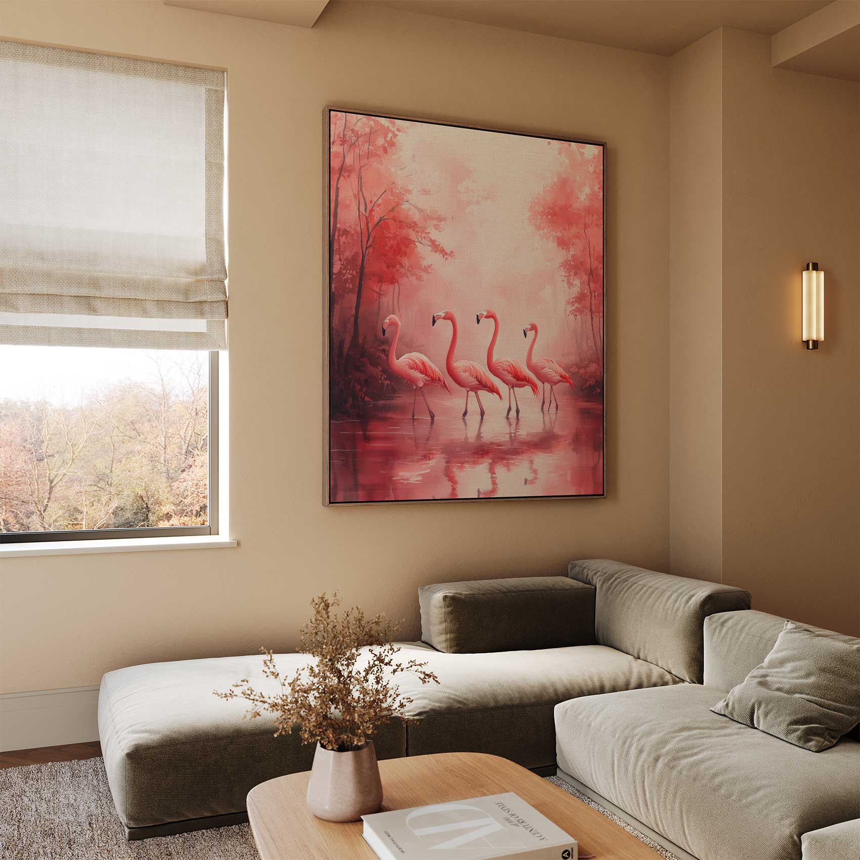 Terug naar collectie / Schilderijen / Bossen Schilderij / Roze flamingo’s in spiegelwater