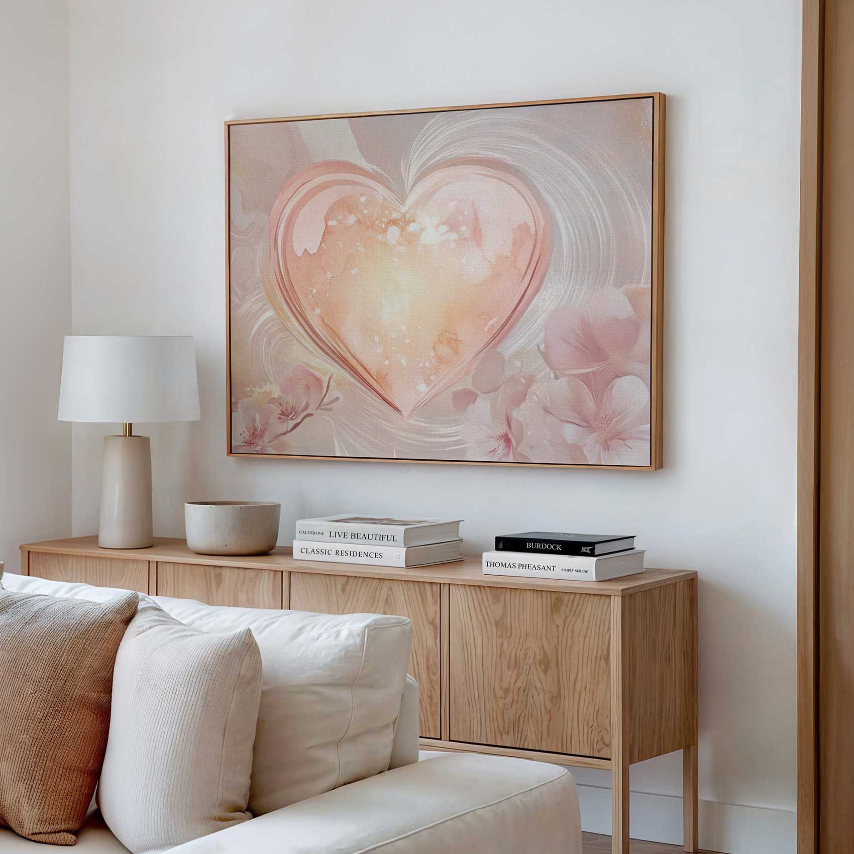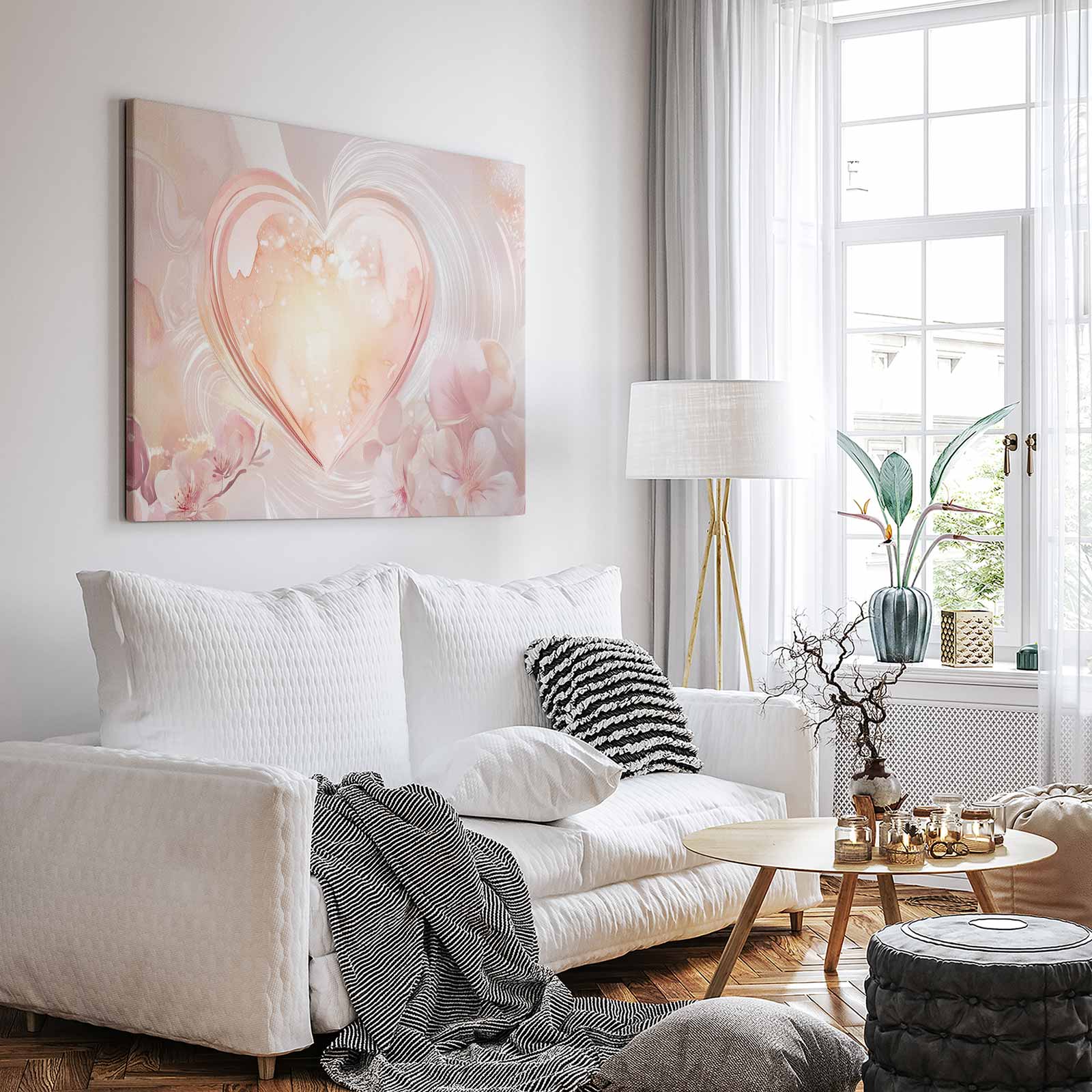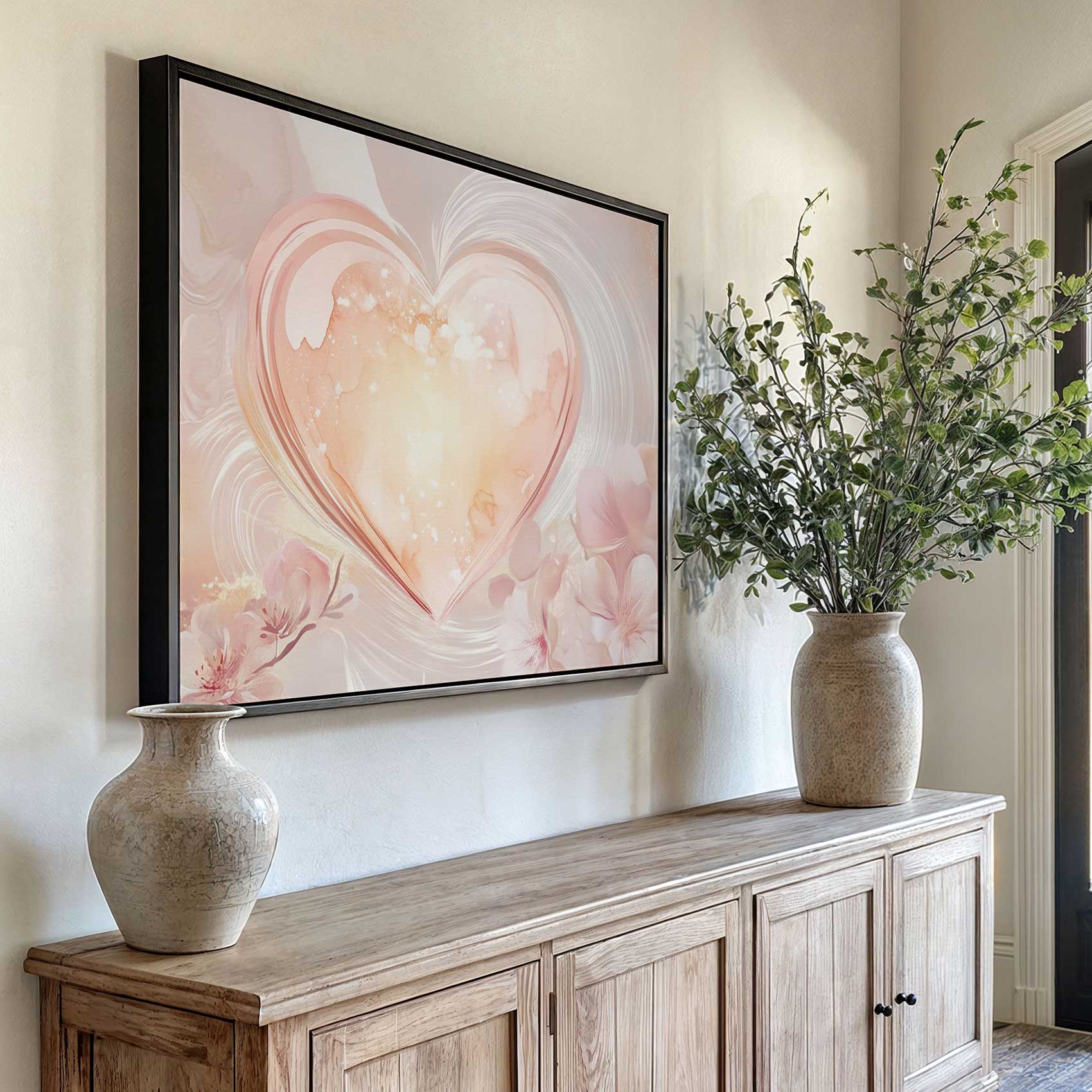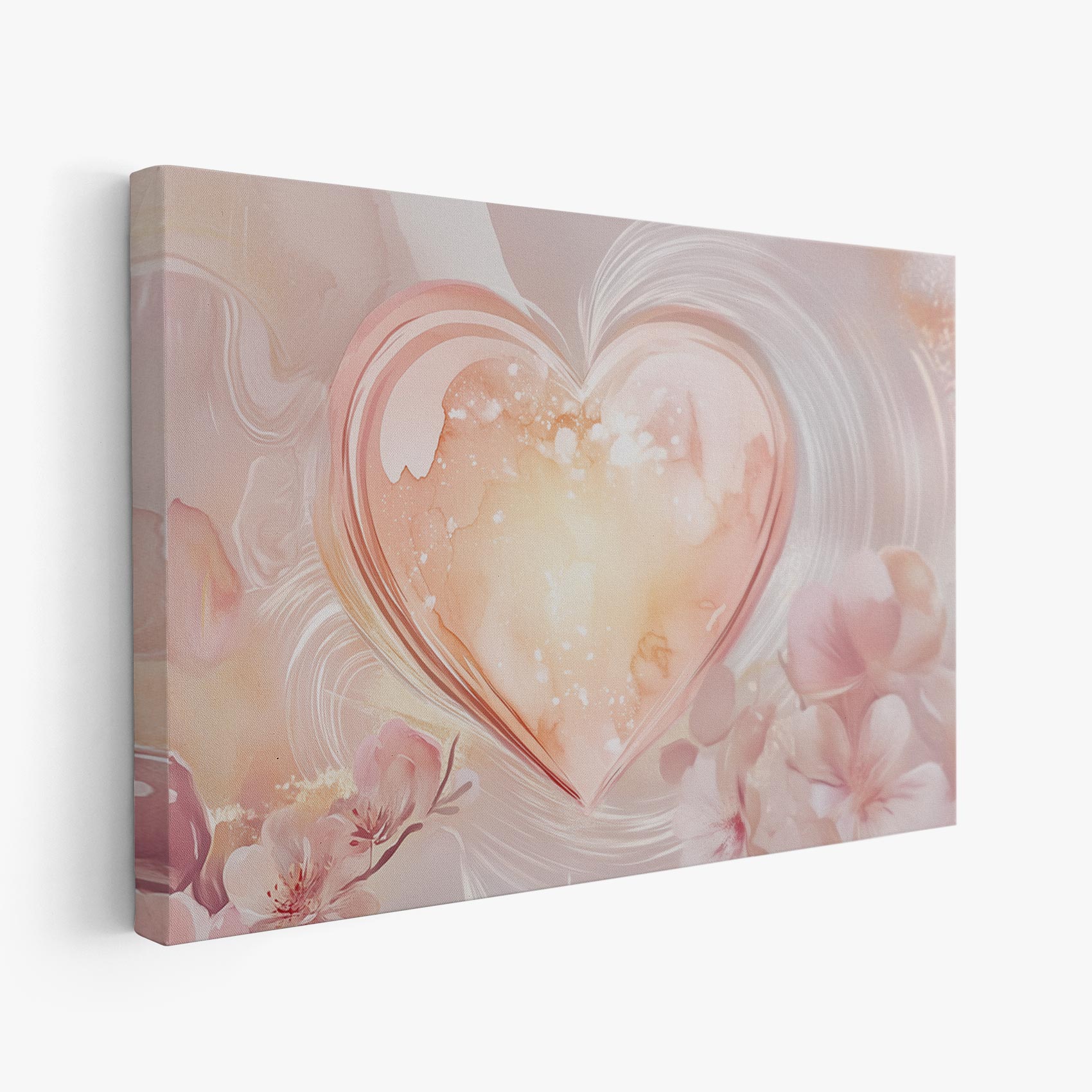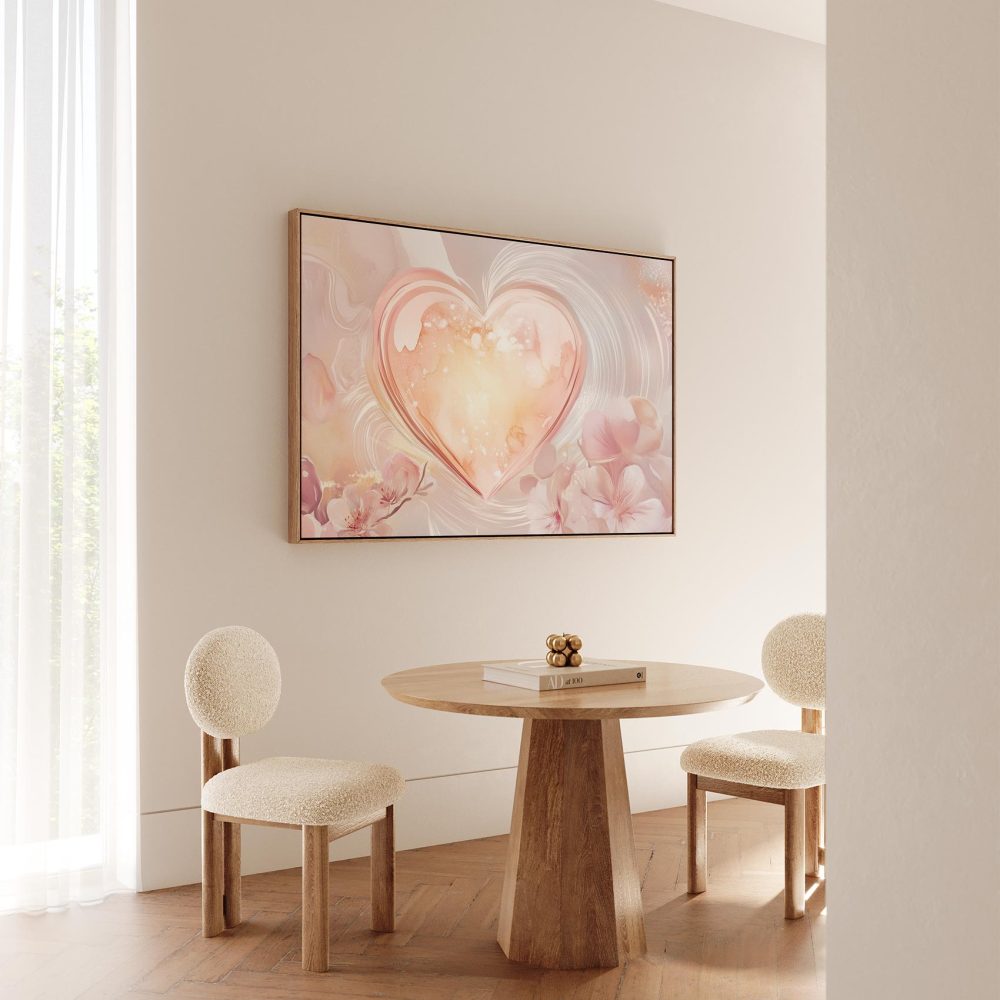 Terug naar collectie / Schilderijen / Bloemen Schilderij / Roze glazen hart met bloemen