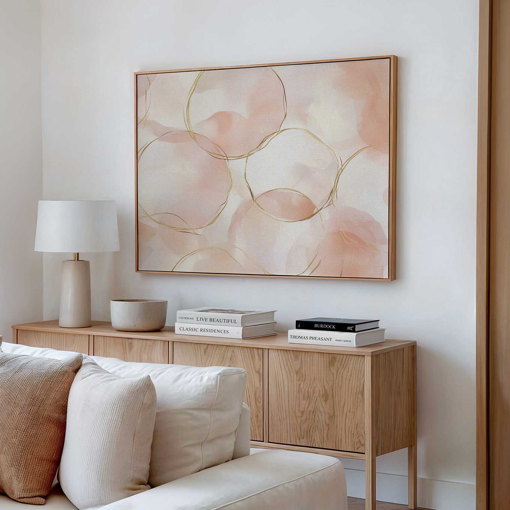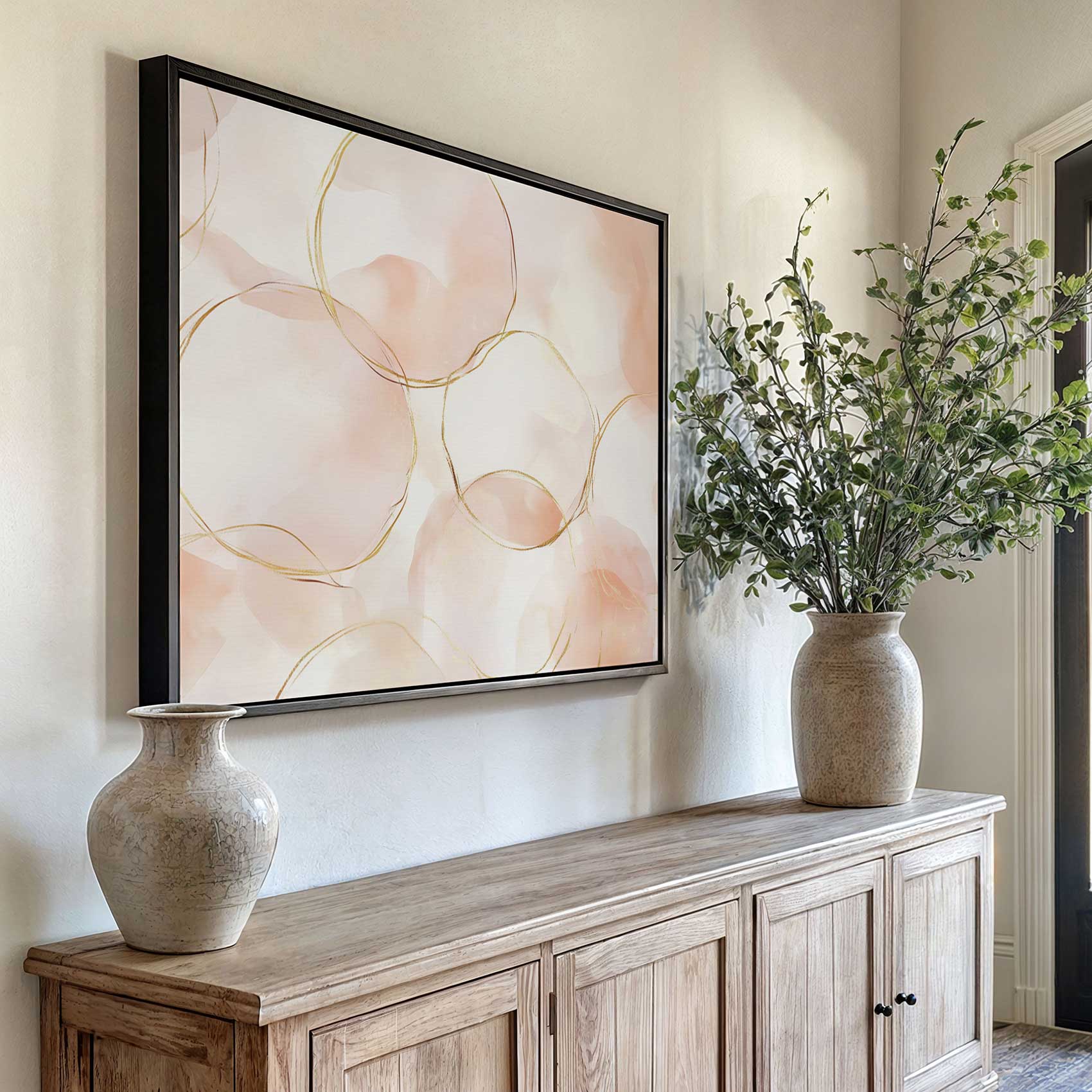 Terug naar collectie / Schilderijen / Abstract Schilderij / Roze-gouden abstracte cirkelpatroon
