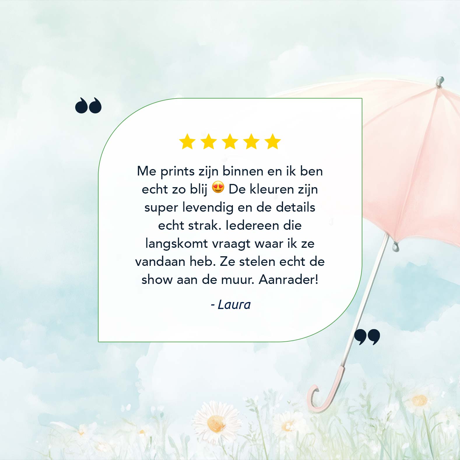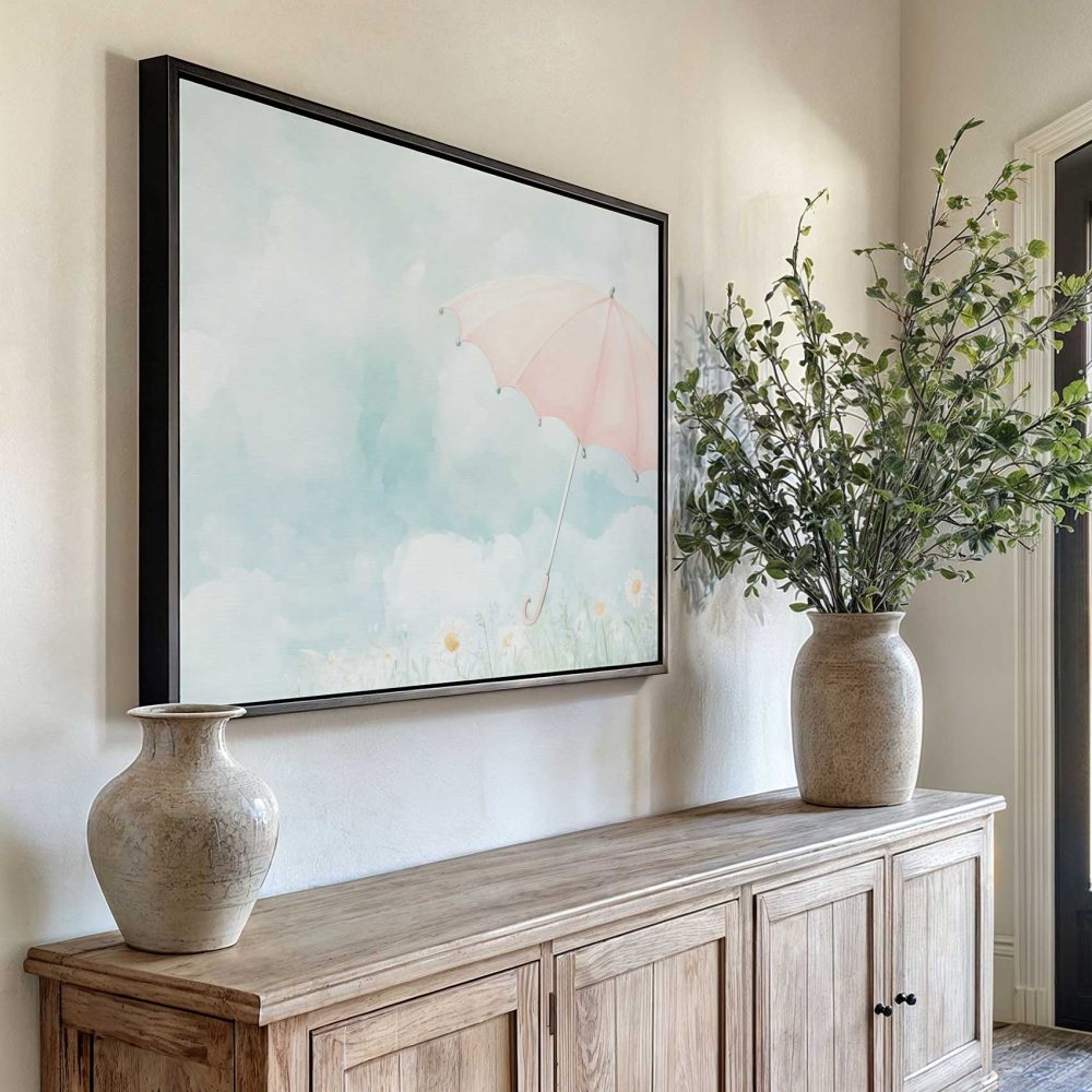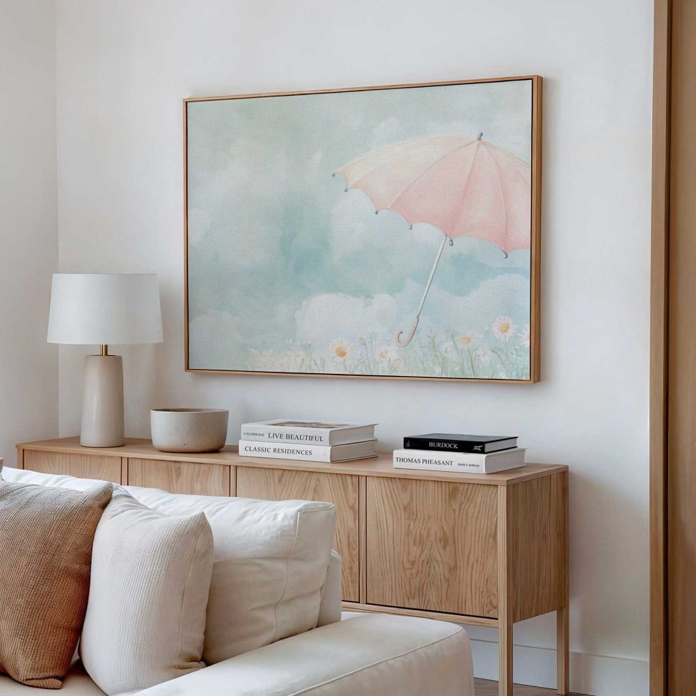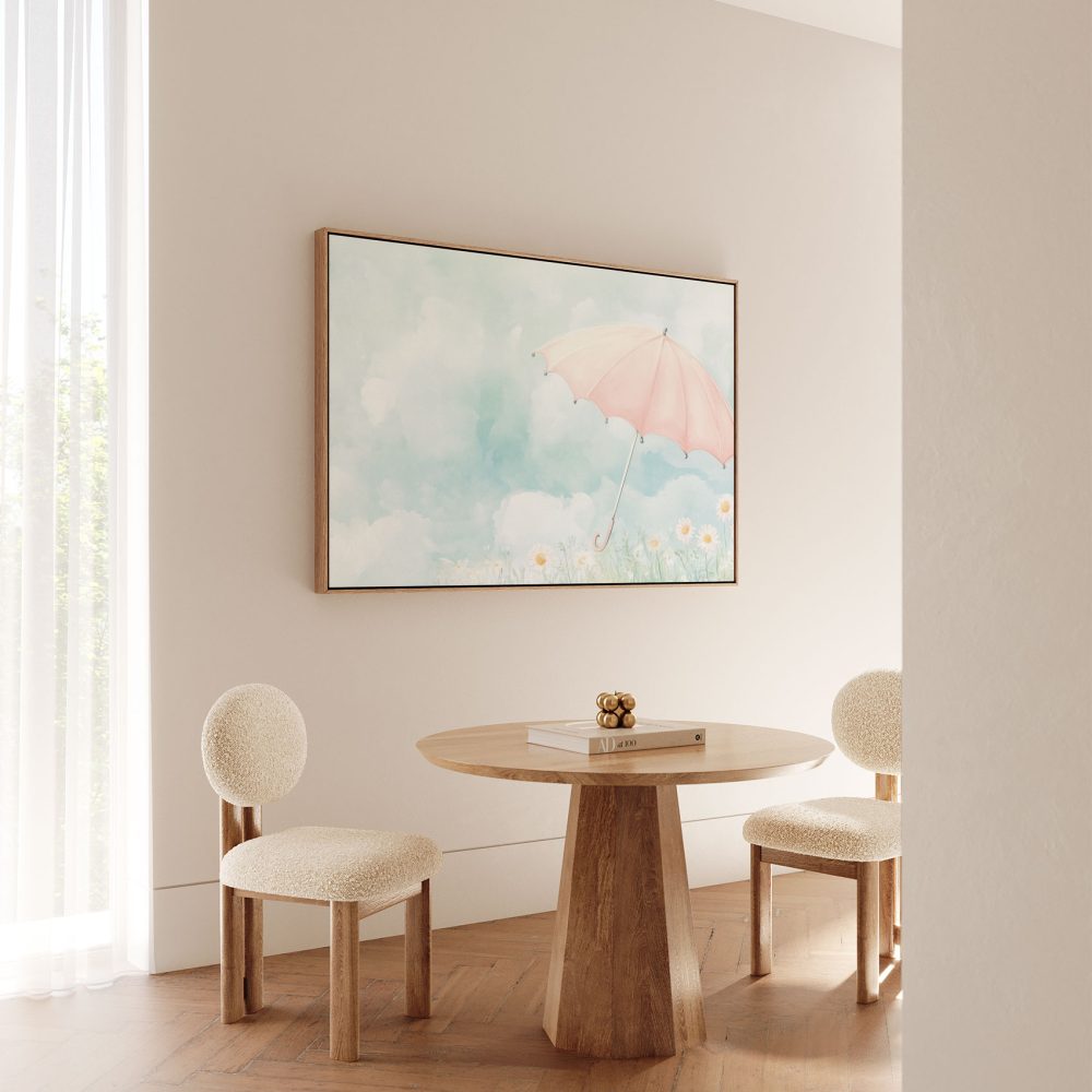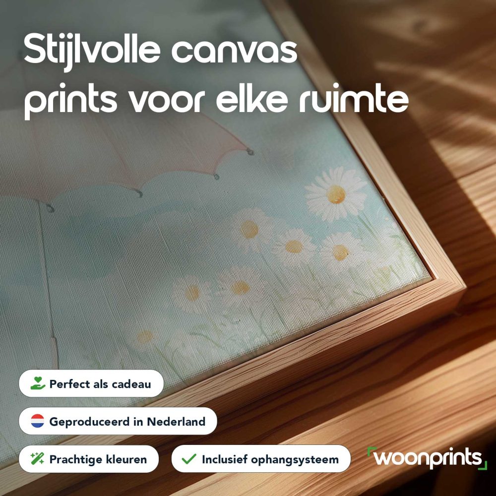 Terug naar collectie / Schilderijen / Bloemen Schilderij / Roze paraplu tussen madeliefjes