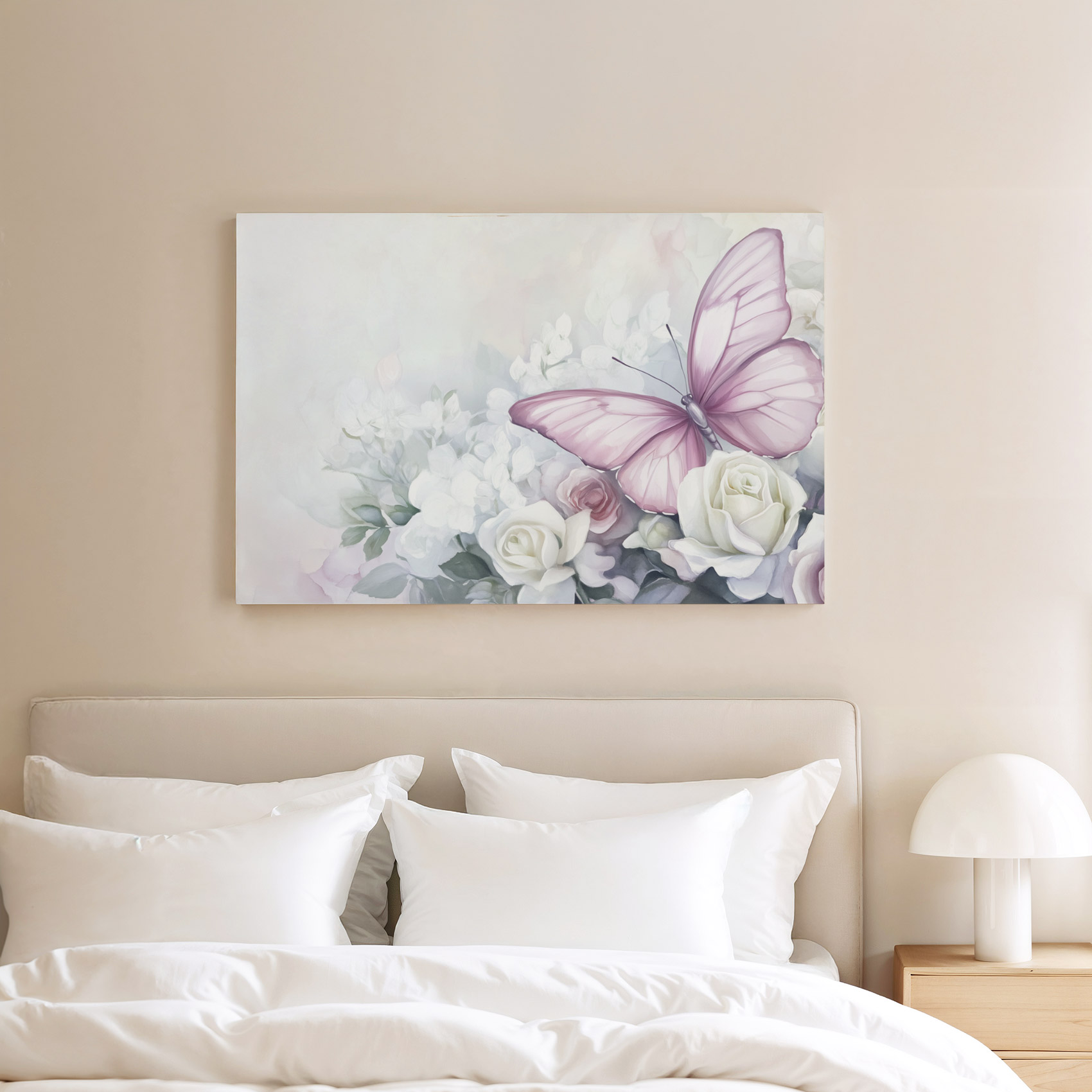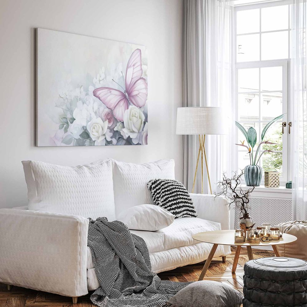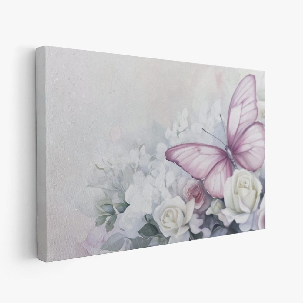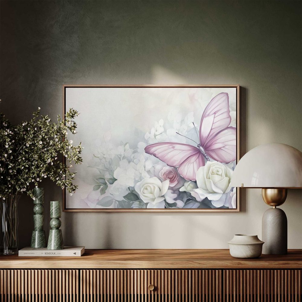 Terug naar collectie / Schilderijen / Bloemen Schilderij / Roze rozen met paarse vlinder