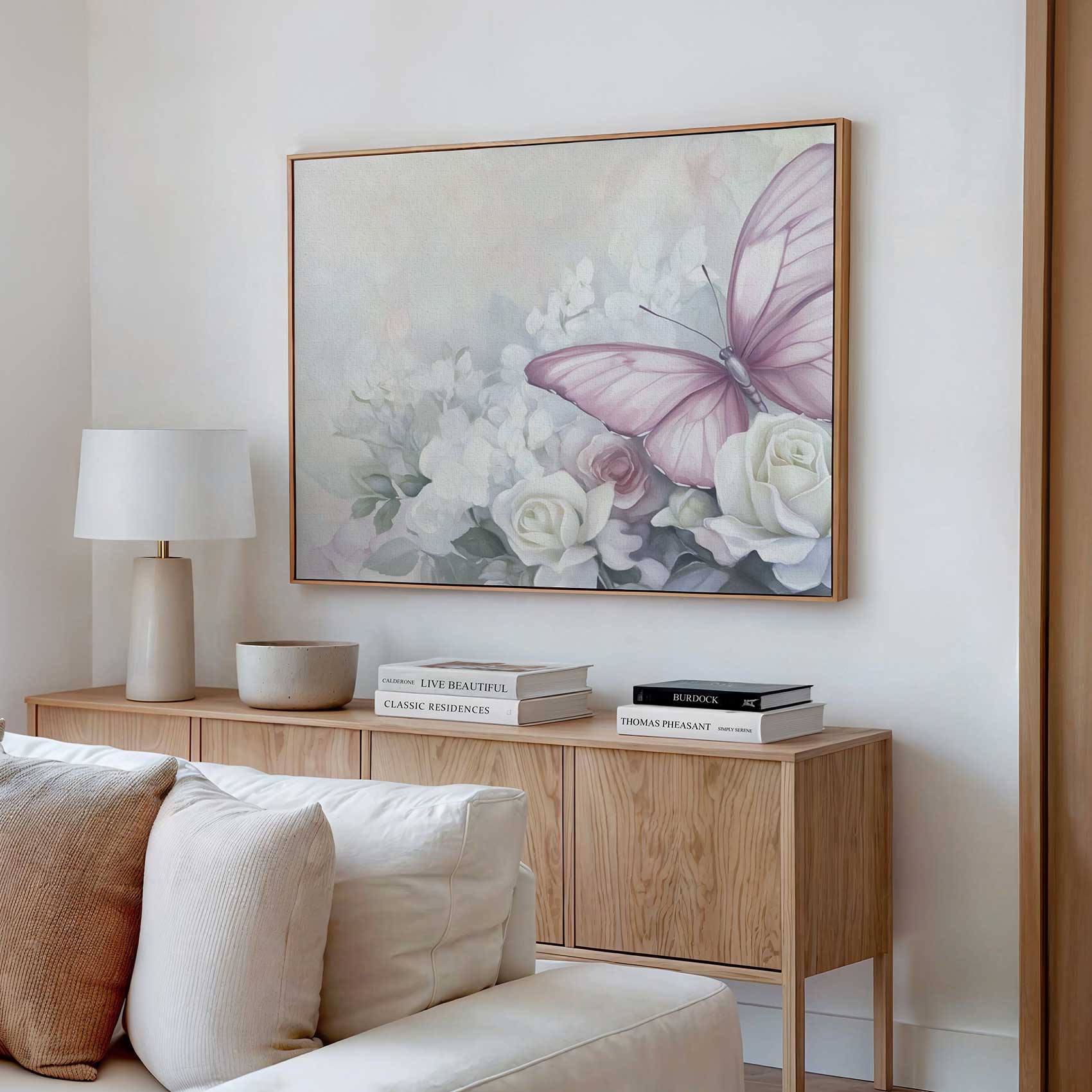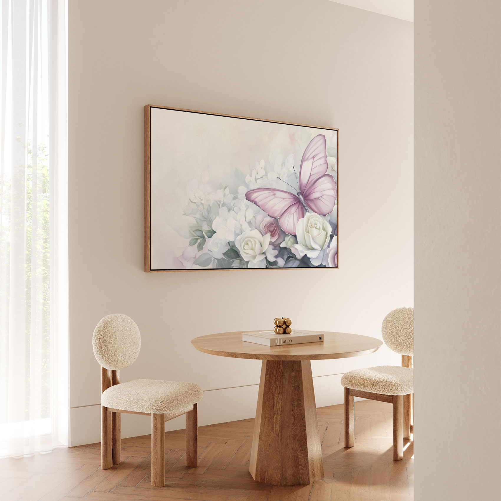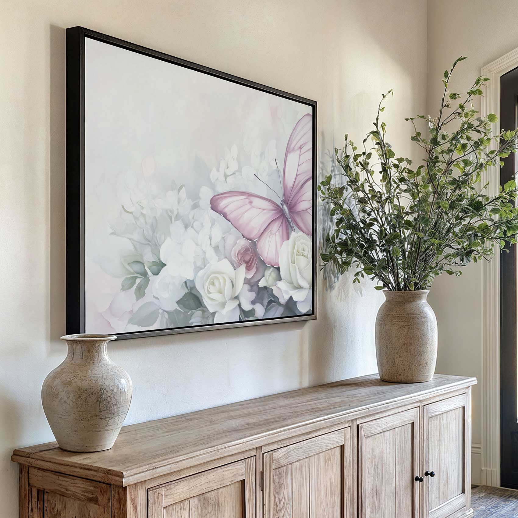 Terug naar collectie / Schilderijen / Bloemen Schilderij / Roze rozen met paarse vlinder