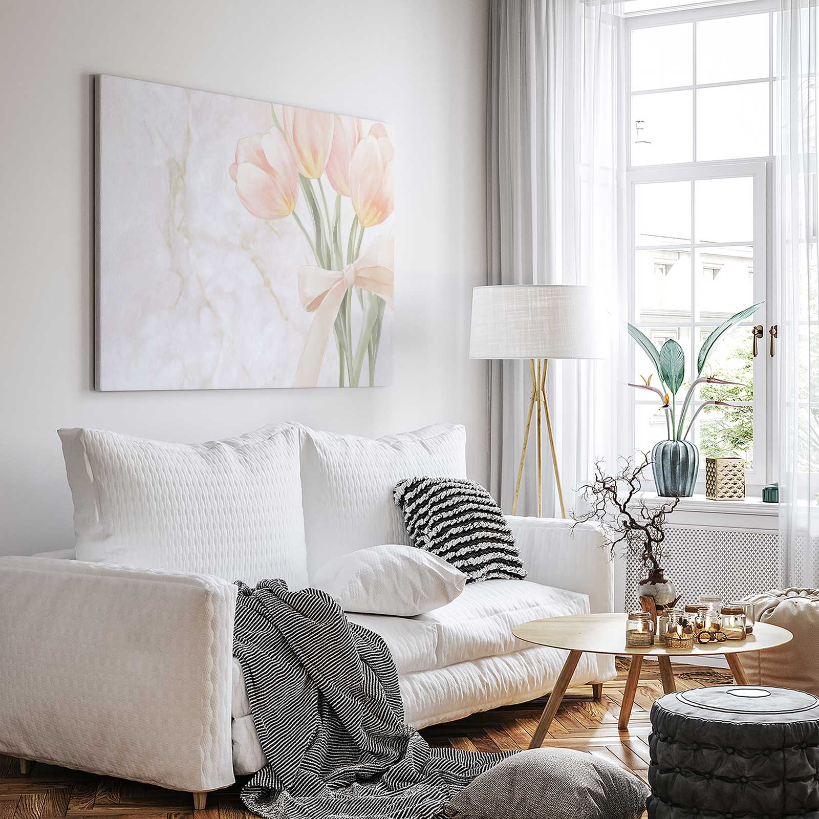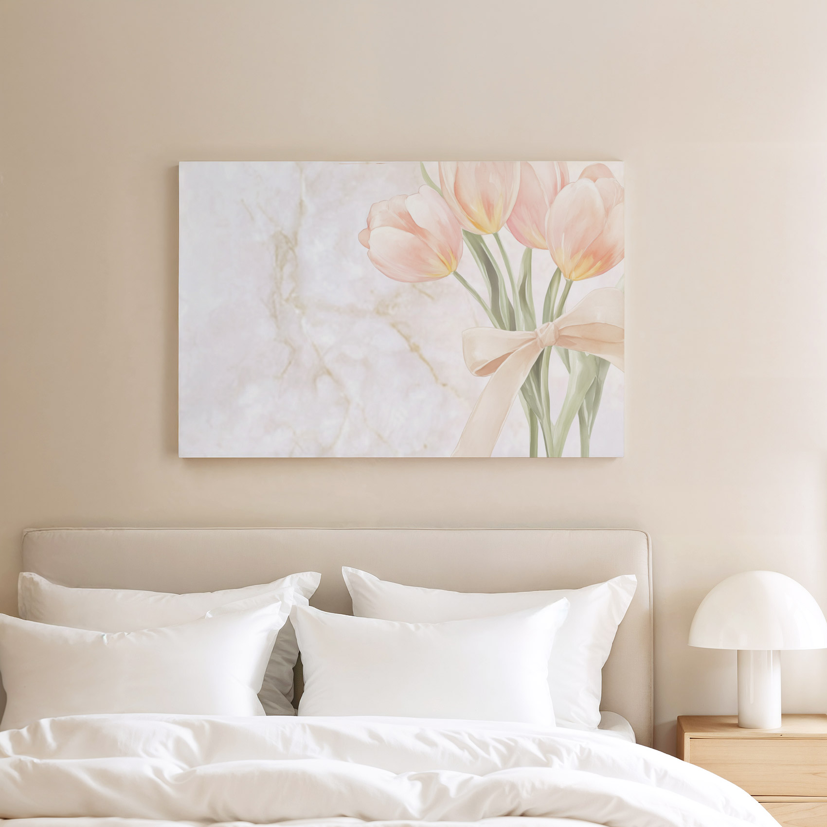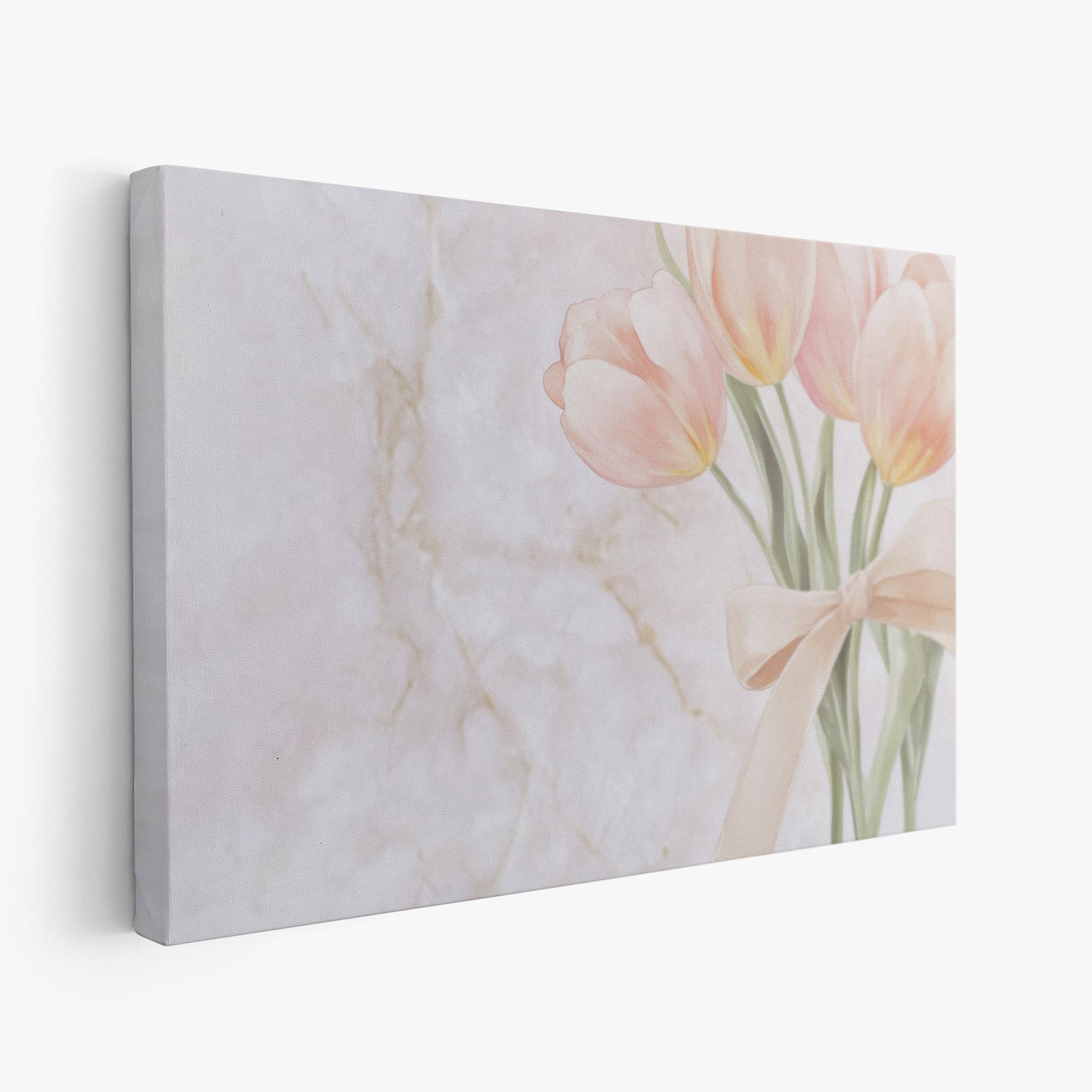 Terug naar collectie / Schilderijen / Bloemen Schilderij / Roze tulpenboeket met lint