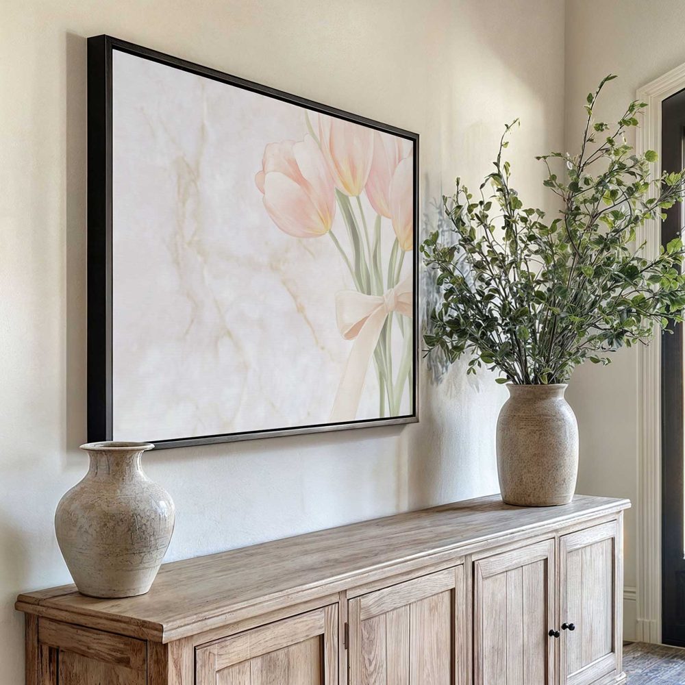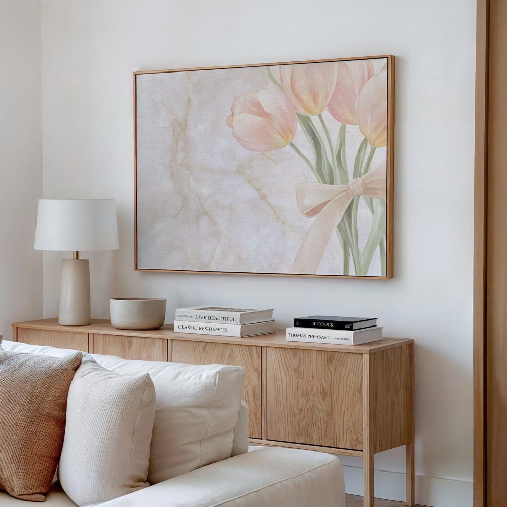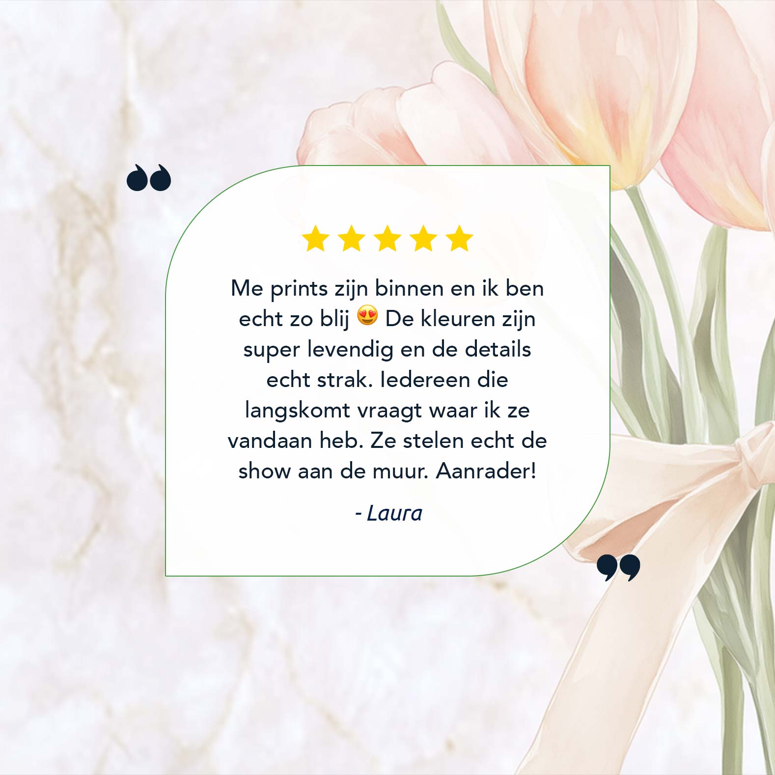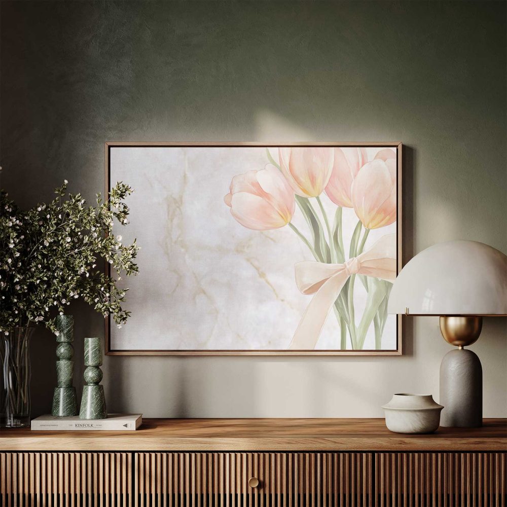 Terug naar collectie / Schilderijen / Bloemen Schilderij / Roze tulpenboeket met lint