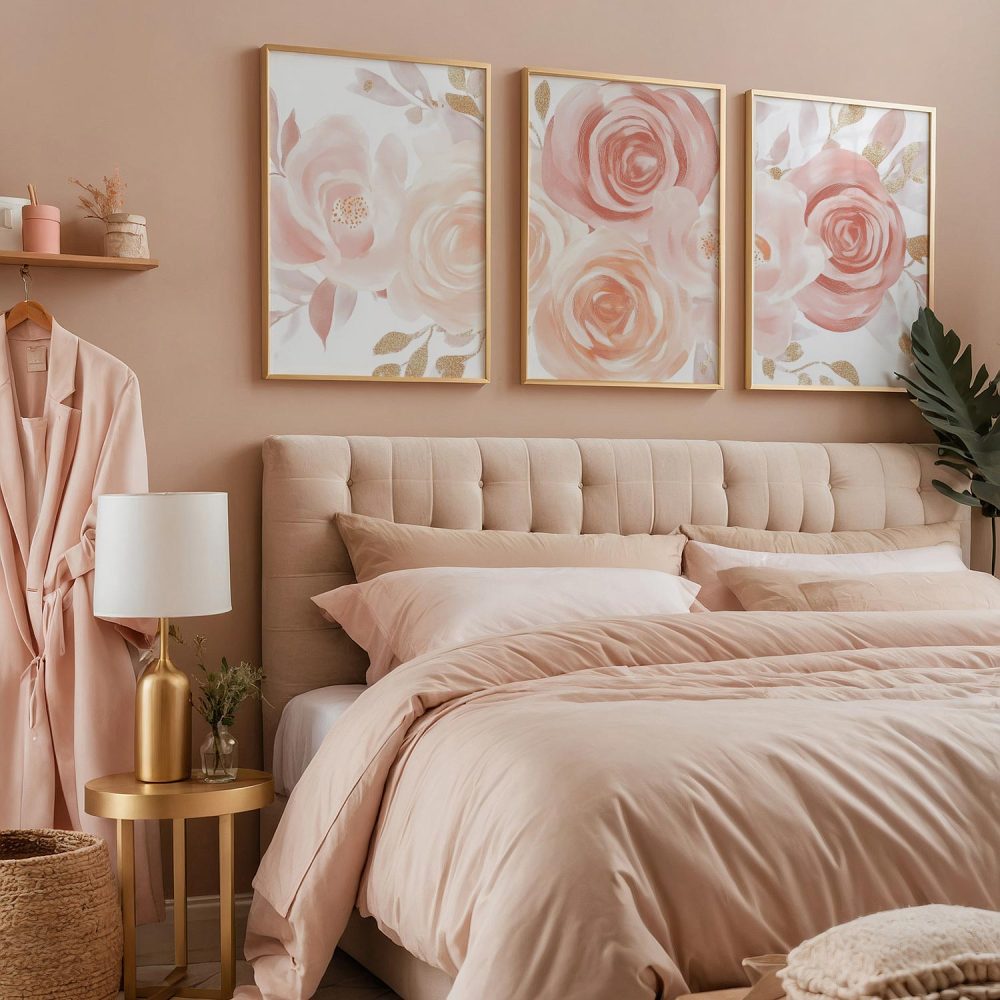 Roze & Witte Rozen met Gouden Accenten – Romantische Wanddecoratie