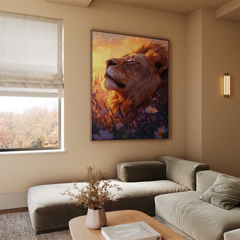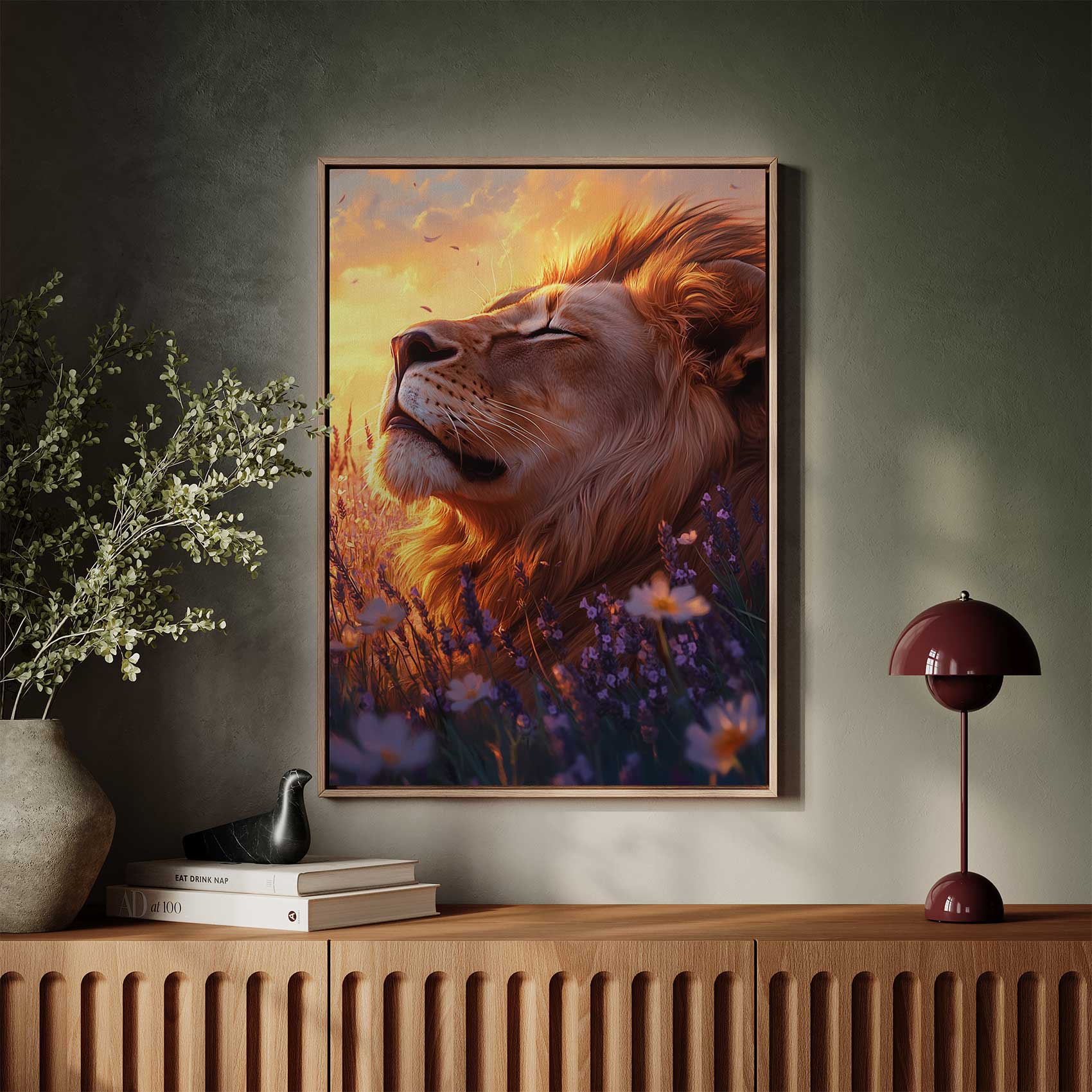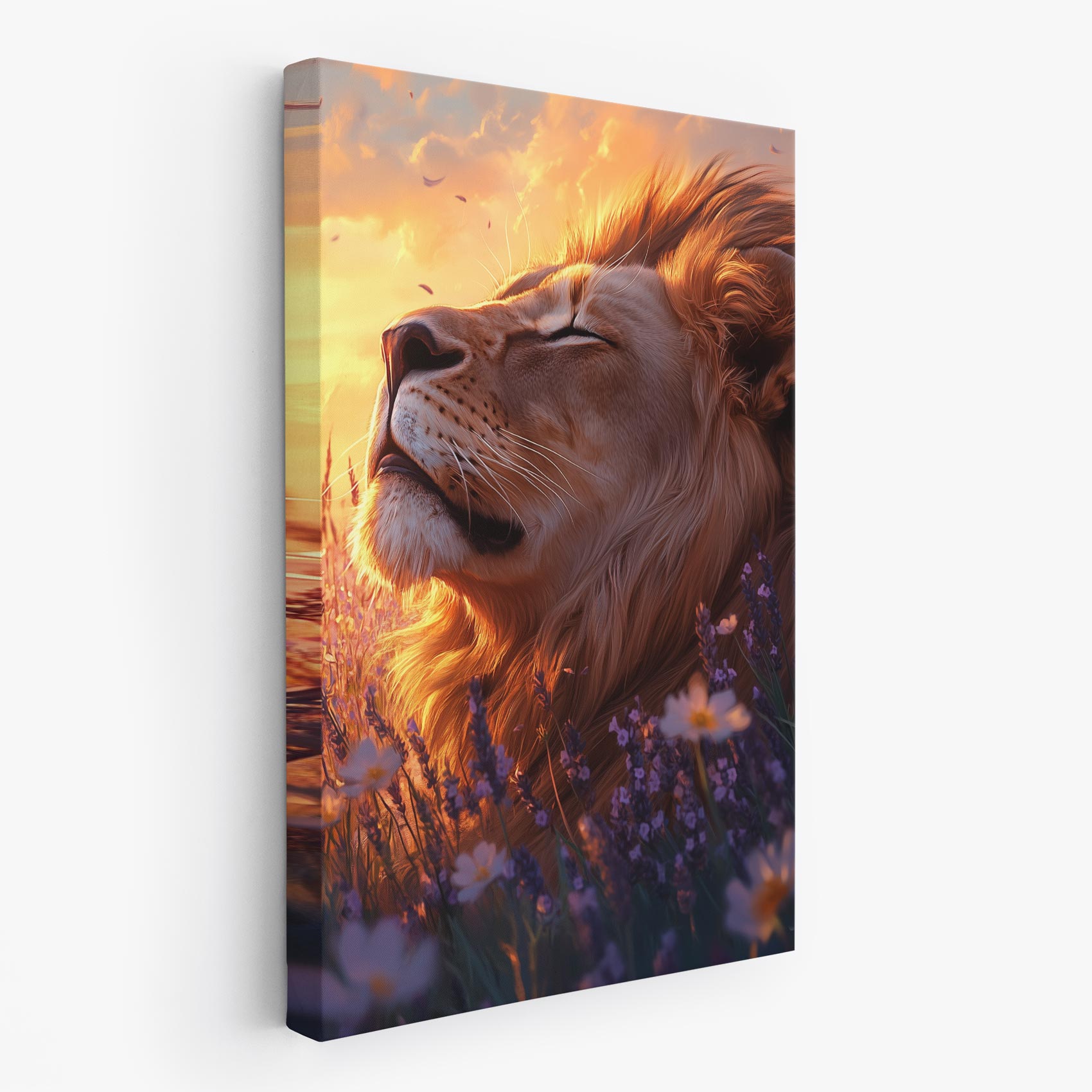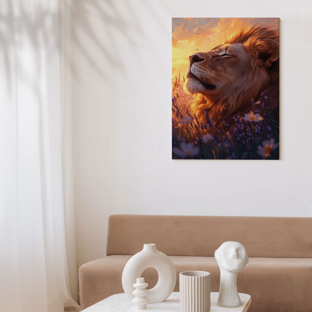 Terug naar collectie / Schilderijen / Bloemen Schilderij / Rustende leeuw in paarse bloemen
